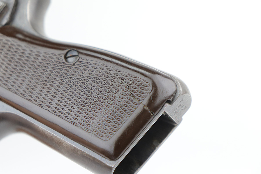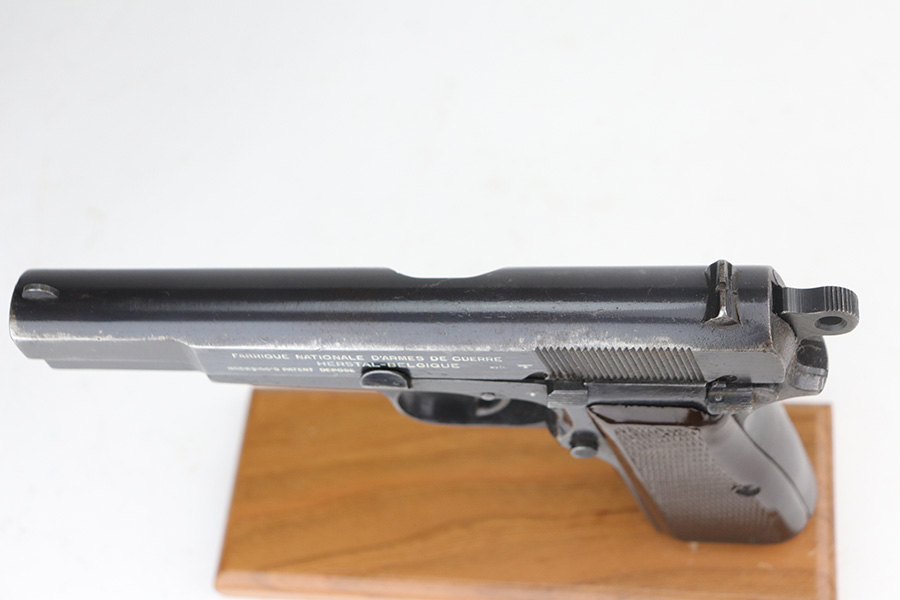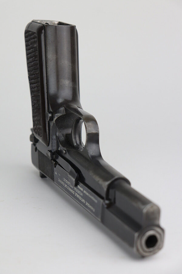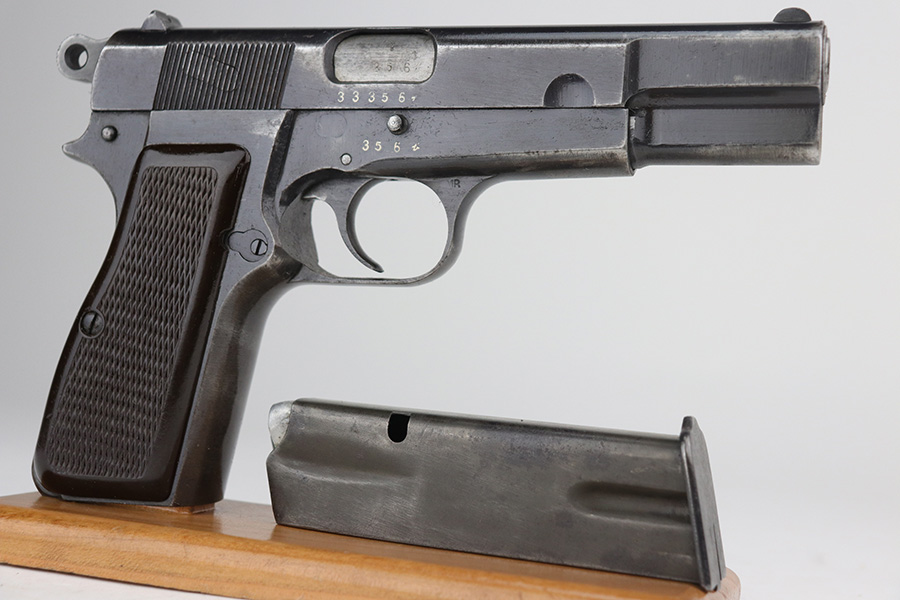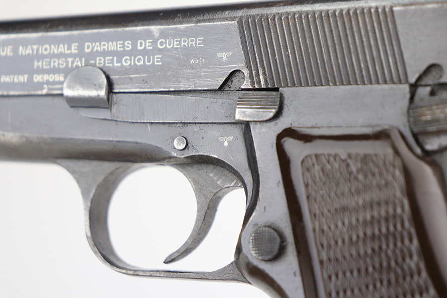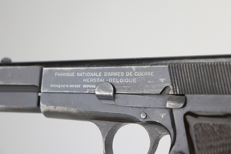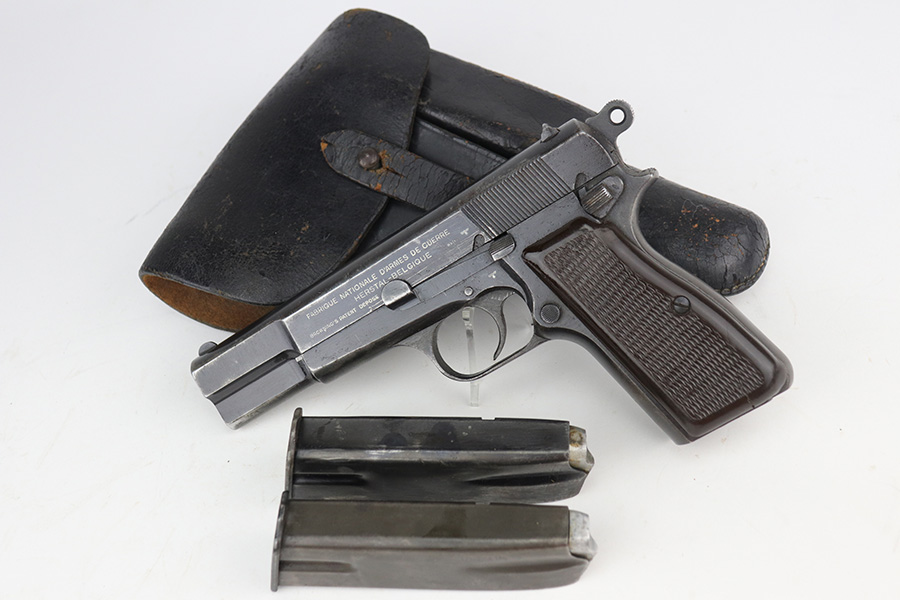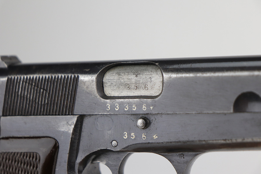 11/4/21 – This is a very nice example of an FN Browning Hi Power issued to the Nazi military during WW2. The gun is all matching and has the proper “Waffen 140” Nazi military acceptance proofs throughout. It comes as a rig with two period-correct magazines (one is waffen-proofed, the other is not) and a 1942-dated waffen-proofed holster. The holster has surface cracking in the leather throughout. The gun has retained roughly 85% of its original finish. There is thinning, some light spotty oxidation, and brown patina on both grip straps. Generally, there is minor, some spotty wear around the high edges of the slide, around the muzzle, and on the front edges of the frame. It comes with nice period-correct brown bakelite grips – the left grip panel has a hairline crack. The bore is mint.