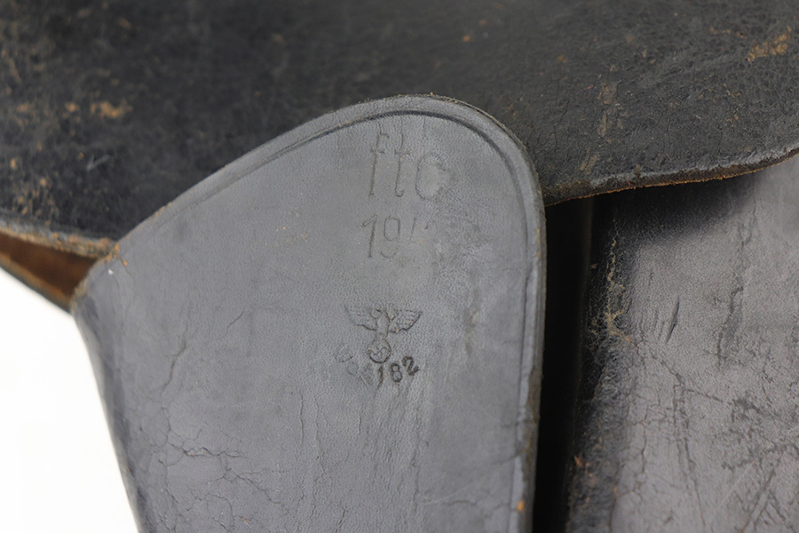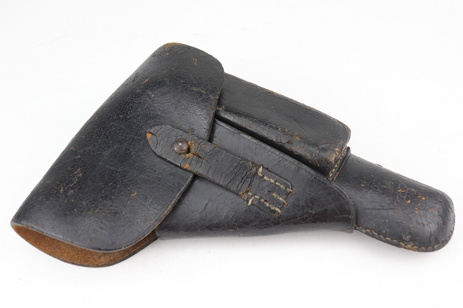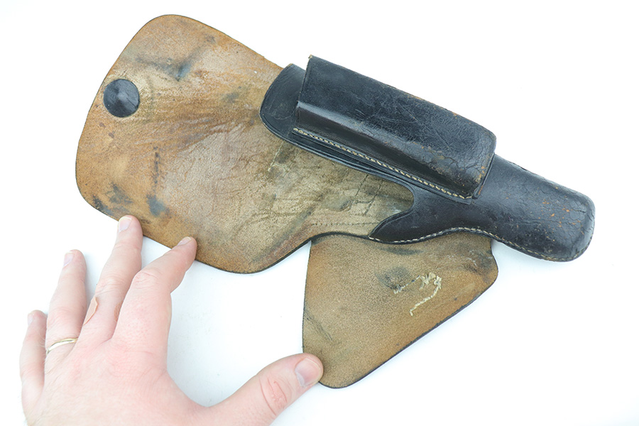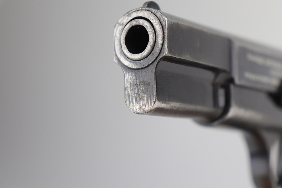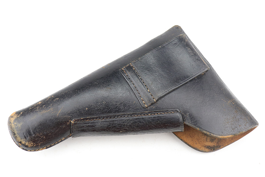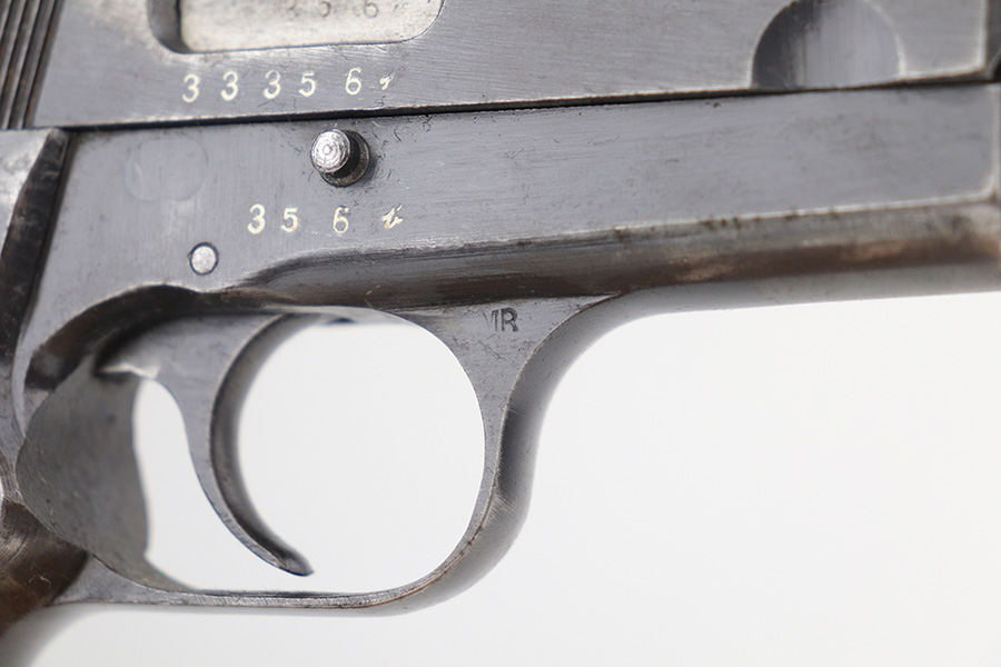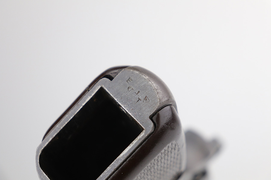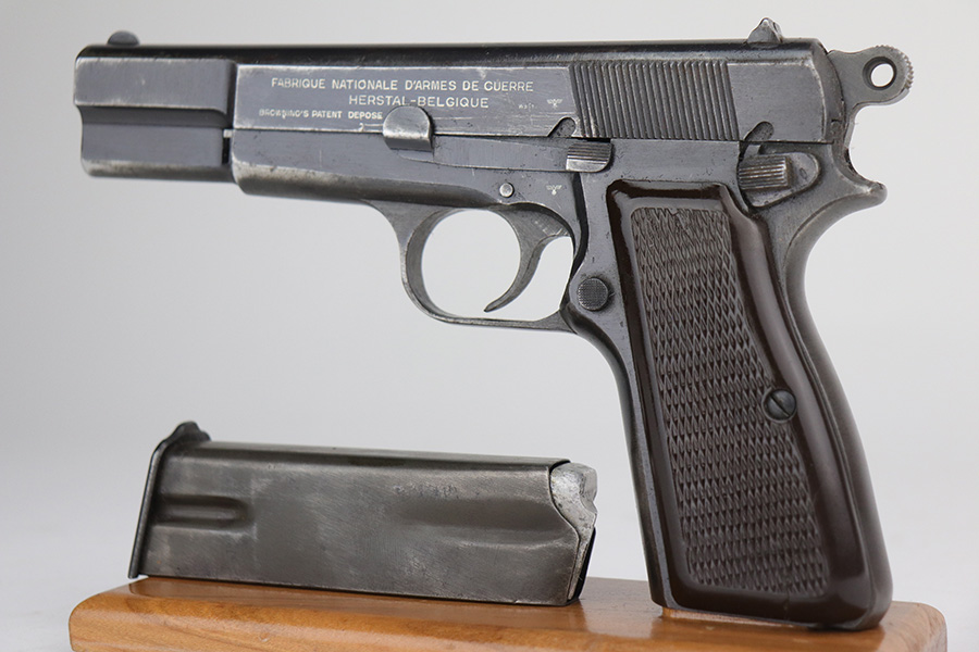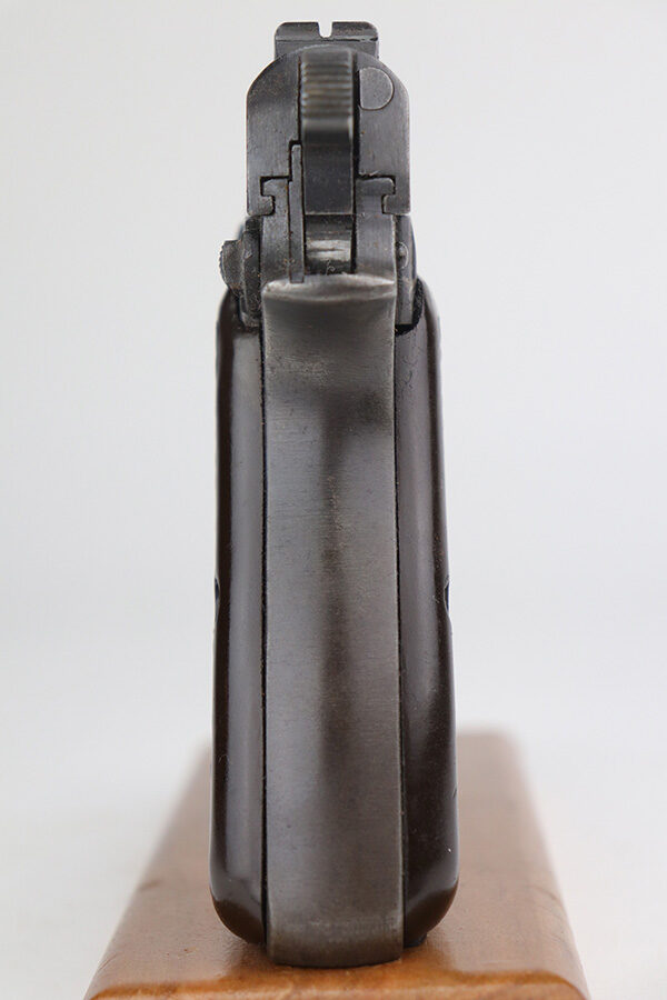 11/4/21 – This is a very nice example of an FN Browning Hi Power issued to the Nazi military during WW2. The gun is all matching and has the proper “Waffen 140” Nazi military acceptance proofs throughout. It comes as a rig with two period-correct magazines (one is waffen-proofed, the other is not) and a 1942-dated waffen-proofed holster. The holster has surface cracking in the leather throughout. The gun has retained roughly 85% of its original finish. There is thinning, some light spotty oxidation, and brown patina on both grip straps. Generally, there is minor, some spotty wear around the high edges of the slide, around the muzzle, and on the front edges of the frame. It comes with nice period-correct brown bakelite grips – the left grip panel has a hairline crack. The bore is mint.