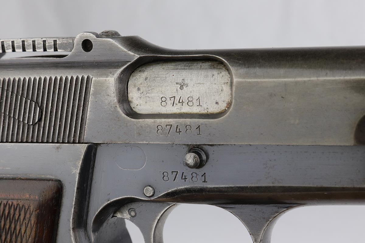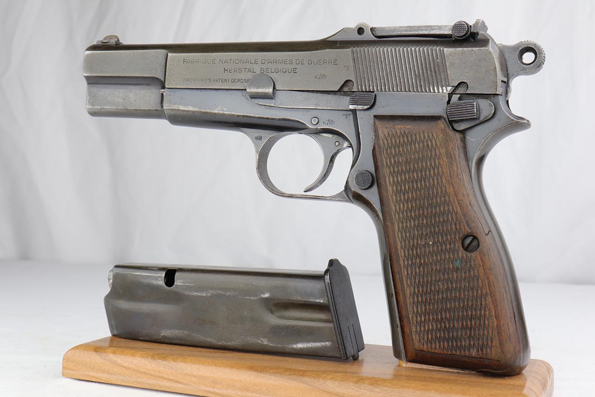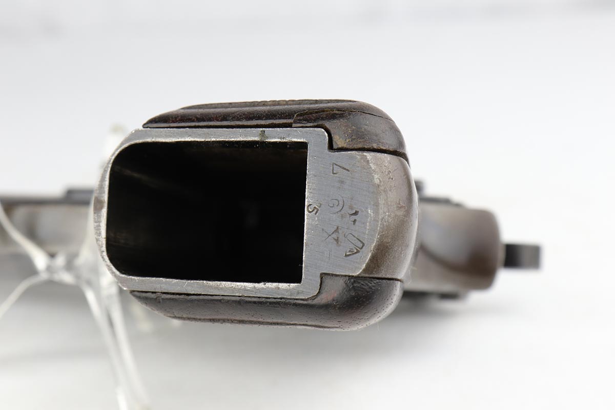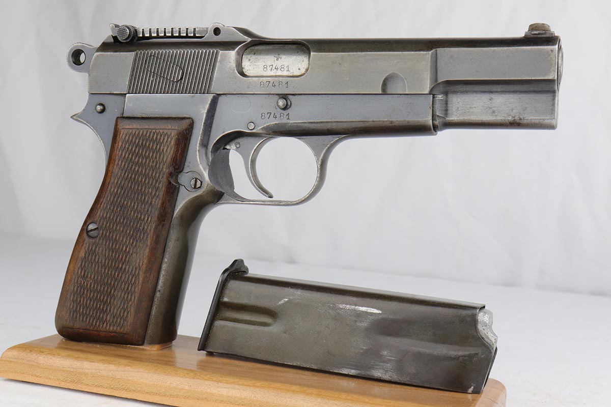 3/21/19 – This is an early Browning Hi Power with tangent sight and scarce WaA103 proofs on frame and slide. The pistol is Nazi issued and fully original and matching with correct and matching proof marked magazine. The bluing rates at about 70% with the pistol showing patina and thinning throughout, especially on the slide and front strap. Grips are in good condition, though the left panel does have a crack. The bore has strong rifling but does show some frost and freckling throughout. The pistol comes with a worn but original holster with internal waffenamt and ’44 date.