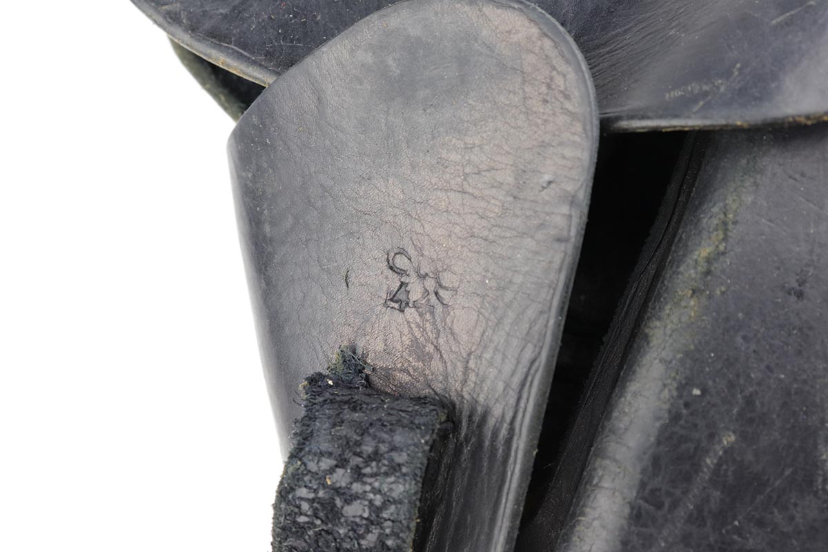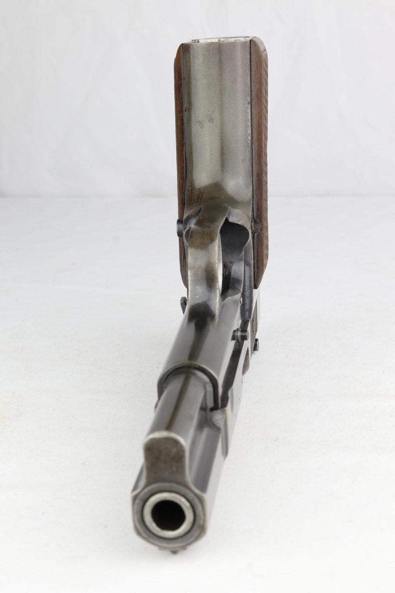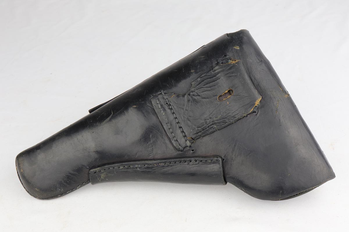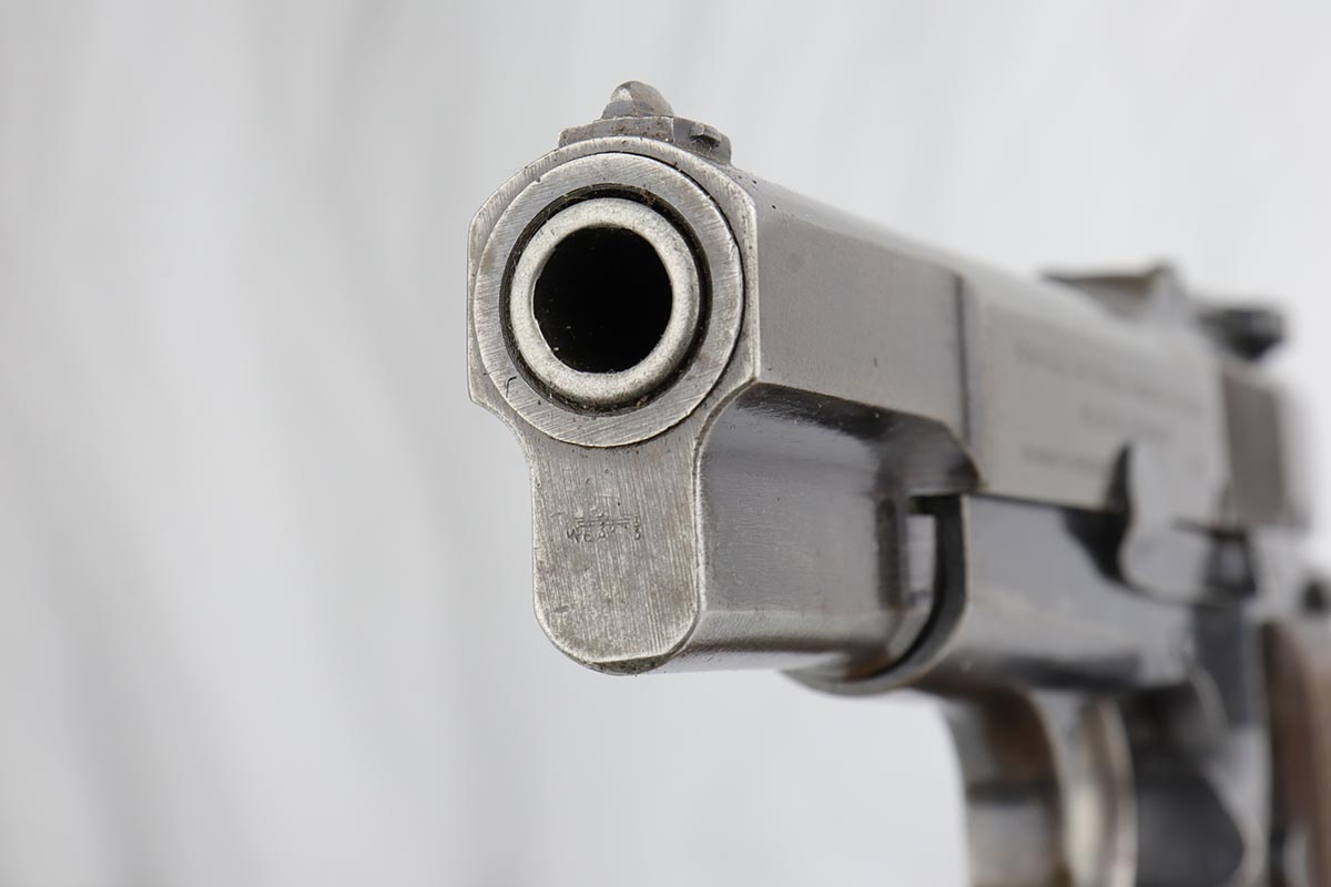 3/21/19 – This is an early Browning Hi Power with tangent sight and scarce WaA103 proofs on frame and slide. The pistol is Nazi issued and fully original and matching with correct and matching proof marked magazine. The bluing rates at about 70% with the pistol showing patina and thinning throughout, especially on the slide and front strap. Grips are in good condition, though the left panel does have a crack. The bore has strong rifling but does show some frost and freckling throughout. The pistol comes with a worn but original holster with internal waffenamt and ’44 date.