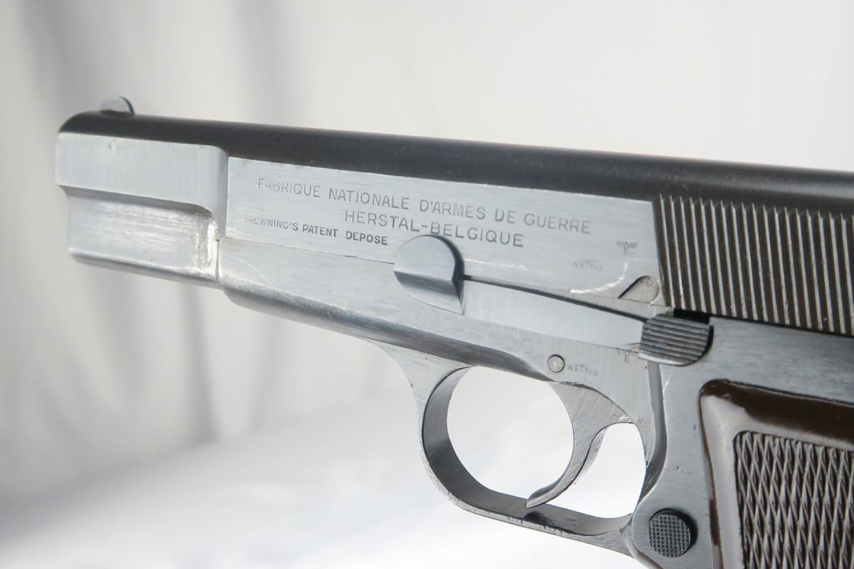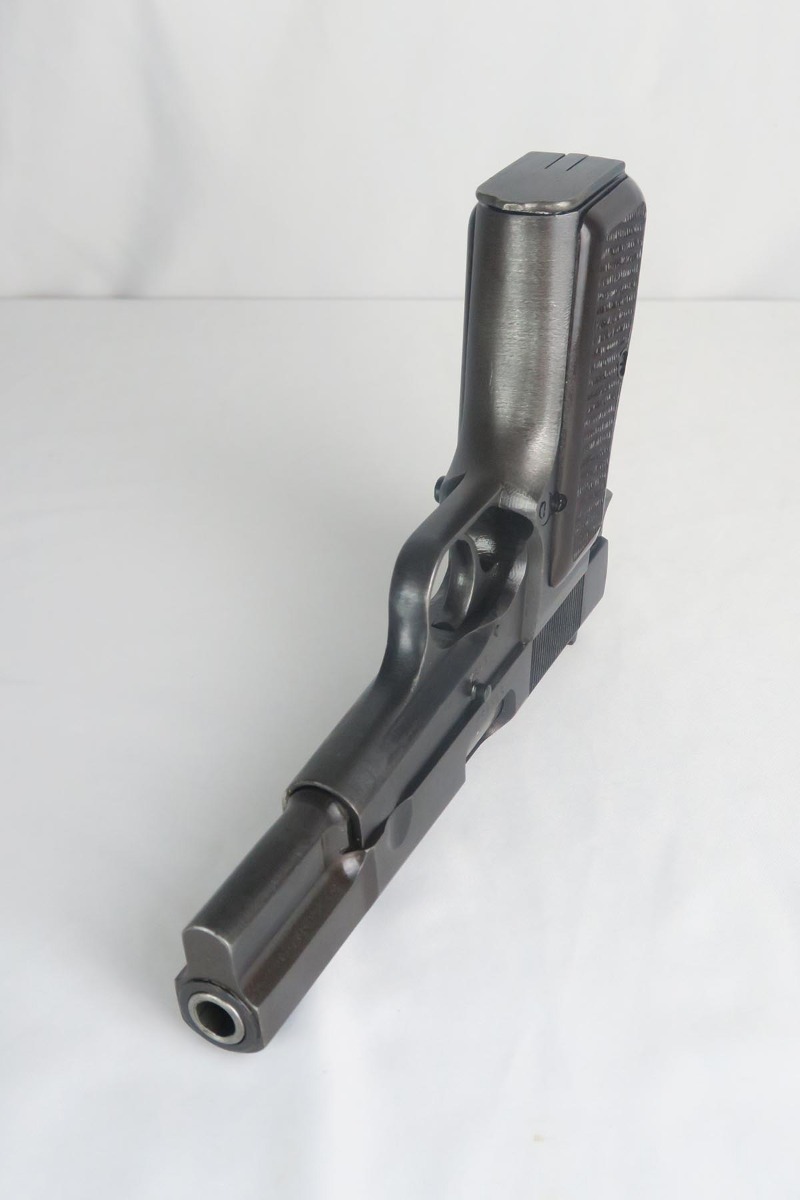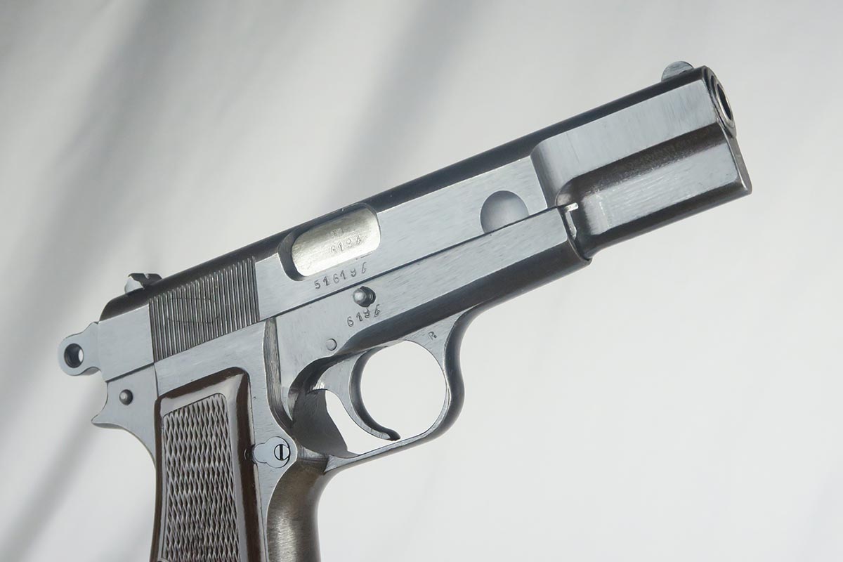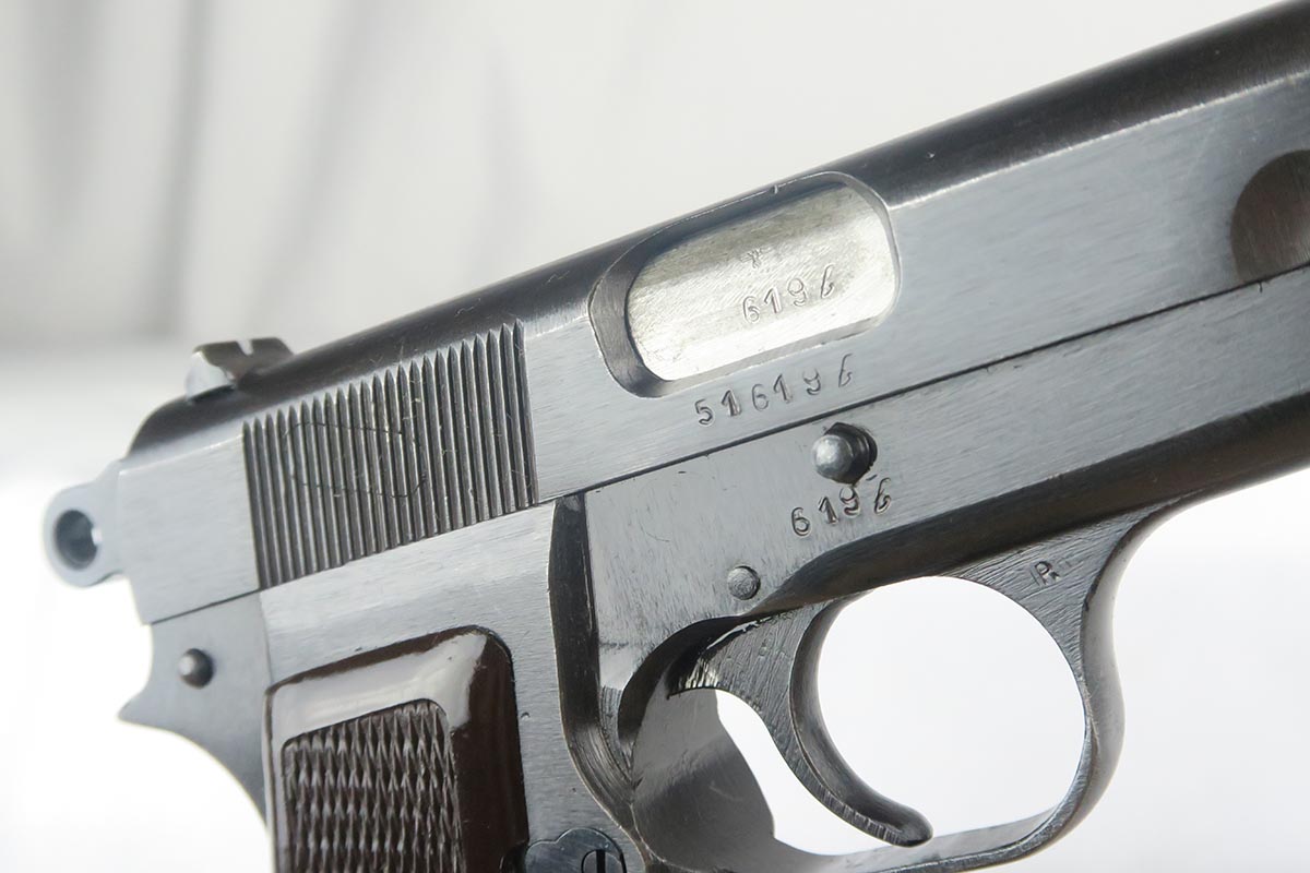 1/9/18 – This is a very nice example of an original Browning High Power that was issued to the Nazi Army during World War II. The finish rates from 95-97%, with a beautiul slide and only minor thinning on the straps. Slide and frame and WaA140 proofed. Excellent brown plastic grips. Unmarked magazine. Minty bore.