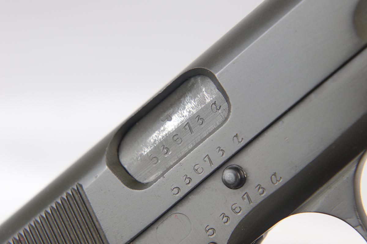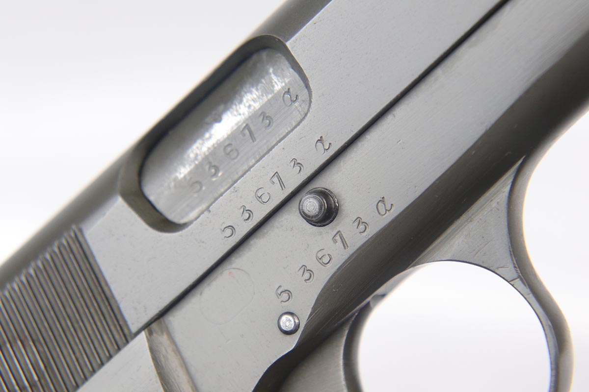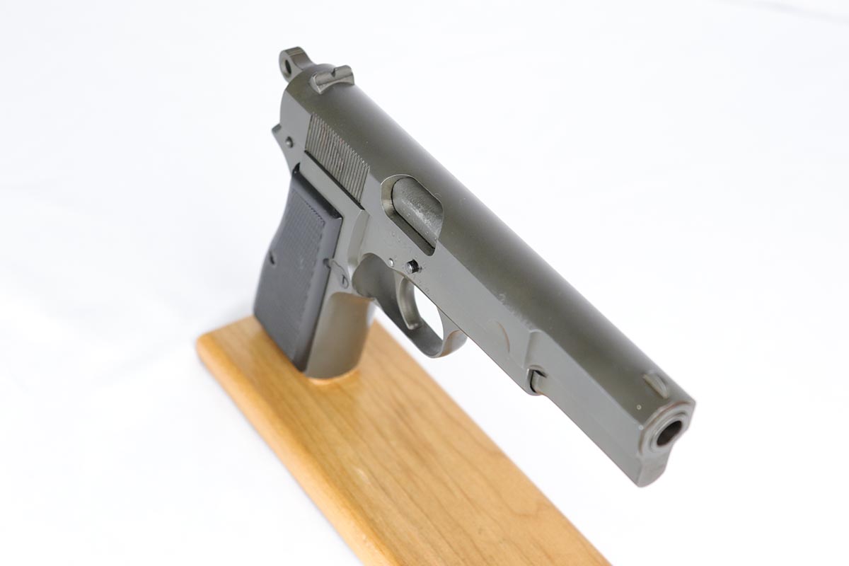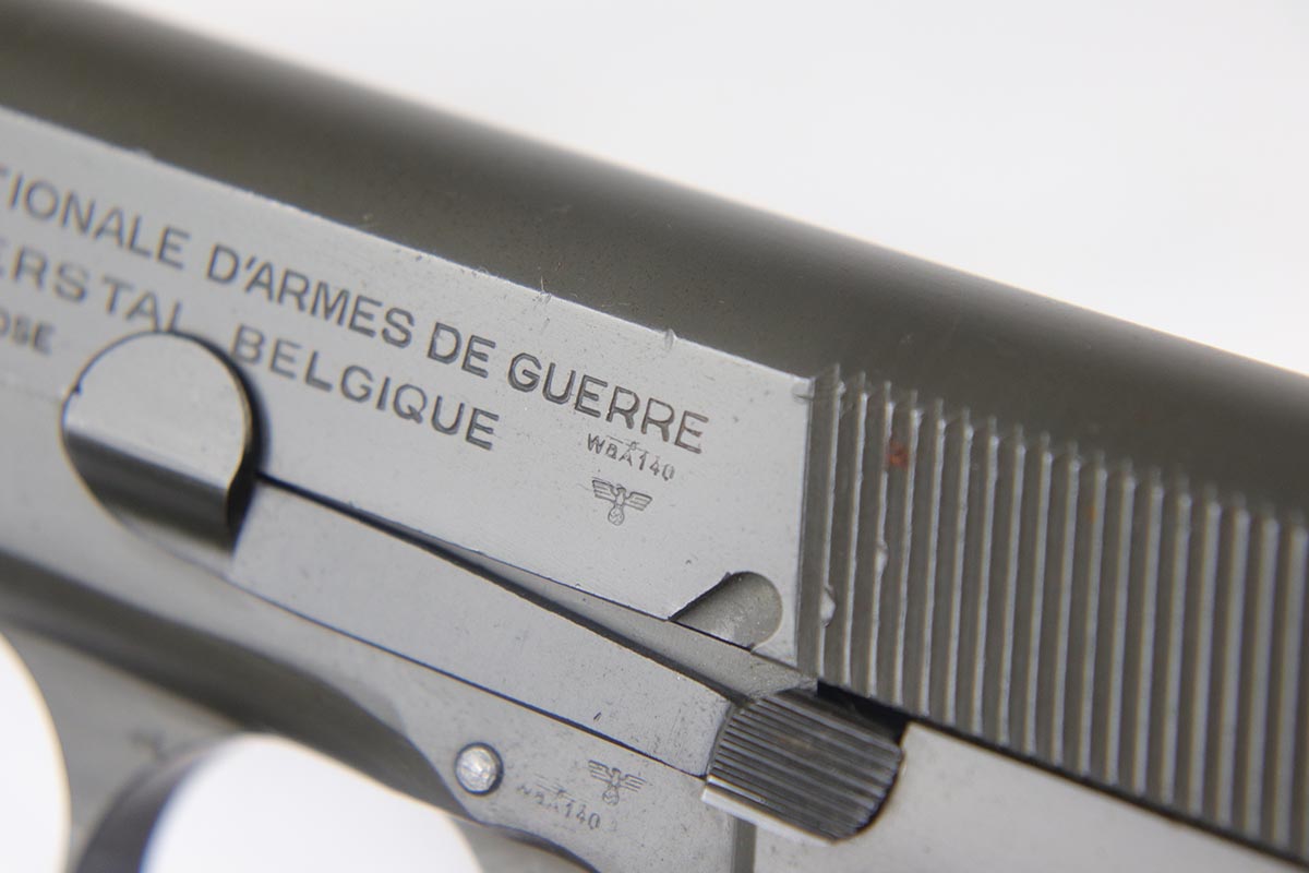6/26/18 – This is a very pretty Browning High Power that was issued to the German Army in the 1940s. The finish on this pistol is eye-catching and in great condition but was restored after the war. The slide and frame are WaA140 proofed. Slide, frame and barrel are all matching. Excellent postwar plastic grips. This listing includes two total magazines, one that is from the time period but refinished, and a second postwar mag. The bore is shiny with strong rifling but does have some minor corrosion in the grooves.