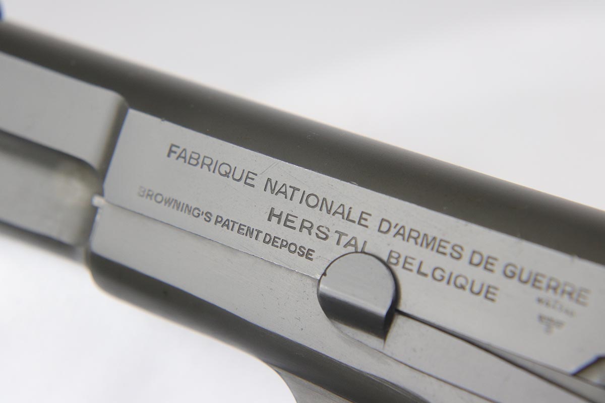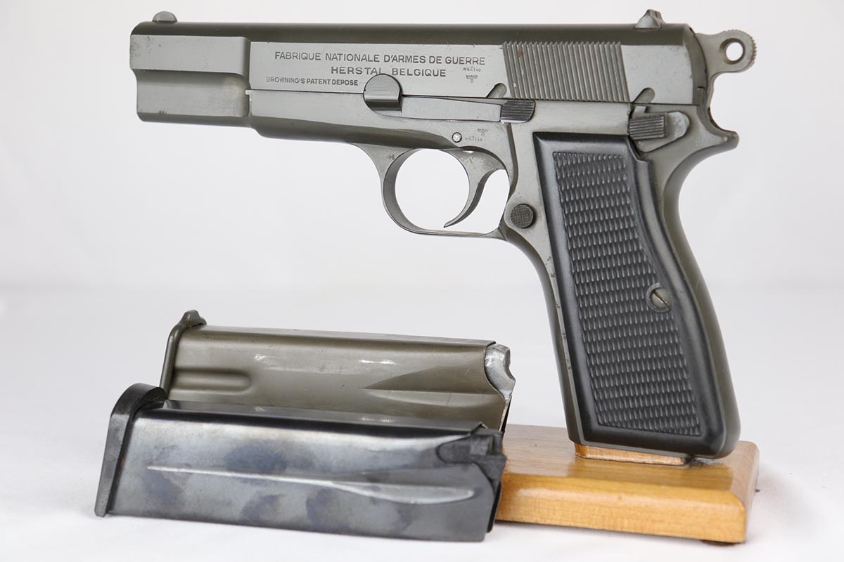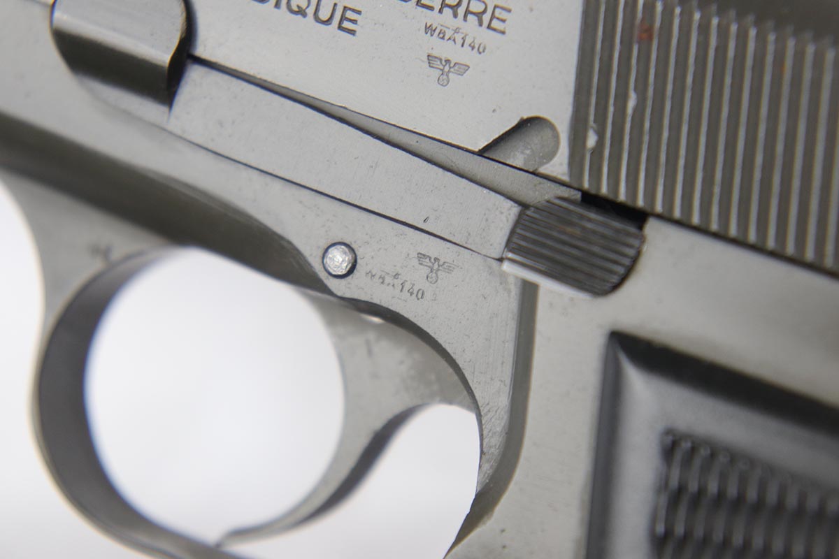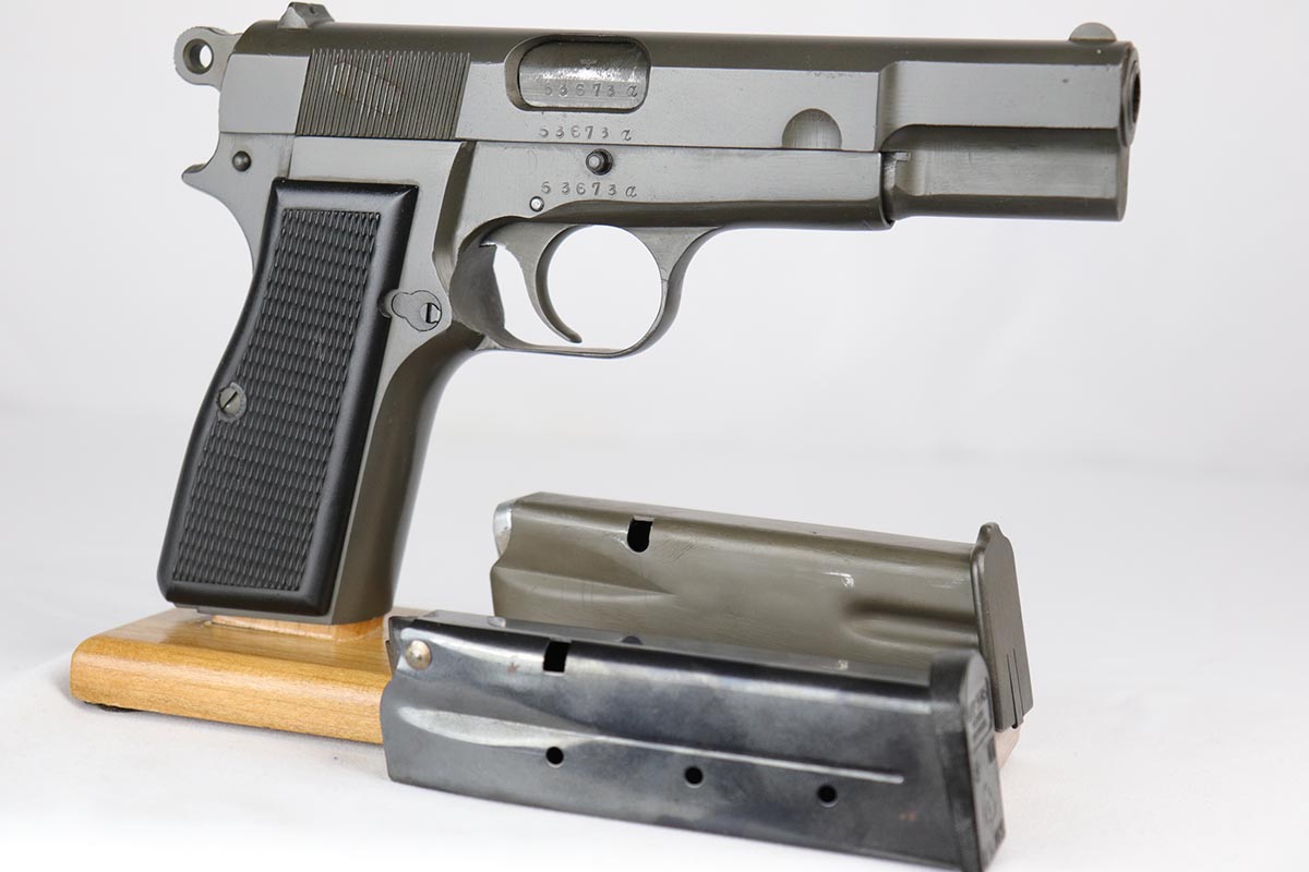 6/26/18 – This is a very pretty Browning High Power that was issued to the German Army in the 1940s. The finish on this pistol is eye-catching and in great condition but was restored after the war. The slide and frame are WaA140 proofed. Slide, frame and barrel are all matching. Excellent postwar plastic grips. This listing includes two total magazines, one that is from the time period but refinished, and a second postwar mag. The bore is shiny with strong rifling but does have some minor corrosion in the grooves.