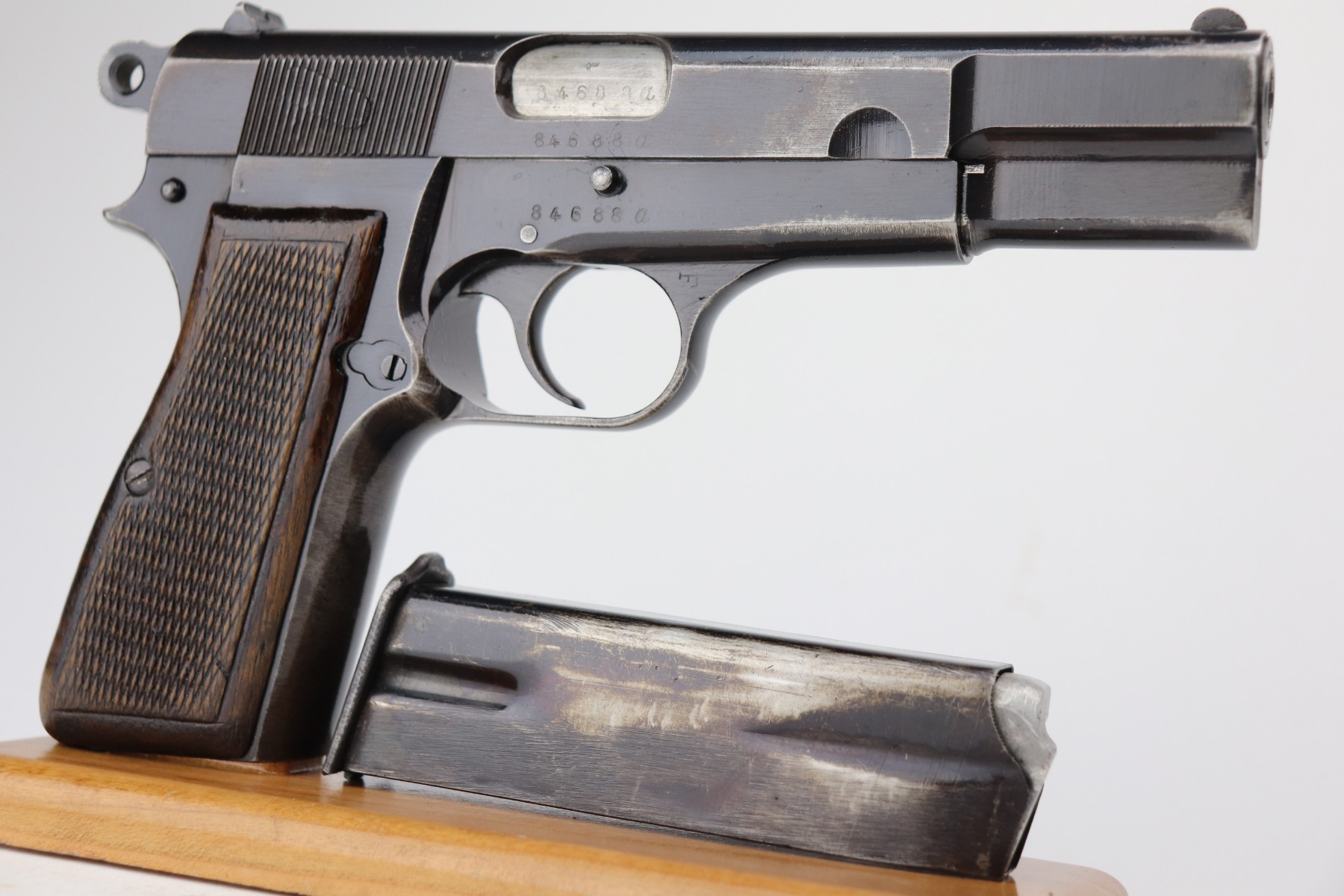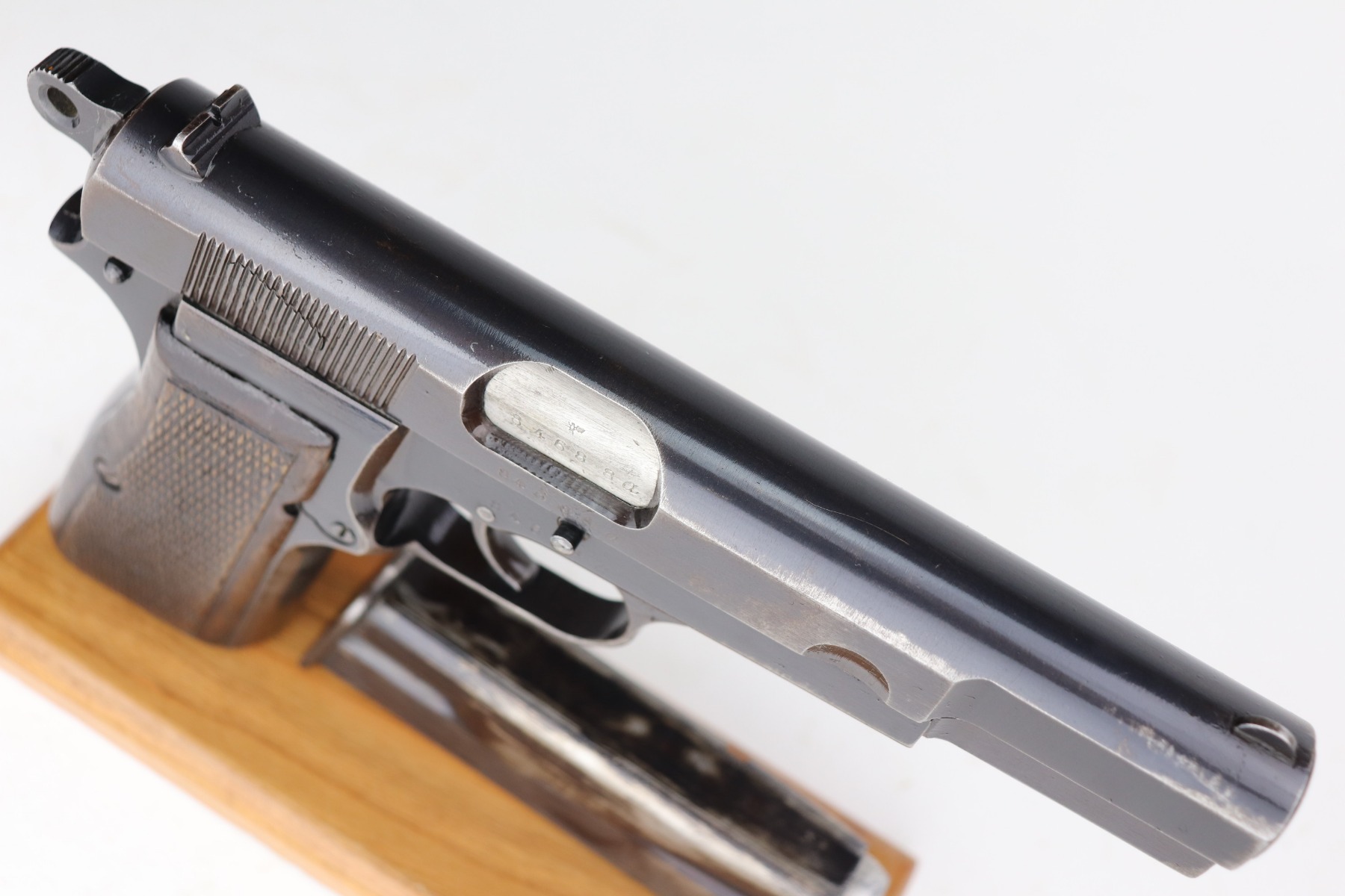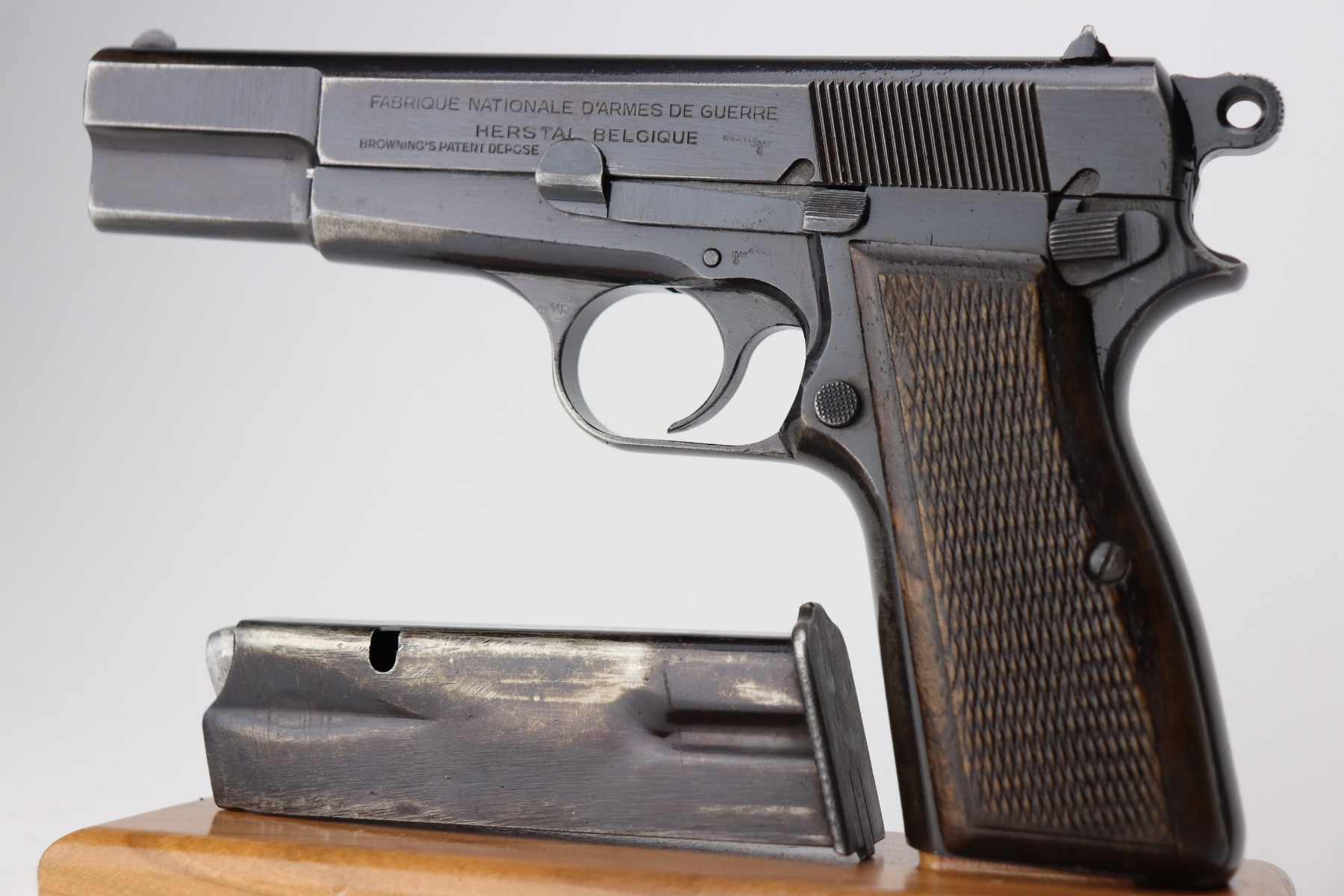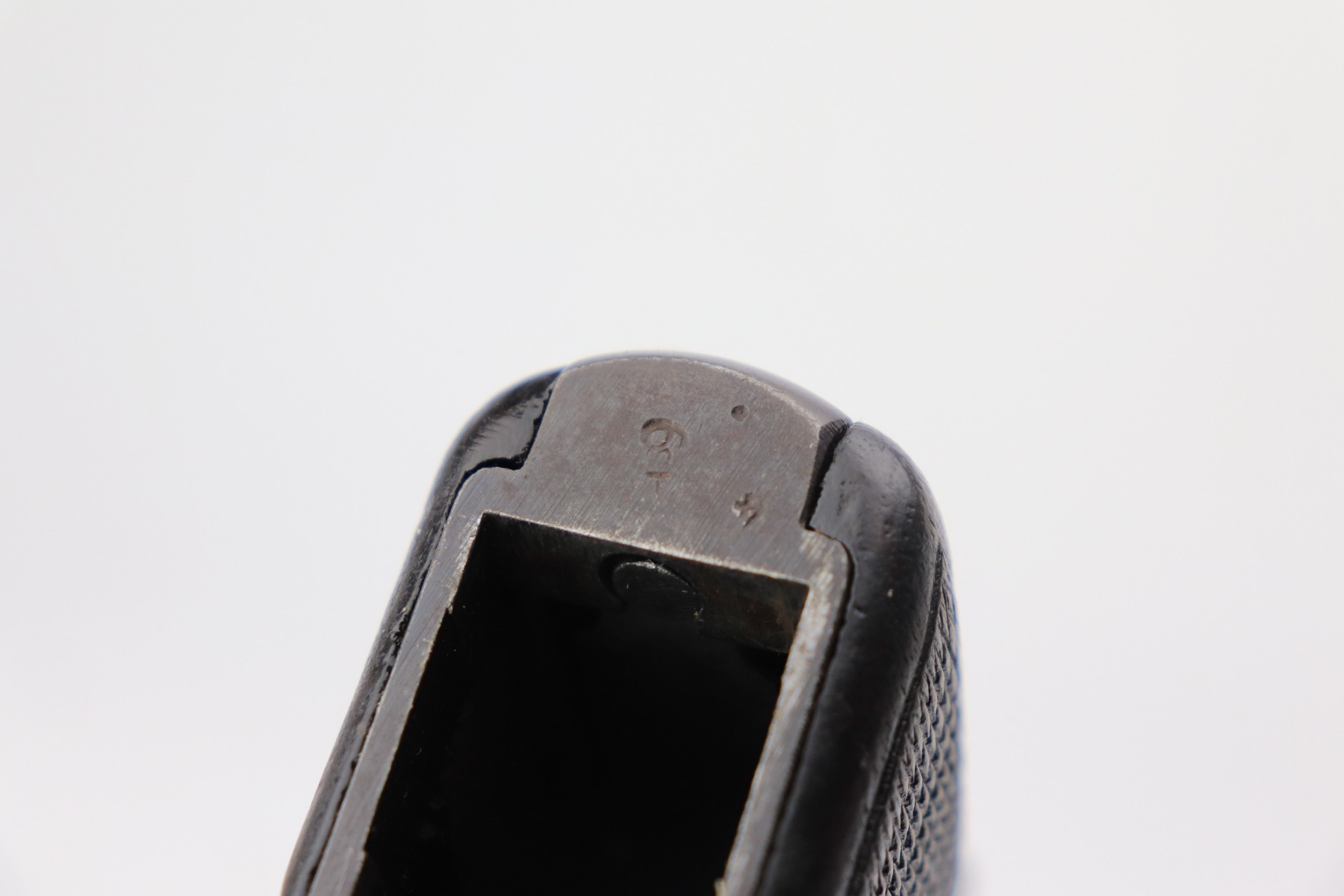 3/8/21 – This is a nice example of an FN Browning High Power Rig issued to the Nazi military during WW2. It is all matching and has the proper “Waffen 140” military proofs. It comes with a period-correct holster and an un-marked period-correct magazine. The gun has retained roughly 85% of its original finish. There is spotty wear on the front strap, around the muzzle, and on the high edges of the slide. There is also an area of wear on the right side of the slide. Brown patina on the back strap. Excellent grips. The bore is very nice with strong rifling.