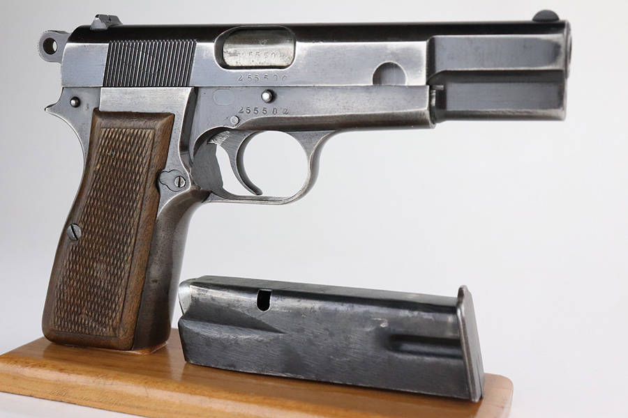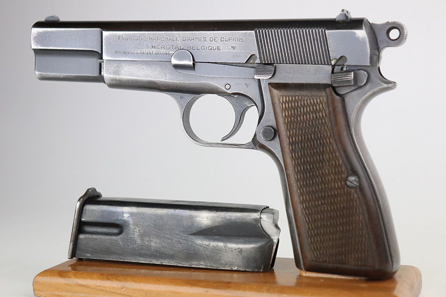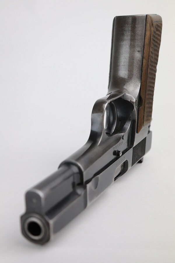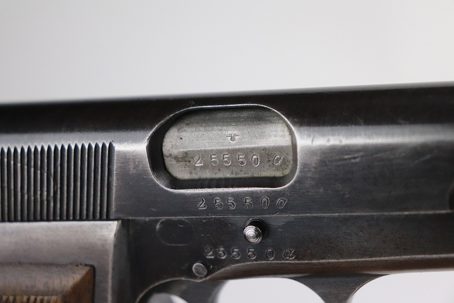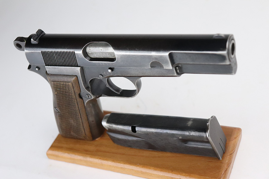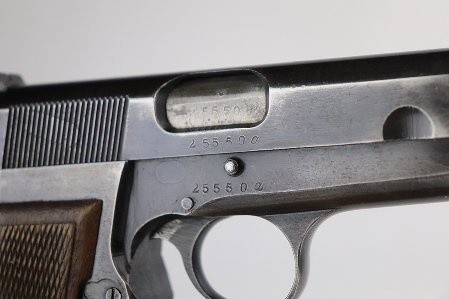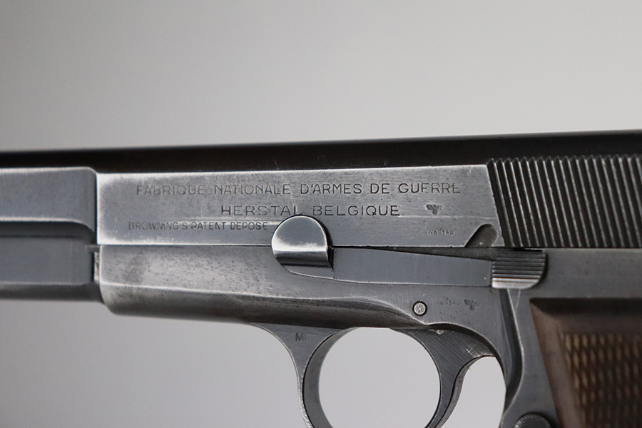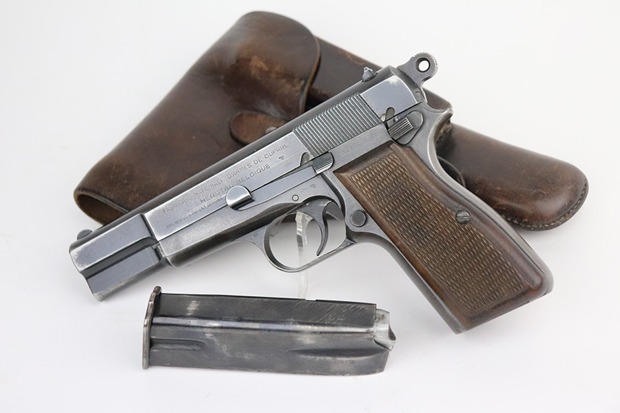 7/16/21 – This is a nice example of an FN Browning High Power Rig issued to the Nazi military during WW2. The gun is all matching and has the proper “Waffen 140” military proofs. It comes with one period-correct magazine (no proofs) and a nice 1944-dated waffen-proofed holster. The gun has retained roughly 60% of its original finish. There is noticeable wear and thinning throughout, concentrated around the high edges, around the muzzle, both sides of the frame, and on the straps. Tiny dots of oxidation throughout, most noticeable on the straps. A few scratches on the left side of the slide. Comes with excellent wood grips. The bore has decent rifling with spotty freckling throughout. It also includes a rare 1941 dated holster with ‘epf’ maker mark and fairly clear waffenamt. The holster is in decent shape but does show some age, as the leather has softened some and there is wear on the mag pouch.