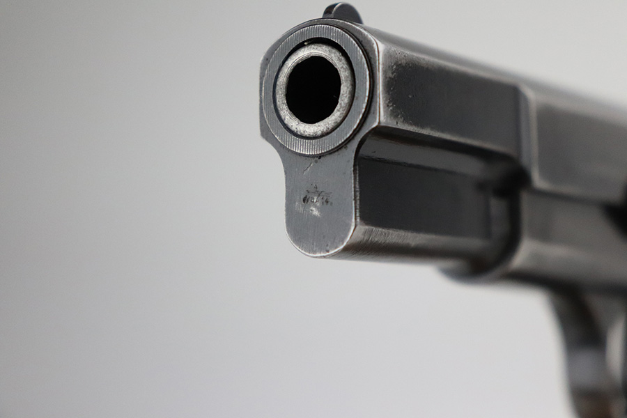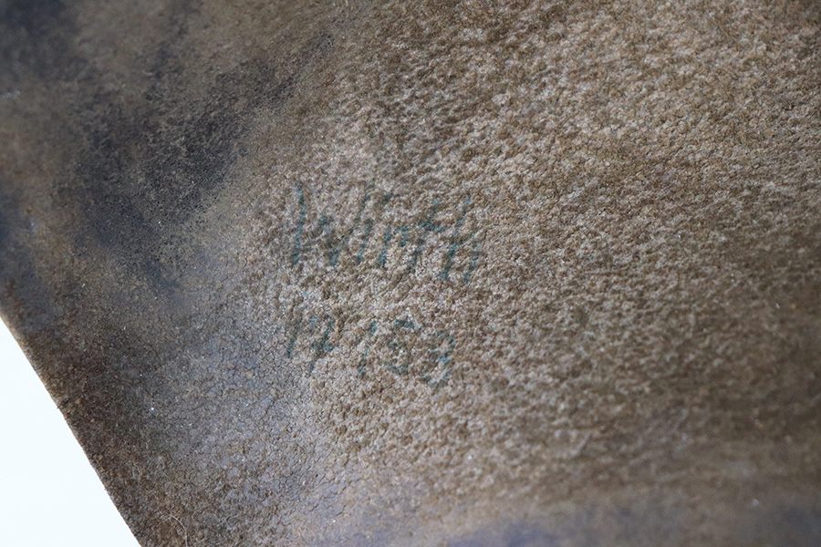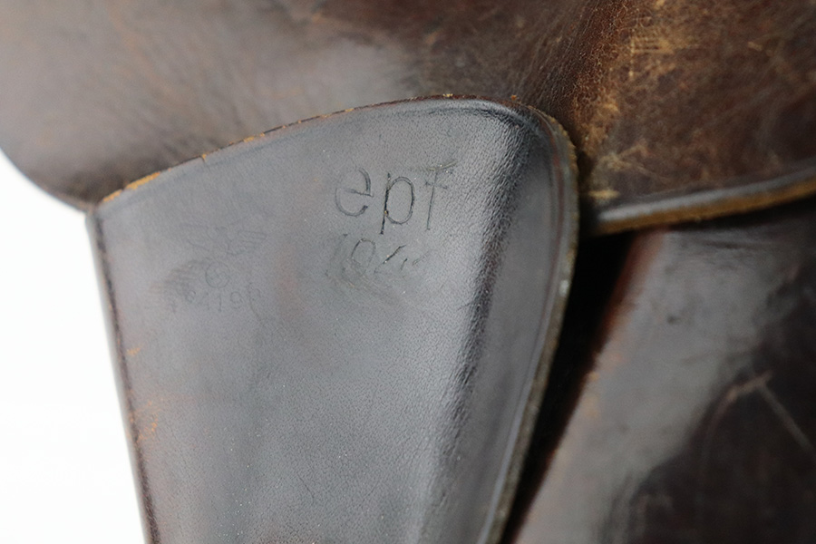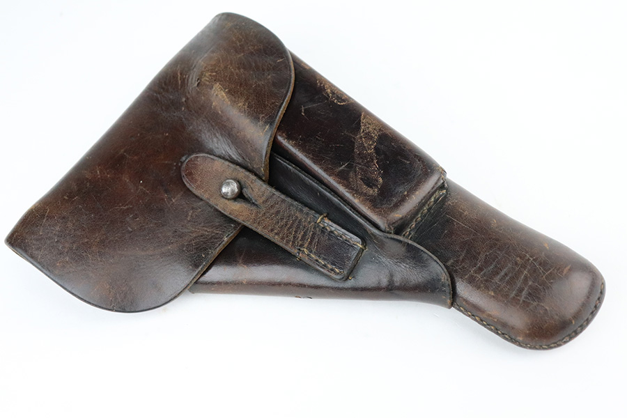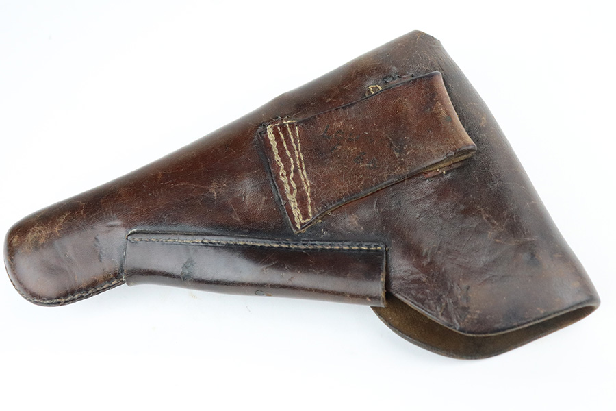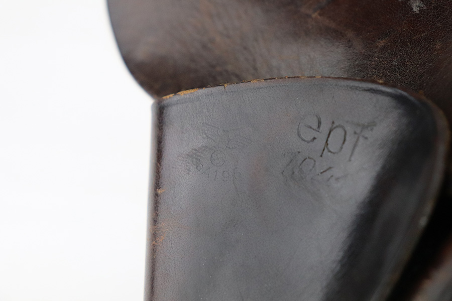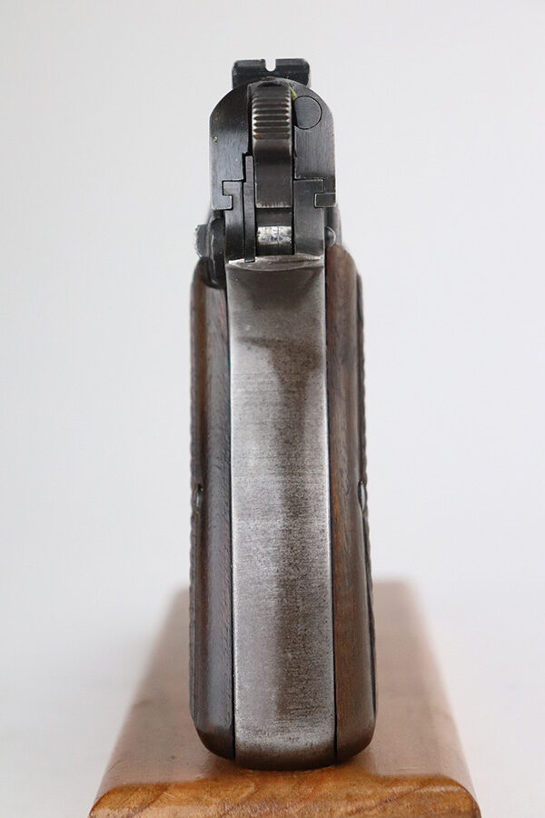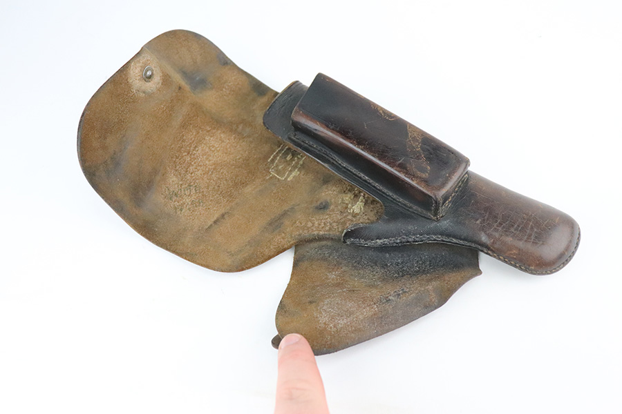 7/16/21 – This is a nice example of an FN Browning High Power Rig issued to the Nazi military during WW2. The gun is all matching and has the proper “Waffen 140” military proofs. It comes with one period-correct magazine (no proofs) and a nice 1944-dated waffen-proofed holster. The gun has retained roughly 60% of its original finish. There is noticeable wear and thinning throughout, concentrated around the high edges, around the muzzle, both sides of the frame, and on the straps. Tiny dots of oxidation throughout, most noticeable on the straps. A few scratches on the left side of the slide. Comes with excellent wood grips. The bore has decent rifling with spotty freckling throughout. It also includes a rare 1941 dated holster with ‘epf’ maker mark and fairly clear waffenamt. The holster is in decent shape but does show some age, as the leather has softened some and there is wear on the mag pouch.