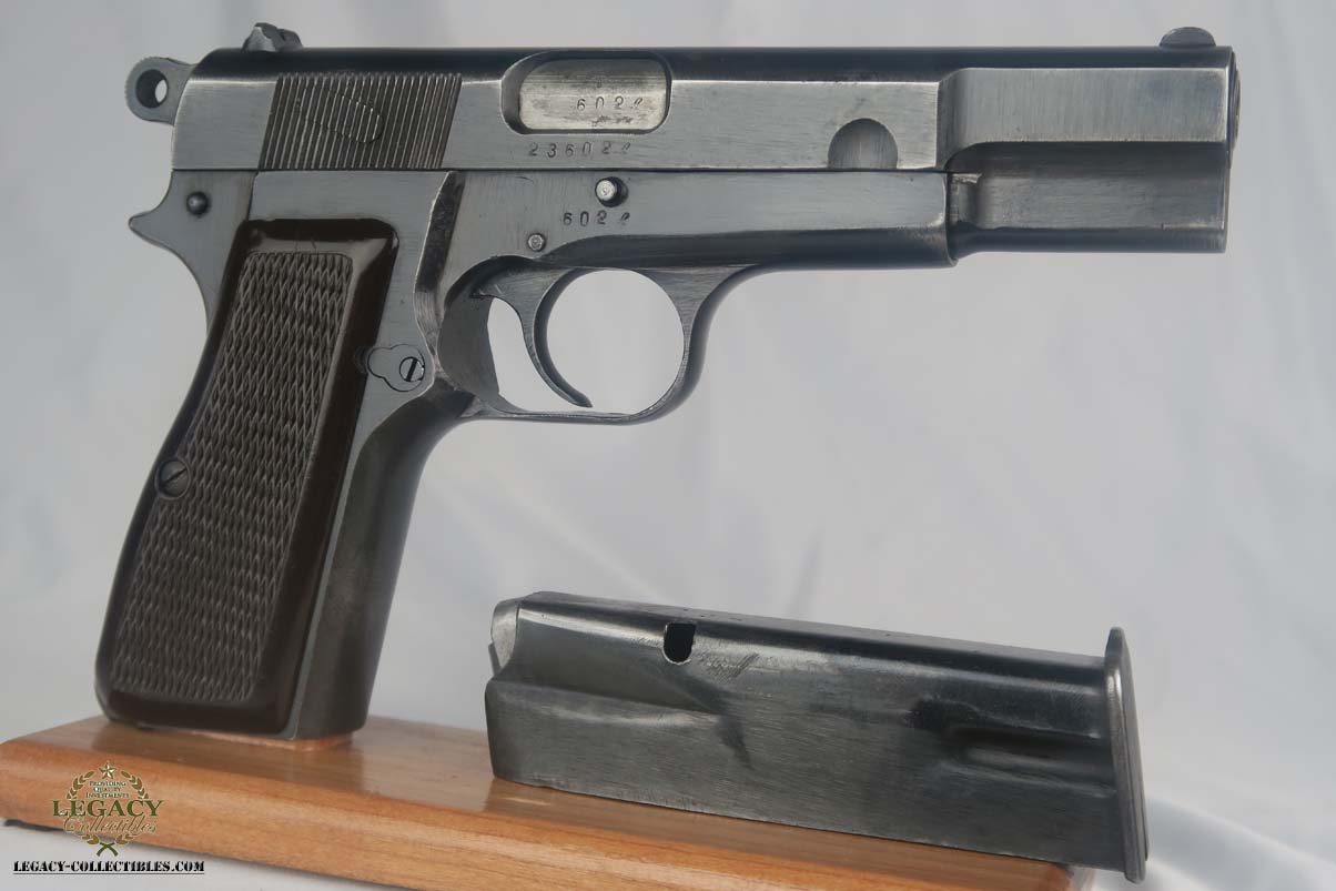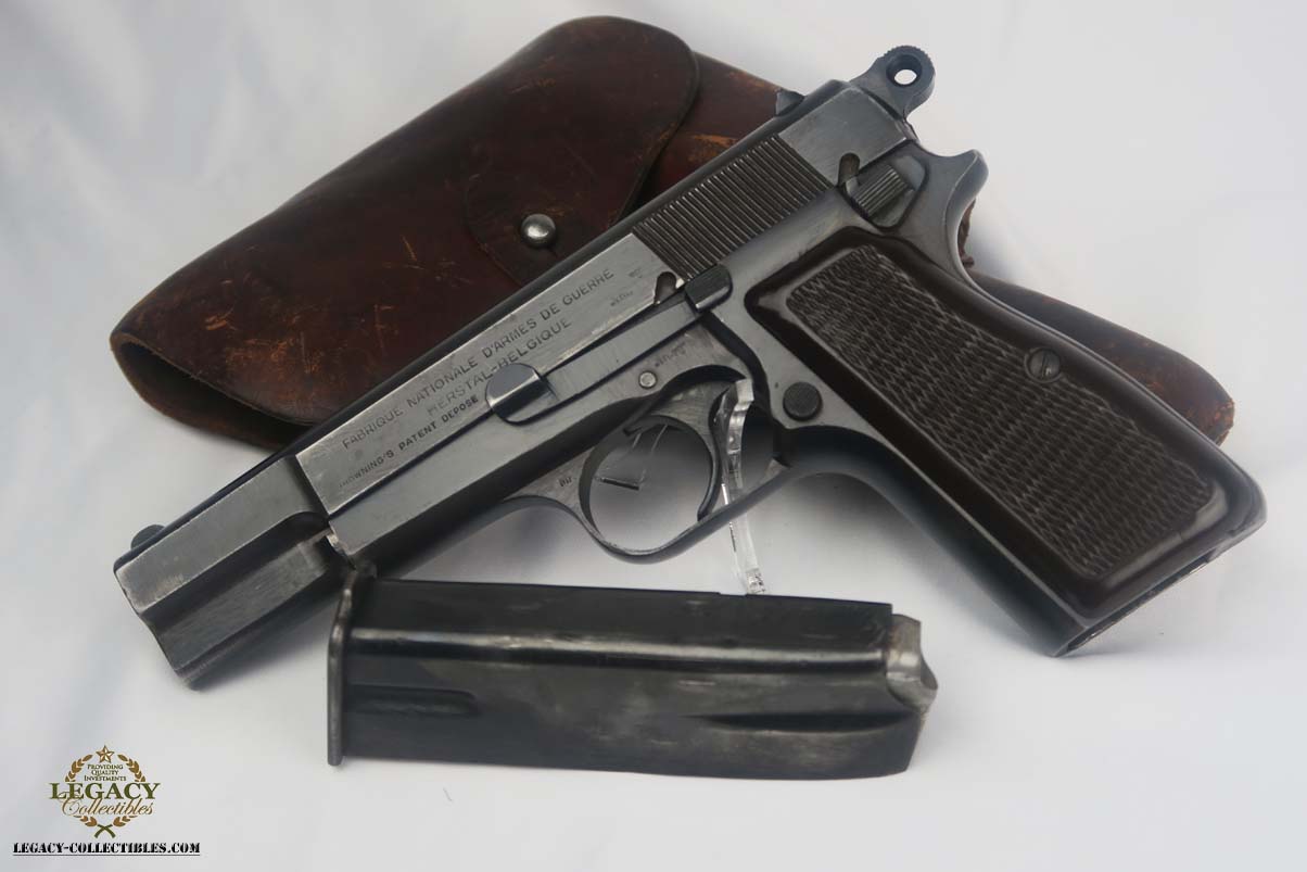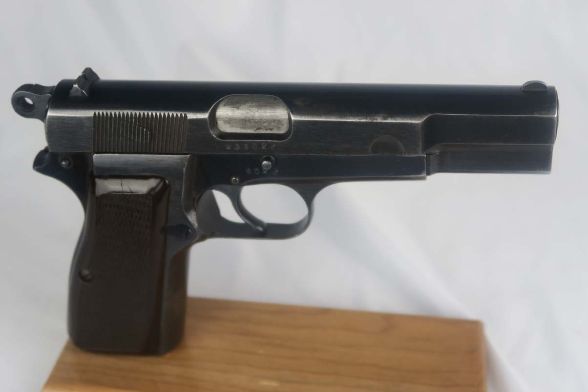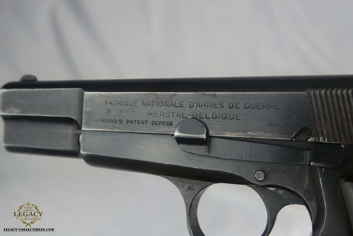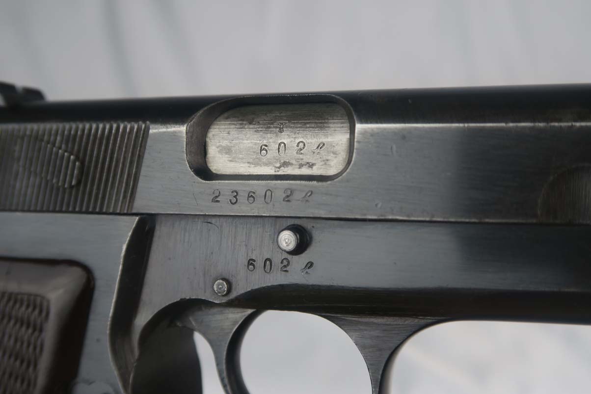 5/22/17 – This is Nazi-proofed Browning High Power with the original holster from the family of the vet. It has about 95% original military bluing left, with edge wear on the slide and nice straps. Fixed sight variation with b-suffix, so a later war production date. WaA140 proofed with correct brown plastic grips. Holster is unmarked with no major issues. Unmarked magazine. Very nice bore, with a little cloudiness.