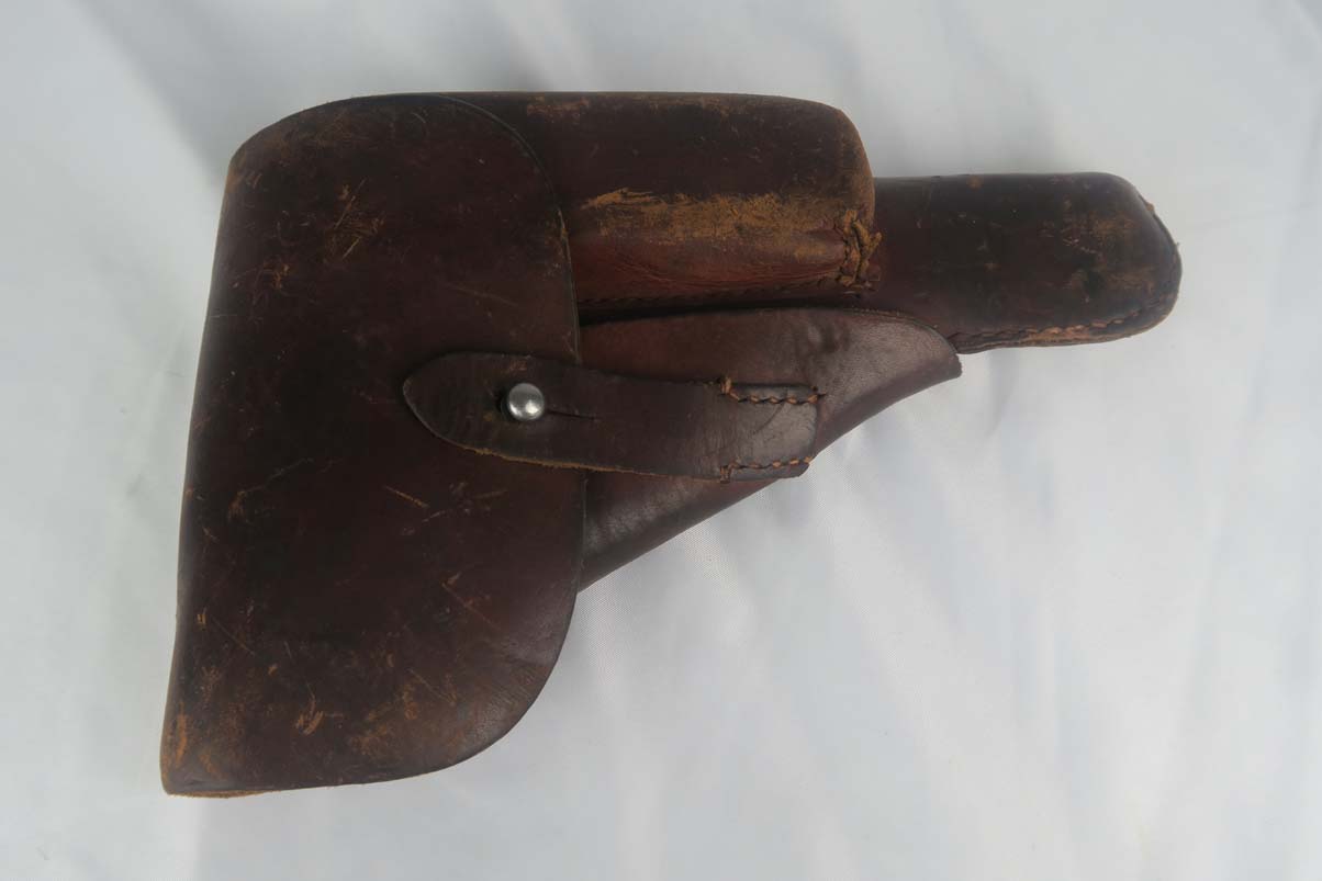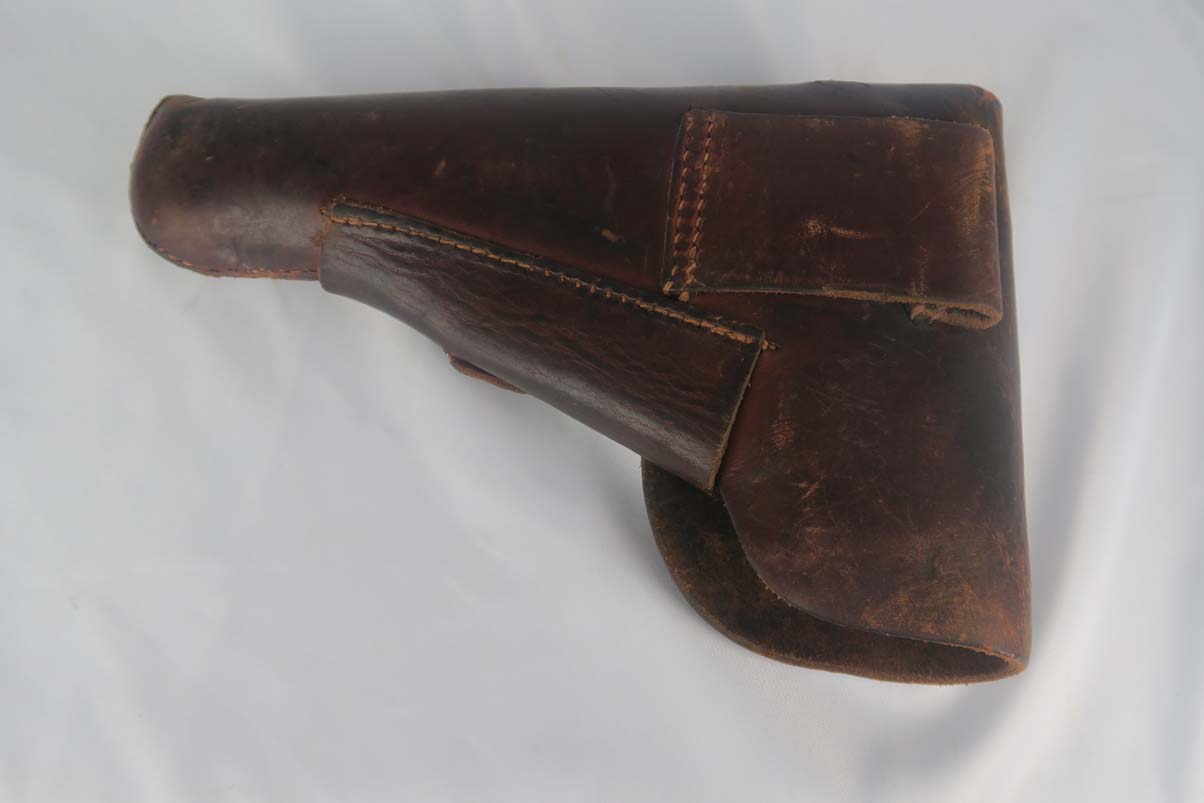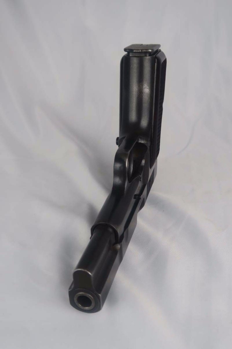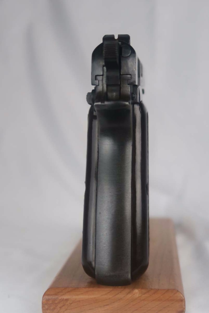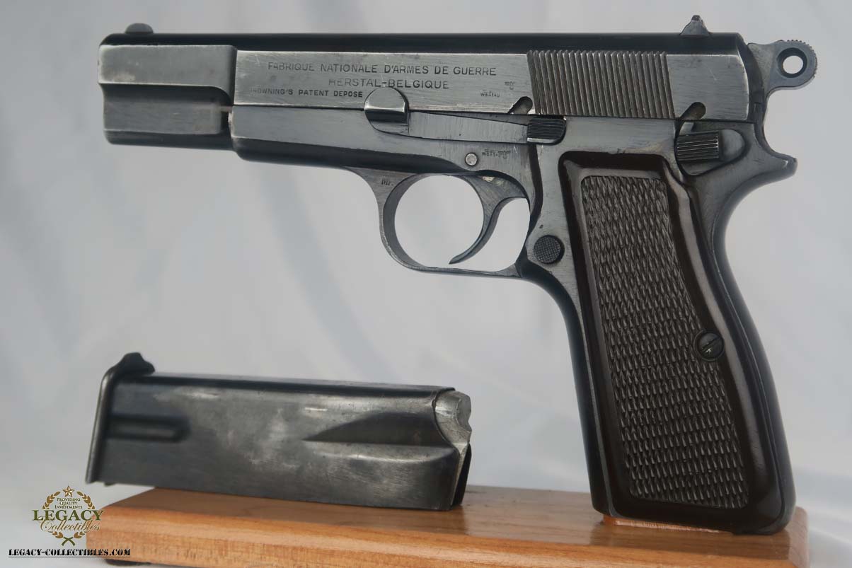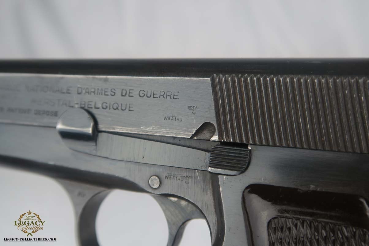 5/22/17 – This is Nazi-proofed Browning High Power with the original holster from the family of the vet. It has about 95% original military bluing left, with edge wear on the slide and nice straps. Fixed sight variation with b-suffix, so a later war production date. WaA140 proofed with correct brown plastic grips. Holster is unmarked with no major issues. Unmarked magazine. Very nice bore, with a little cloudiness.