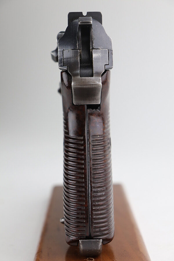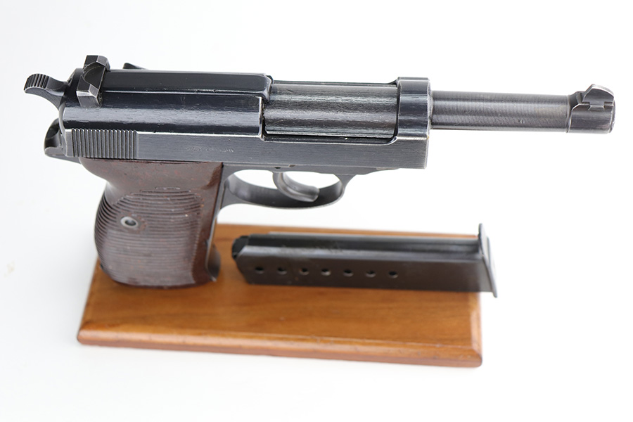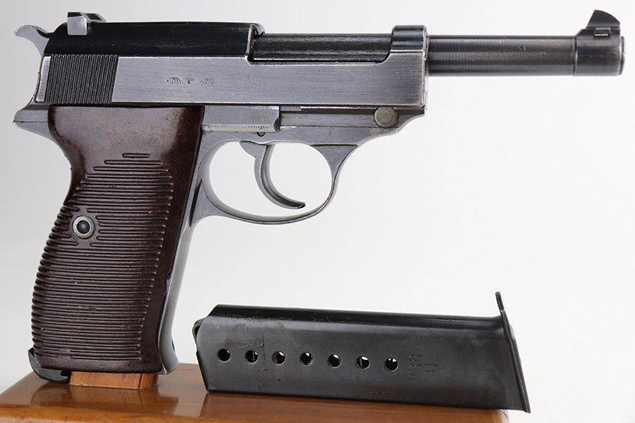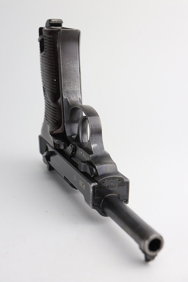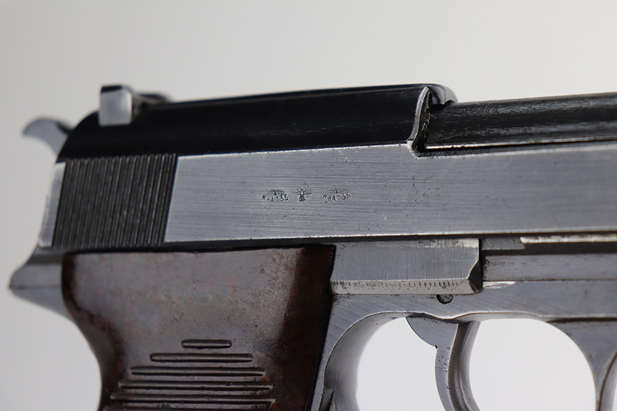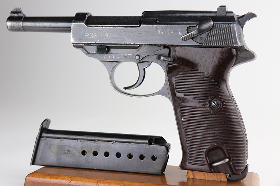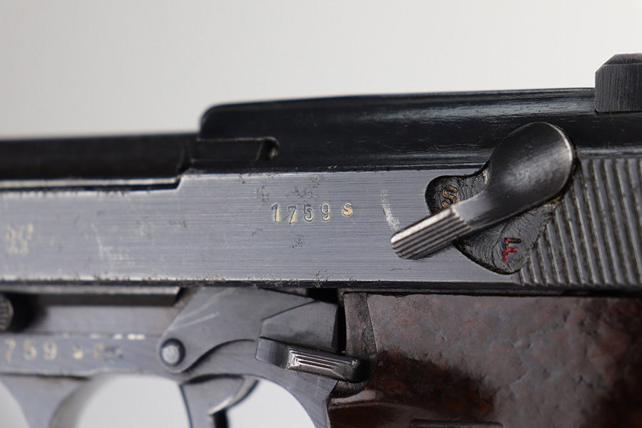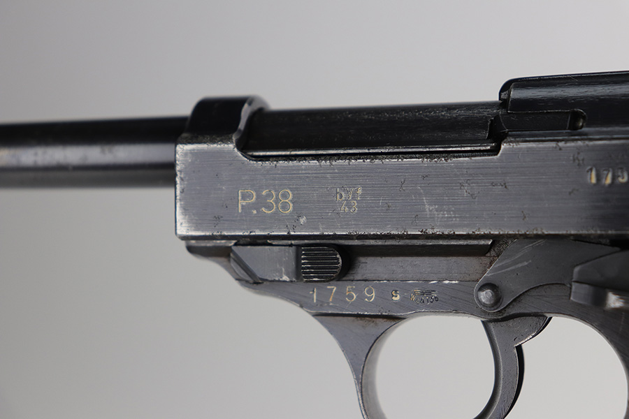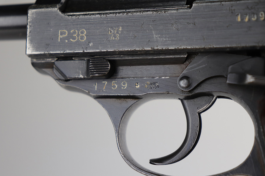 8/19/21 – This is a nice example of a Mauser P.38 issued to the Nazi military in 1943. This BYF 43 is also in the “S” serial block. It is all matching and has the proper “Waffen 135” military proofs. Comes with excellent grips and a period-correct magazine. It has retained somewhere between 85-90% of its original finish. Most of the wear is on the front strap, but there is also minor wear on the high edges of the slide and around the muzzle. There is minor pitting along all of the high edges of the left side of the slide. Some spotty oxidation here and there, most noticeable on the front strap. The bore has strong rifling with freckling in the grooves. De-cocker is not functional.