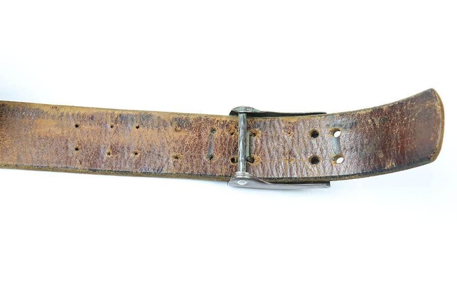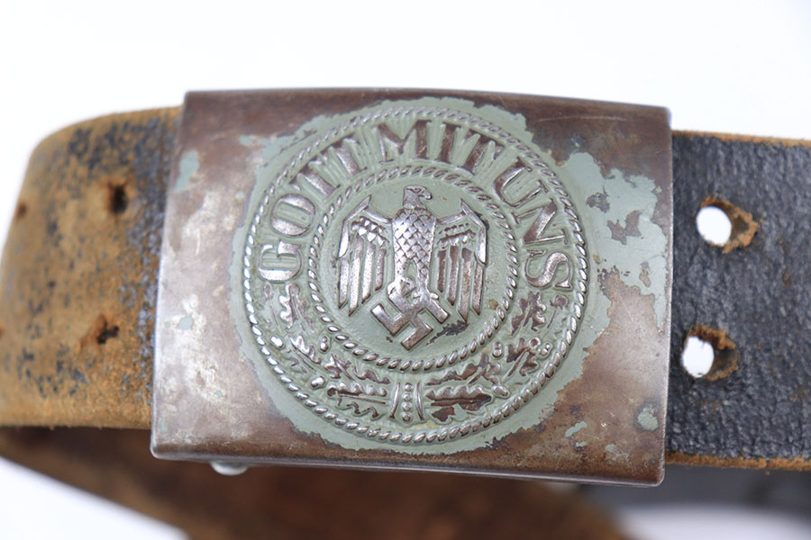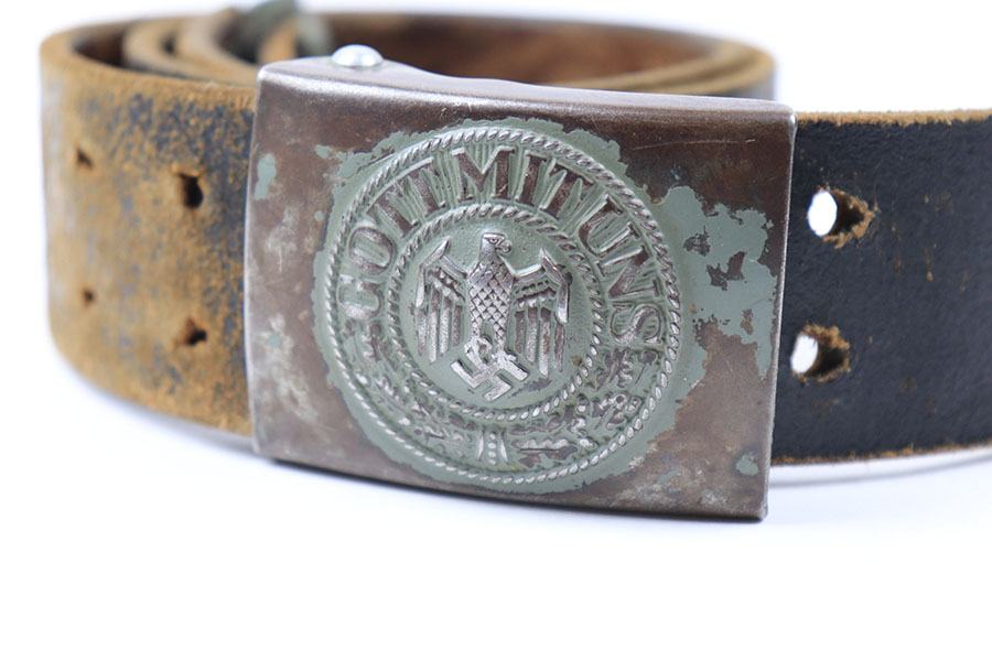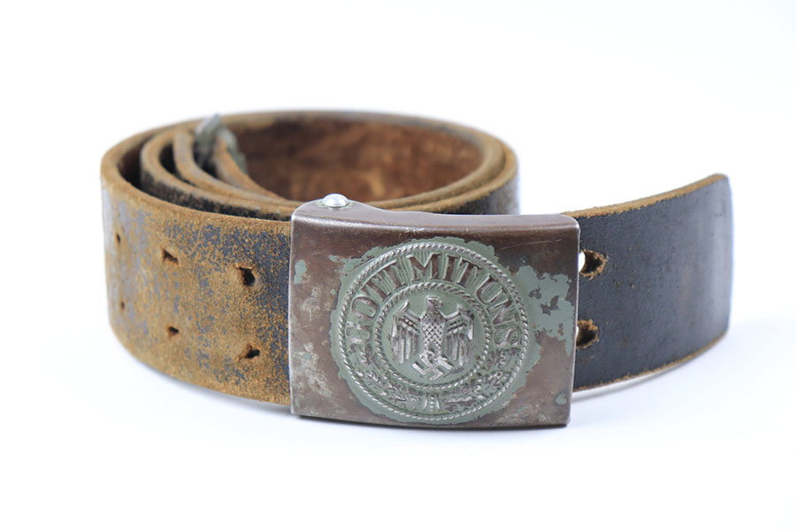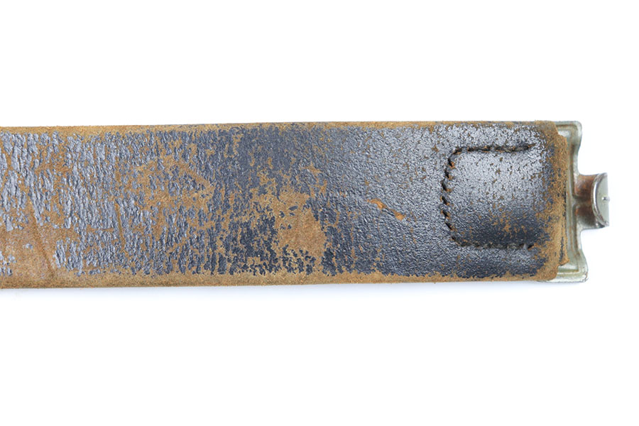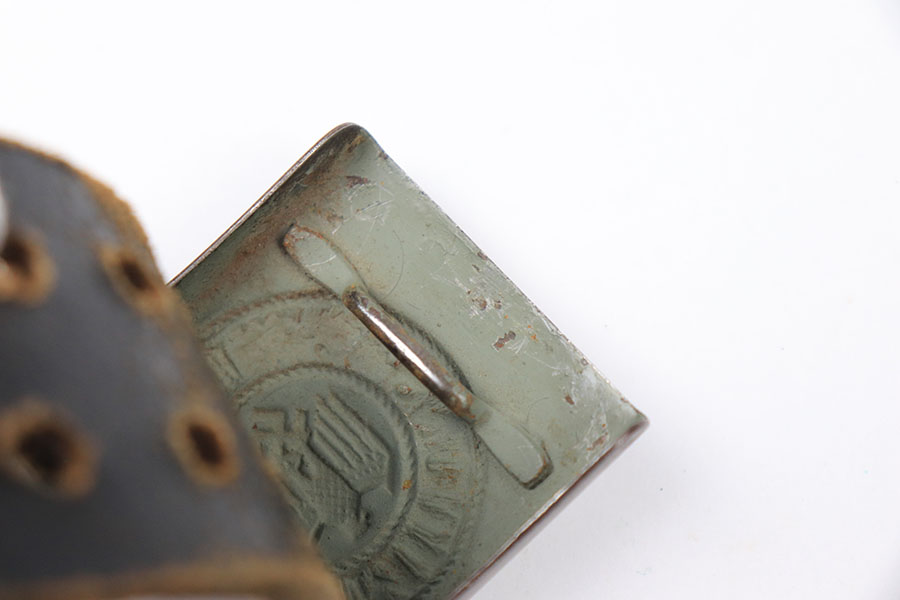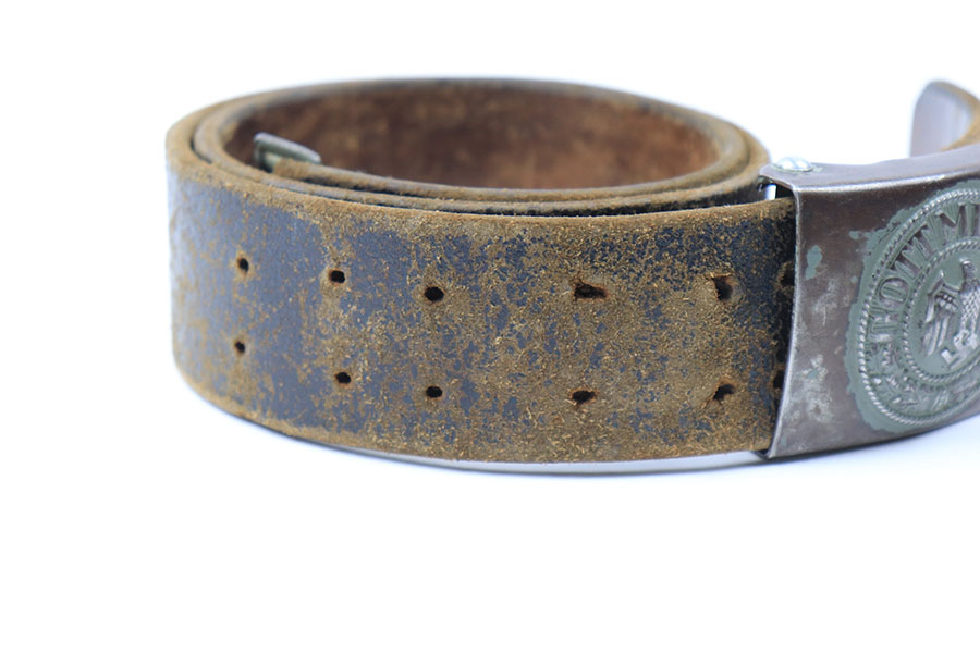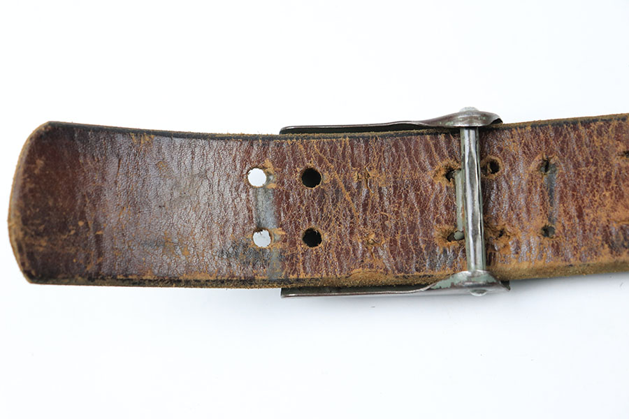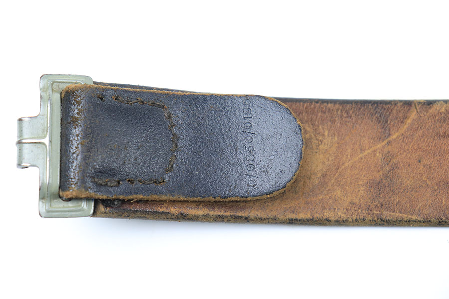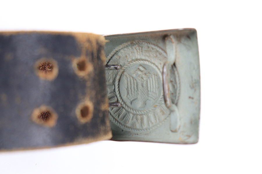 8/13/21 – This is an original WW2 Nazi belt and buckle. The buckle is olive green painted for field / combat use. The paint is mostly worn off the front of the buckle, as shown. The black leather belt shows signs of use and aging. There’s surface wear throughout and mild wrinkling but no major issues with the leather. The stitching is all missing from the hooked end of the belt, as shown.