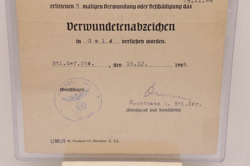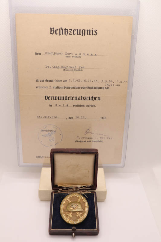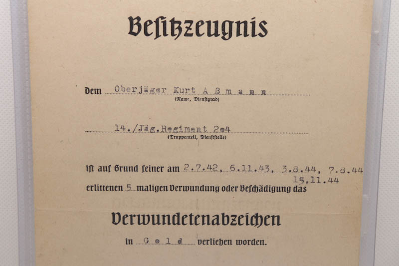 11/2/20 – This is an authentic wound badge awarded to a German combat soldier during WW2. He was wounded five times, as shown in the documentation. The badge is gold and has the soldiers name, rank, and dates wounded. The award was showcased in a video on our YouTube channel. https://www.youtube.com/watch?v=_KEeOGysvYc