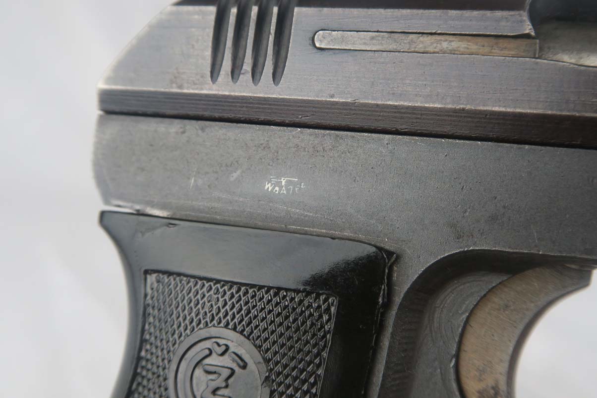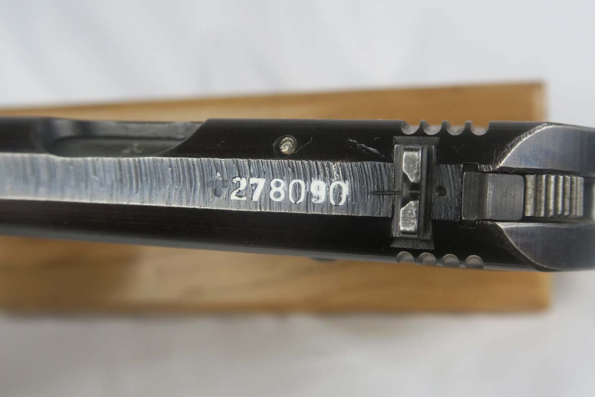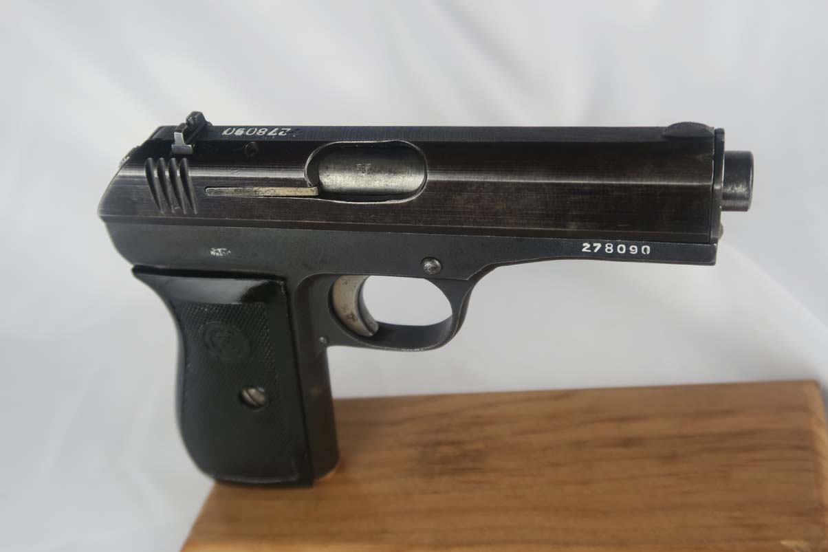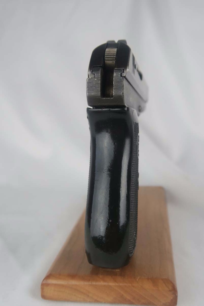 7/25/17 – This is a late-war Nazi CZ 27 in all original condition. The bluing is a rougher late finish and rates at about 96% with minor thinning in a few places. Matching slide ande frame. The grip has a few dings and scrapes but no cracks. Nice mag. Mint bore.
