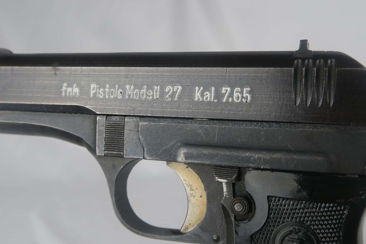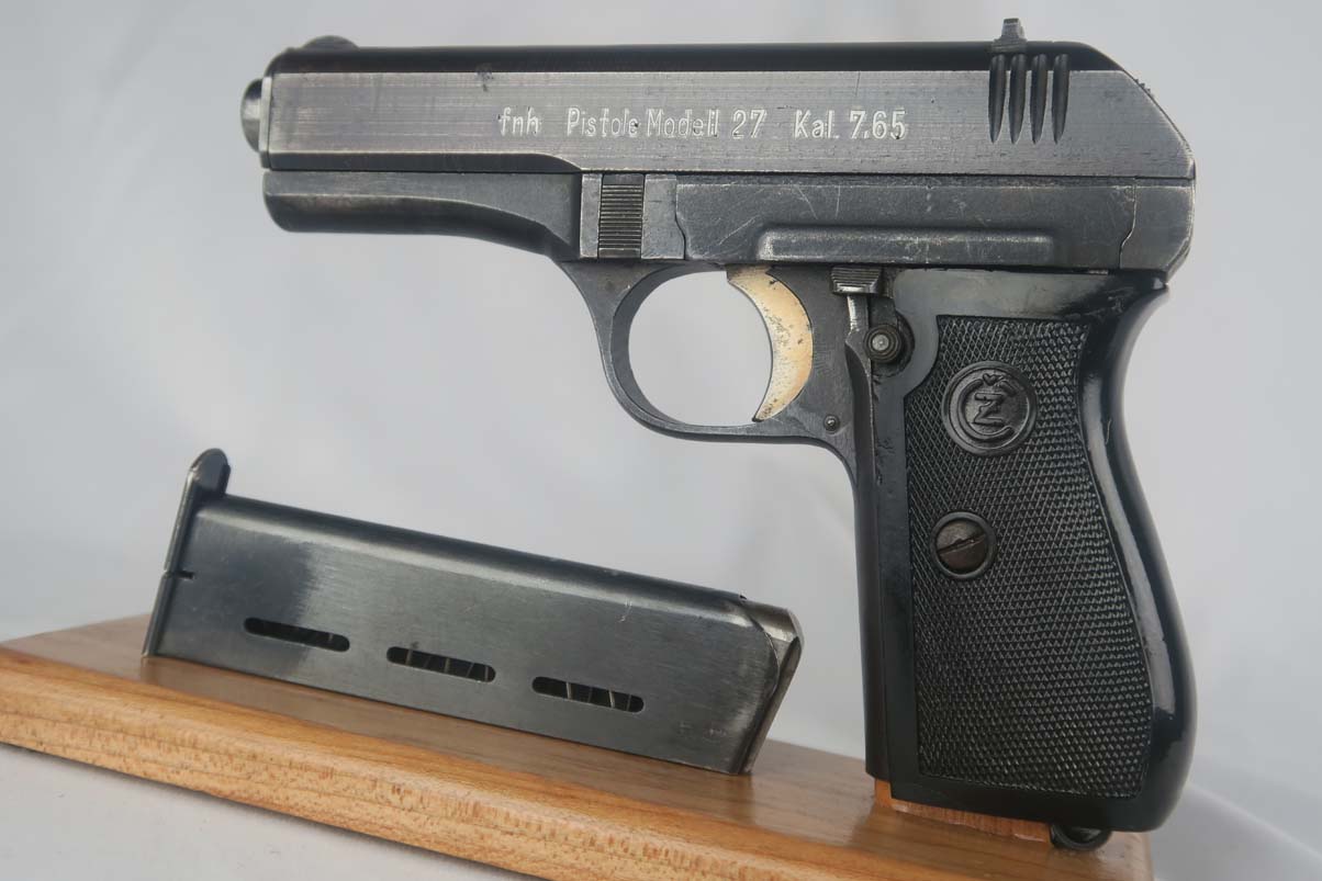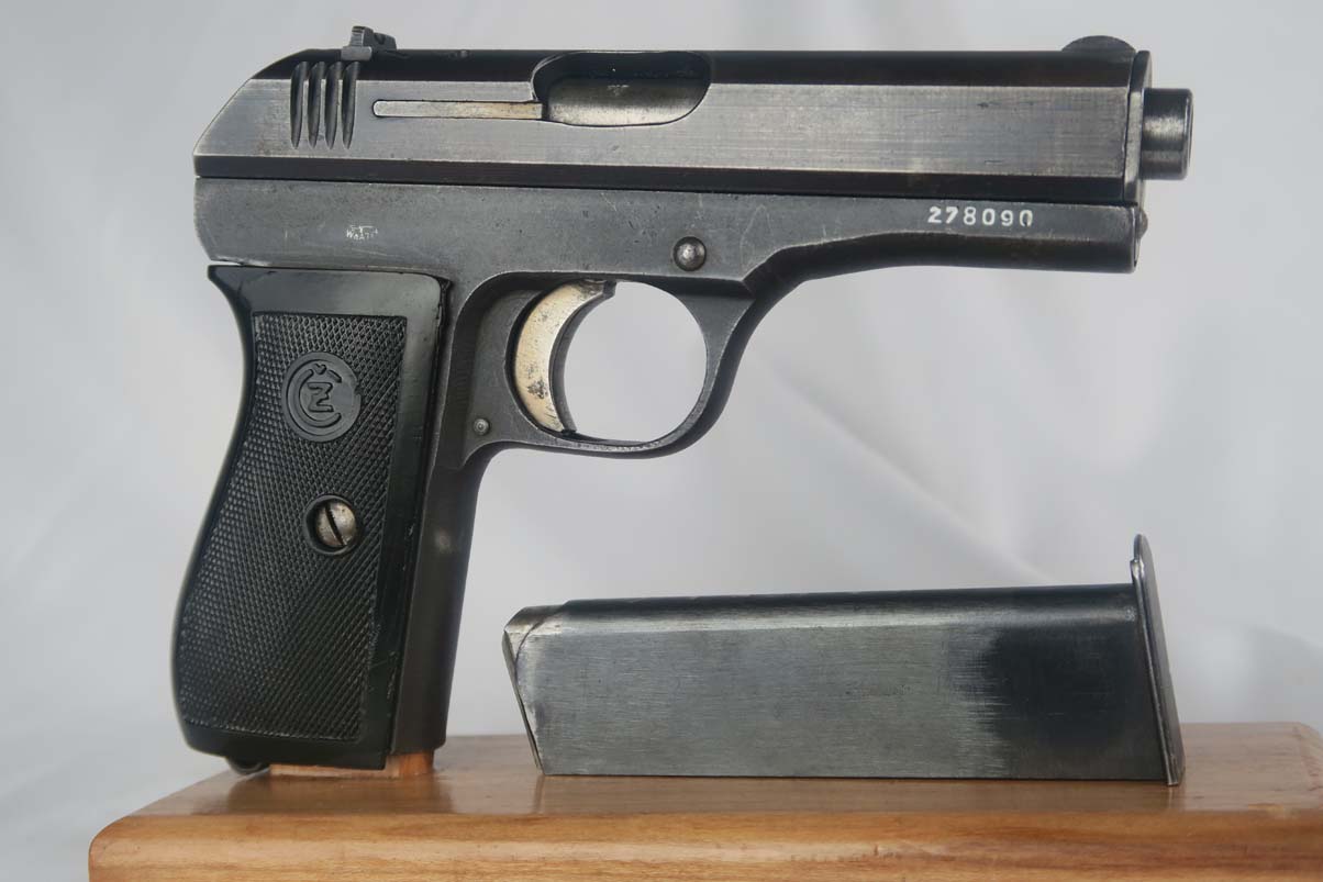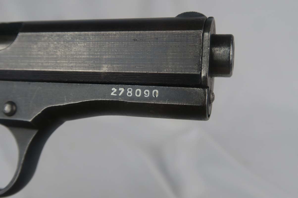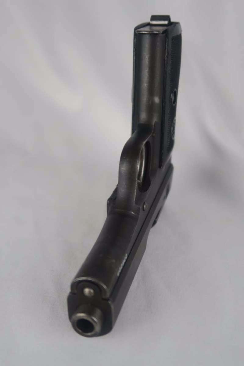 7/25/17 – This is a late-war Nazi CZ 27 in all original condition. The bluing is a rougher late finish and rates at about 96% with minor thinning in a few places. Matching slide ande frame. The grip has a few dings and scrapes but no cracks. Nice mag. Mint bore.