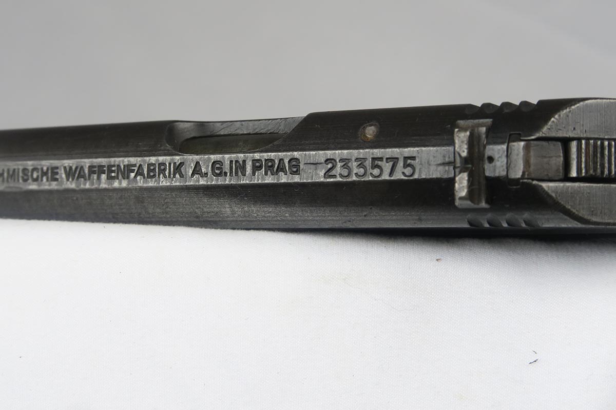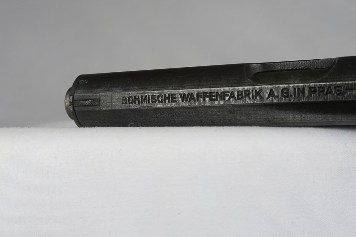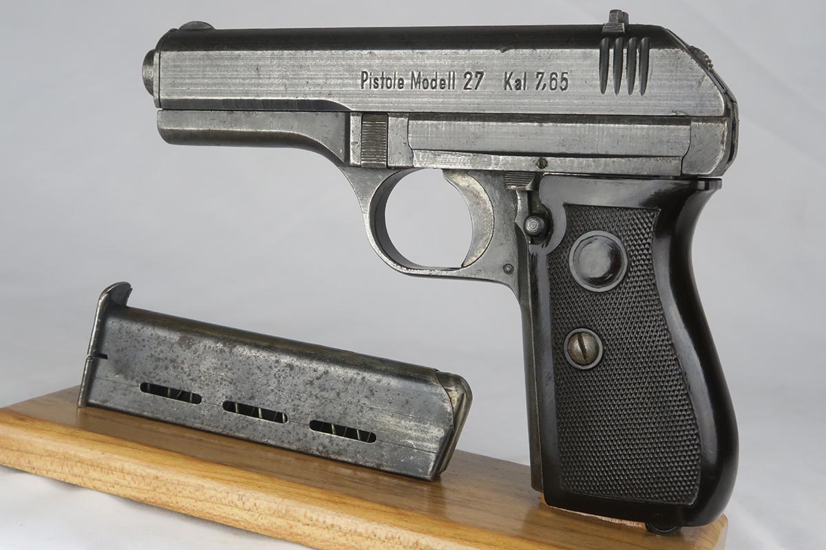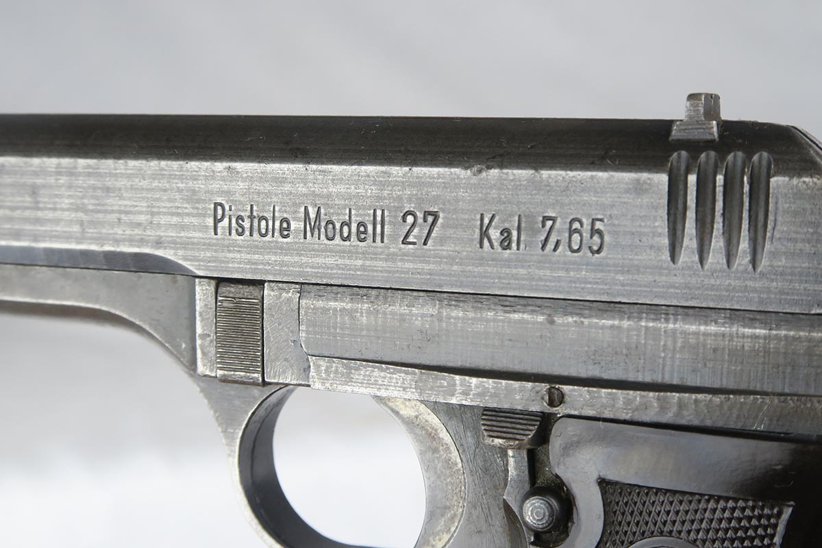 11/20/17 – This is a late-war Nazi CZ-27 in original WW2 condition. The phosphate finish is tough to rate as it is rough and thin, with more finish loss on the front strap and left side. WaA76 proof on right side frame. Excellent grip with no chips or cracks. Strong bore with no major issues. Magazine is marked P. MOD 27 on bottom and shows some corrosion on the baseplate.