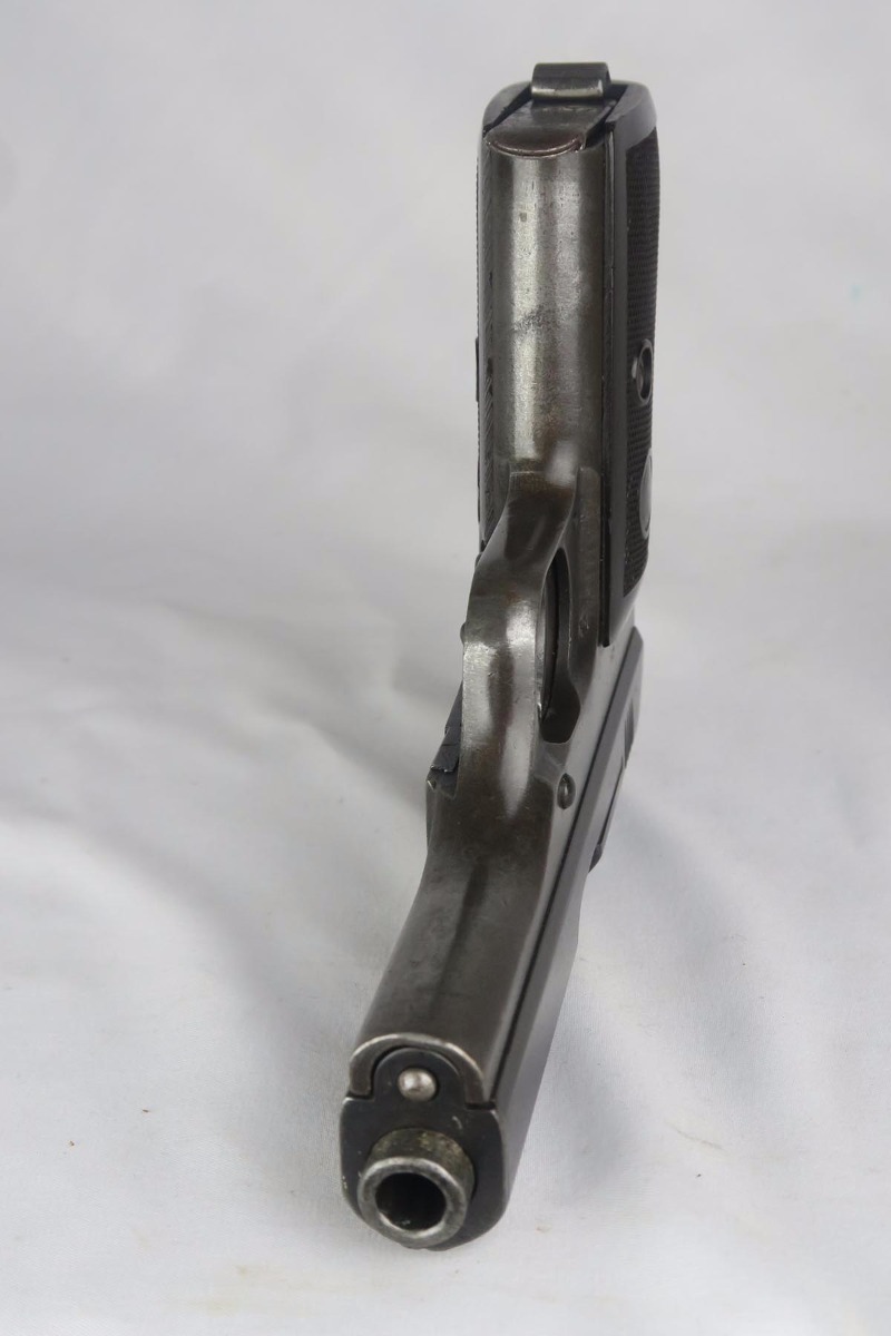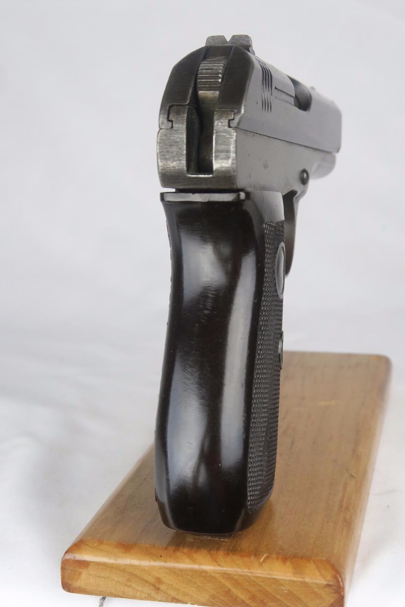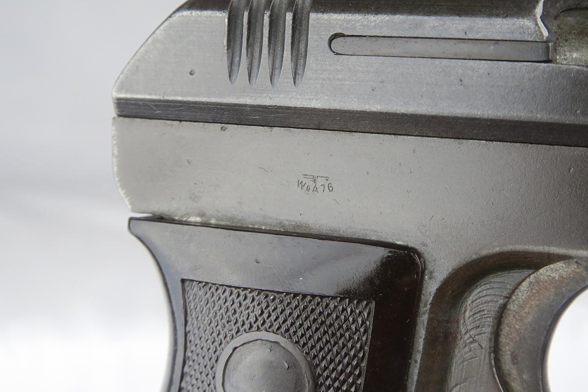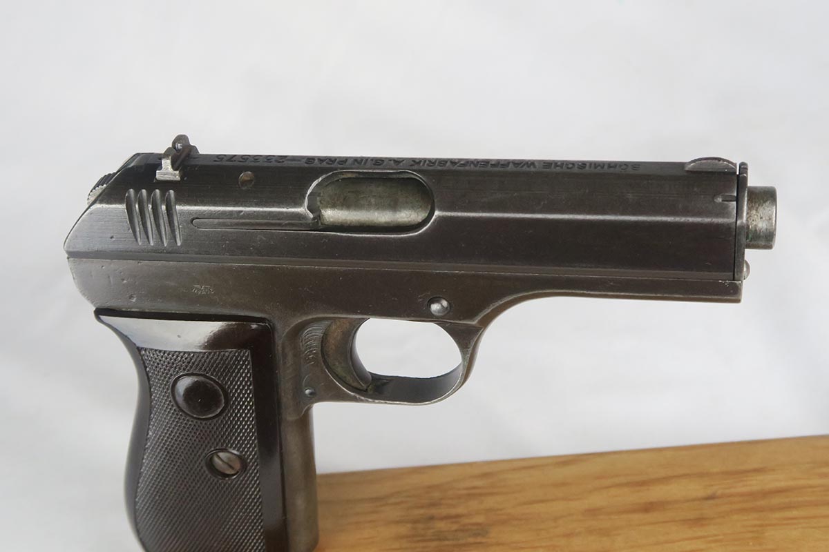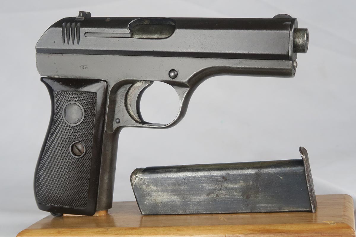 11/20/17 – This is a late-war Nazi CZ-27 in original WW2 condition. The phosphate finish is tough to rate as it is rough and thin, with more finish loss on the front strap and left side. WaA76 proof on right side frame. Excellent grip with no chips or cracks. Strong bore with no major issues. Magazine is marked P. MOD 27 on bottom and shows some corrosion on the baseplate.
