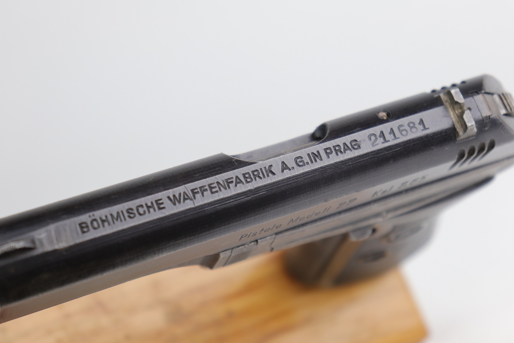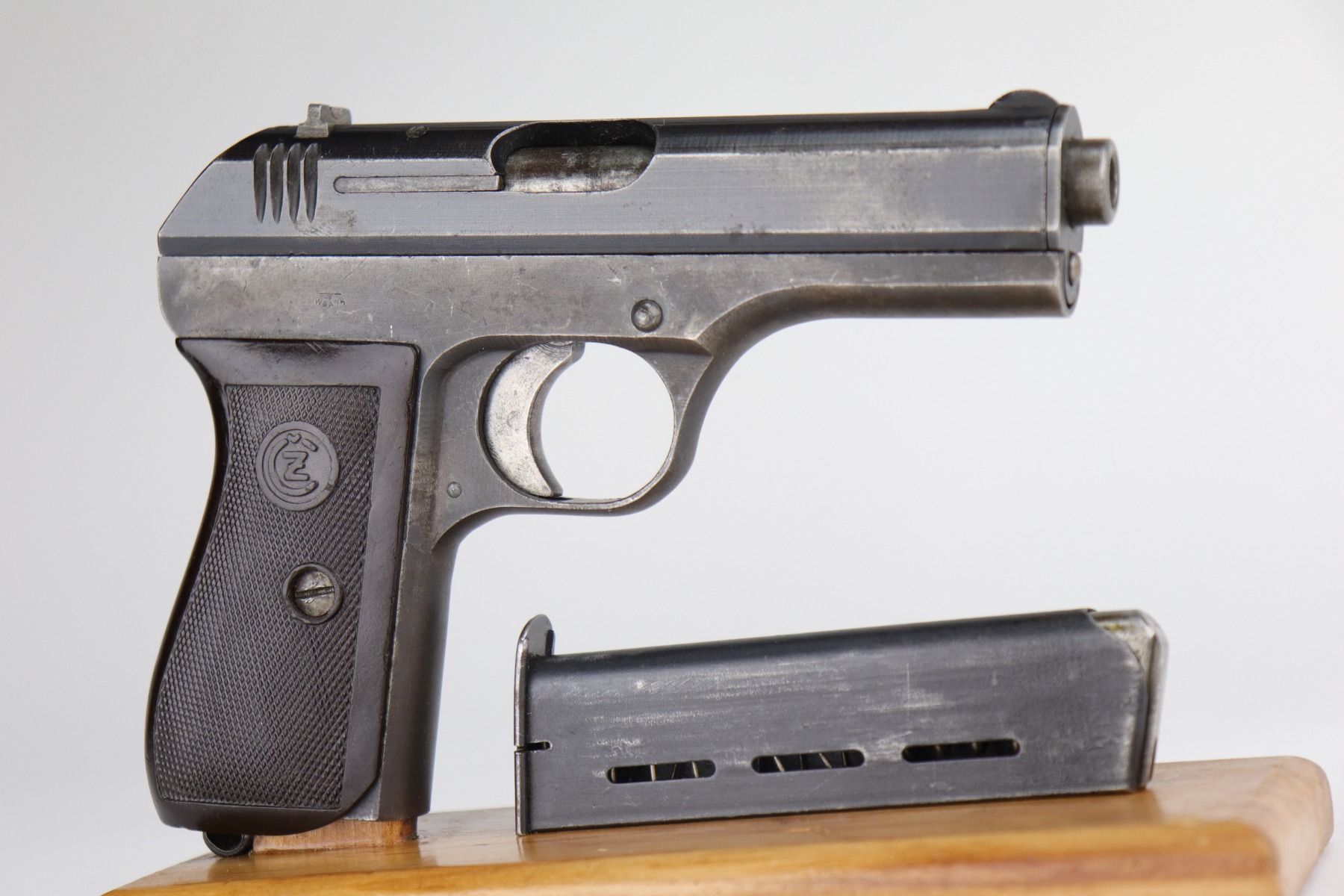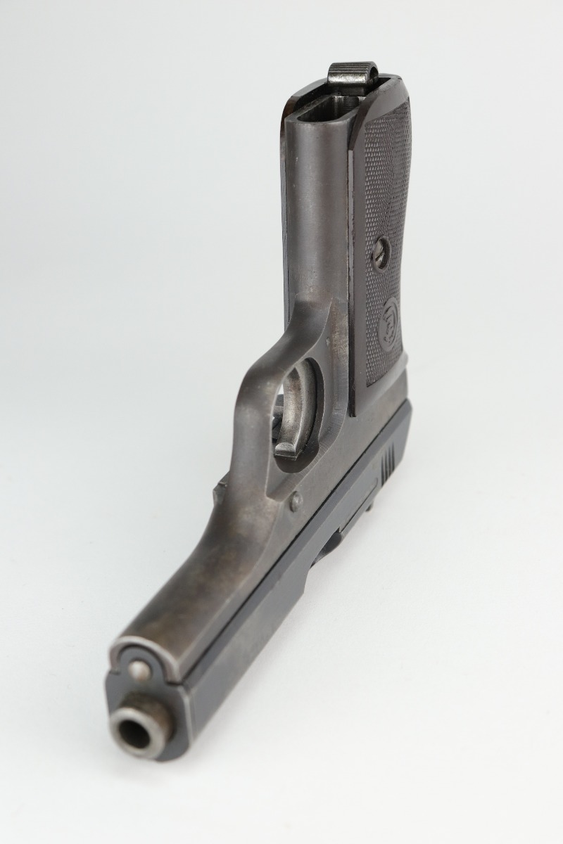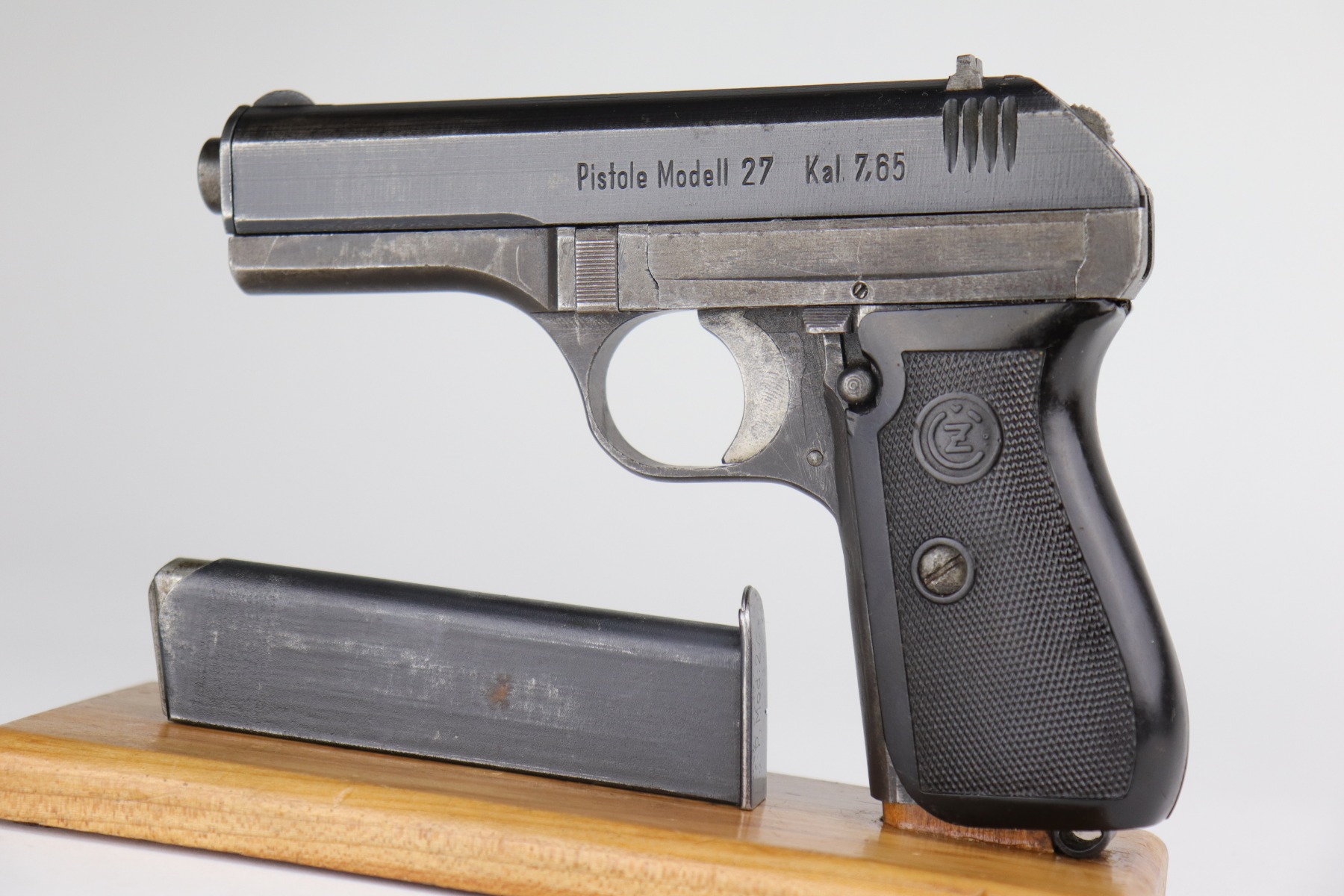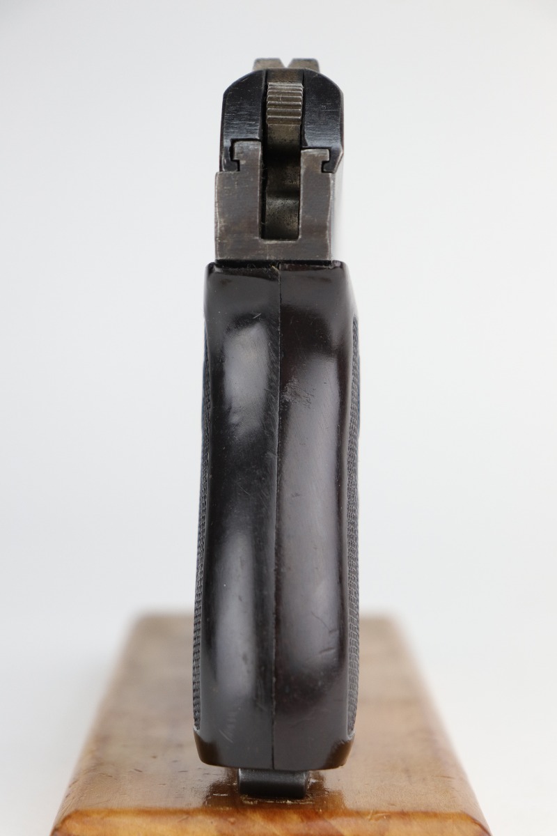 12/31/20 – This is a nice, honest example of a CZ 27 issued to the Nazi military during WW2. This one is all correct and has the proper Nazi military proof. It has retained roughly 75% of its original finish. There is spotty wear, discoloration, oxidation throughout. It comes with a nice grip that was cut in half along the spine, and the bottom edges were rounded. It comes with one proper magazine. Very nice bore – shiny with strong rifling and just a few areas of freckling near the muzzle.