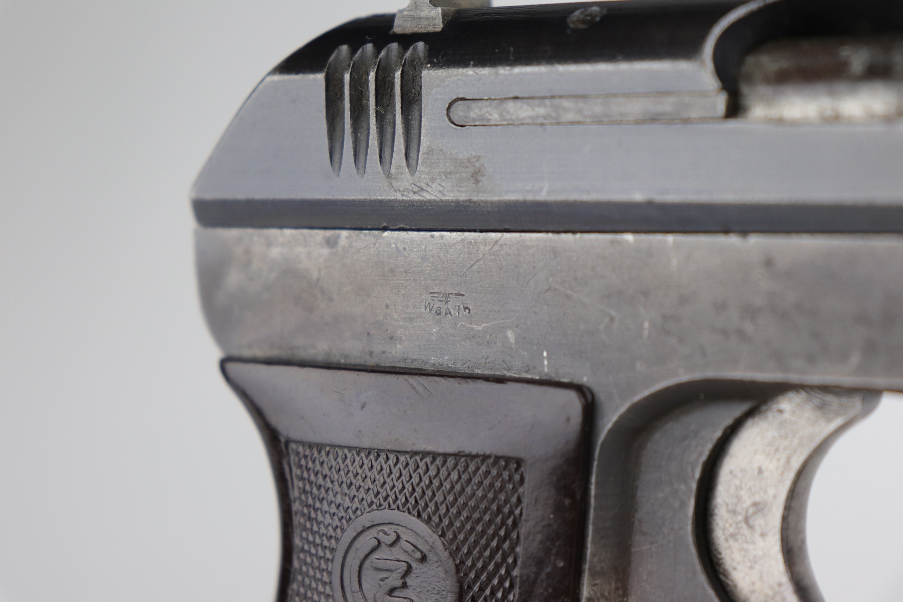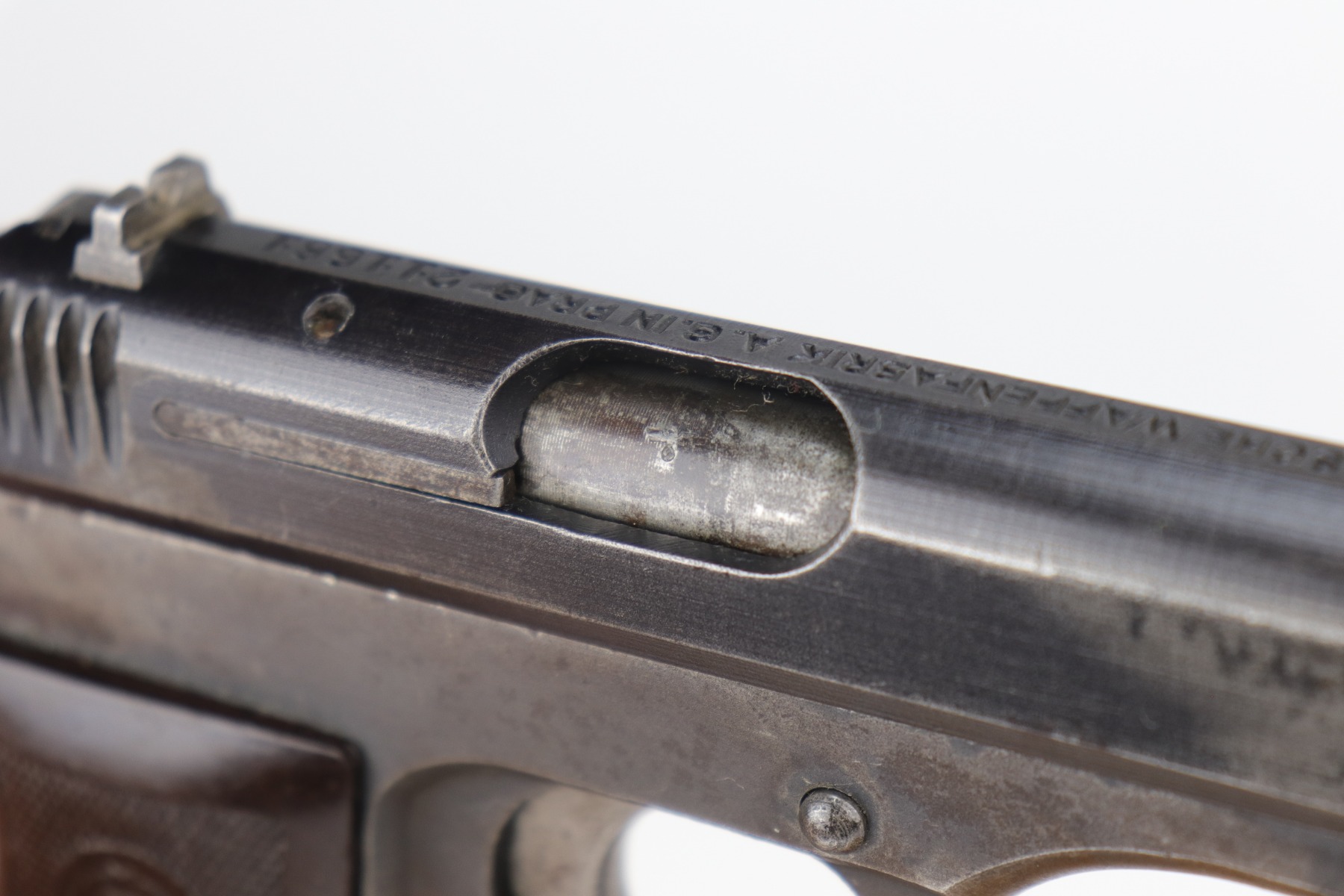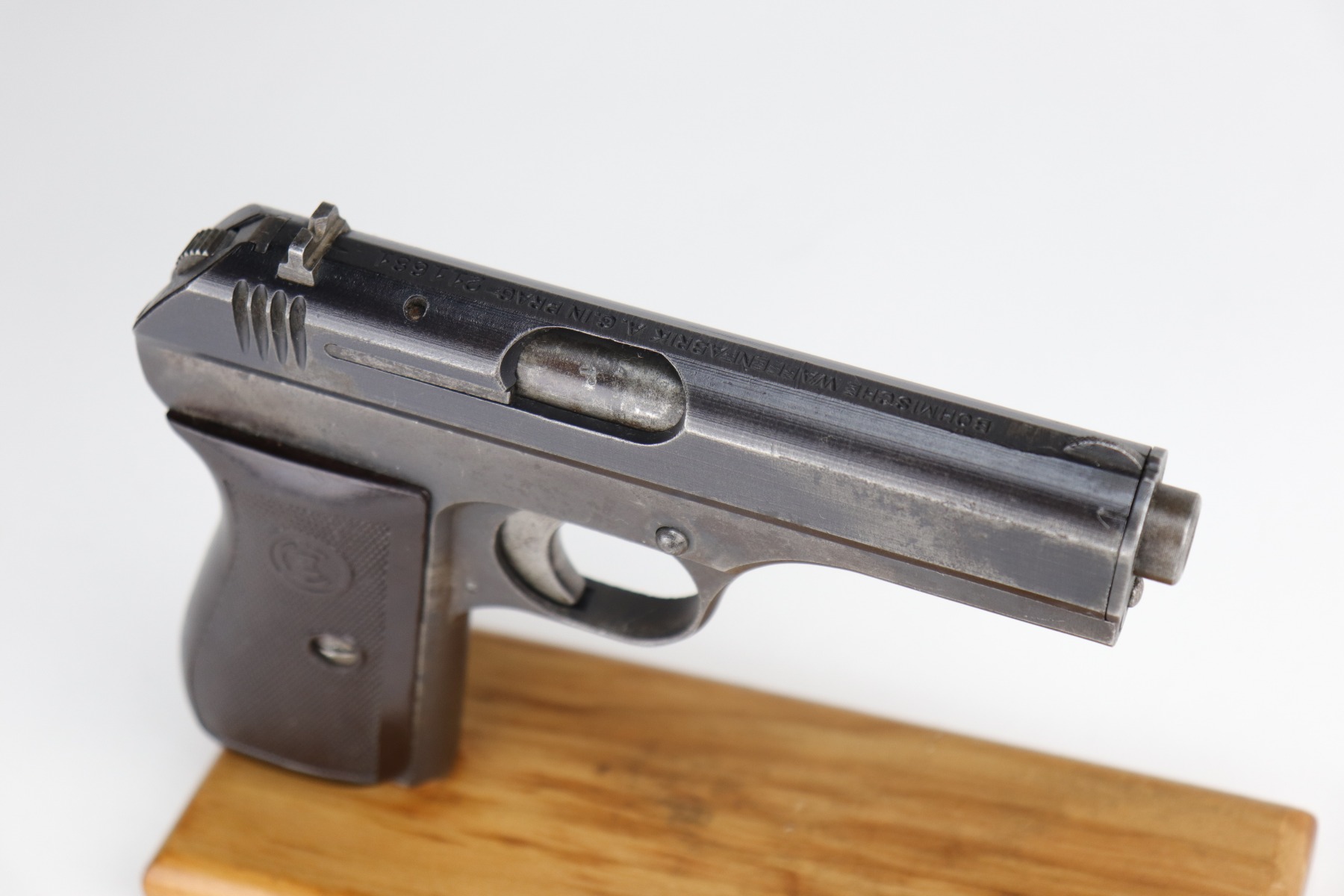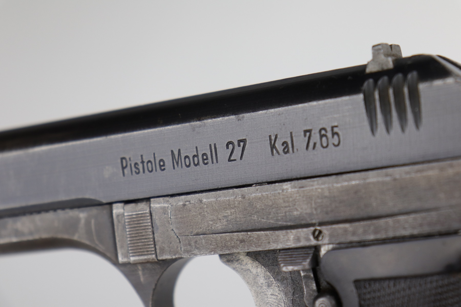 12/31/20 – This is a nice, honest example of a CZ 27 issued to the Nazi military during WW2. This one is all correct and has the proper Nazi military proof. It has retained roughly 75% of its original finish. There is spotty wear, discoloration, oxidation throughout. It comes with a nice grip that was cut in half along the spine, and the bottom edges were rounded. It comes with one proper magazine. Very nice bore – shiny with strong rifling and just a few areas of freckling near the muzzle.