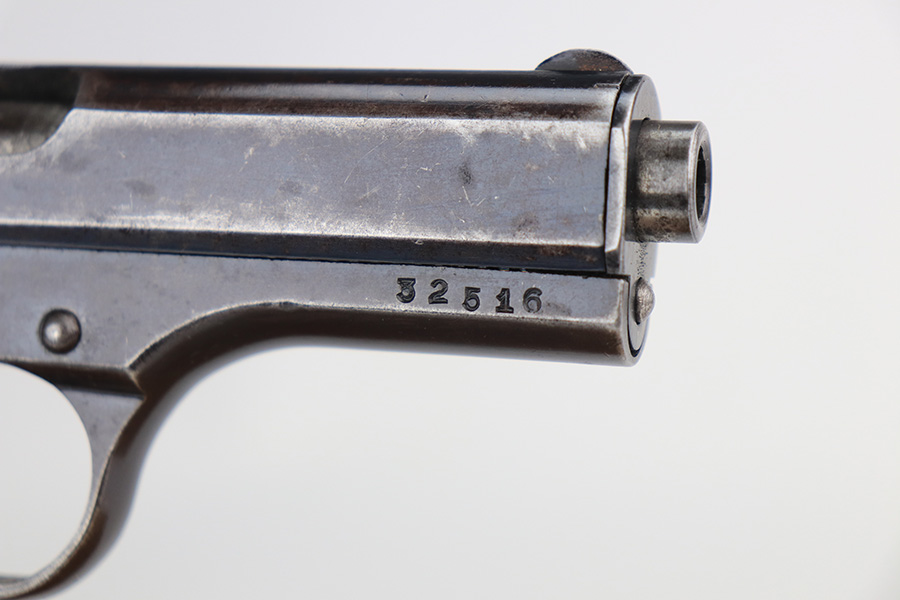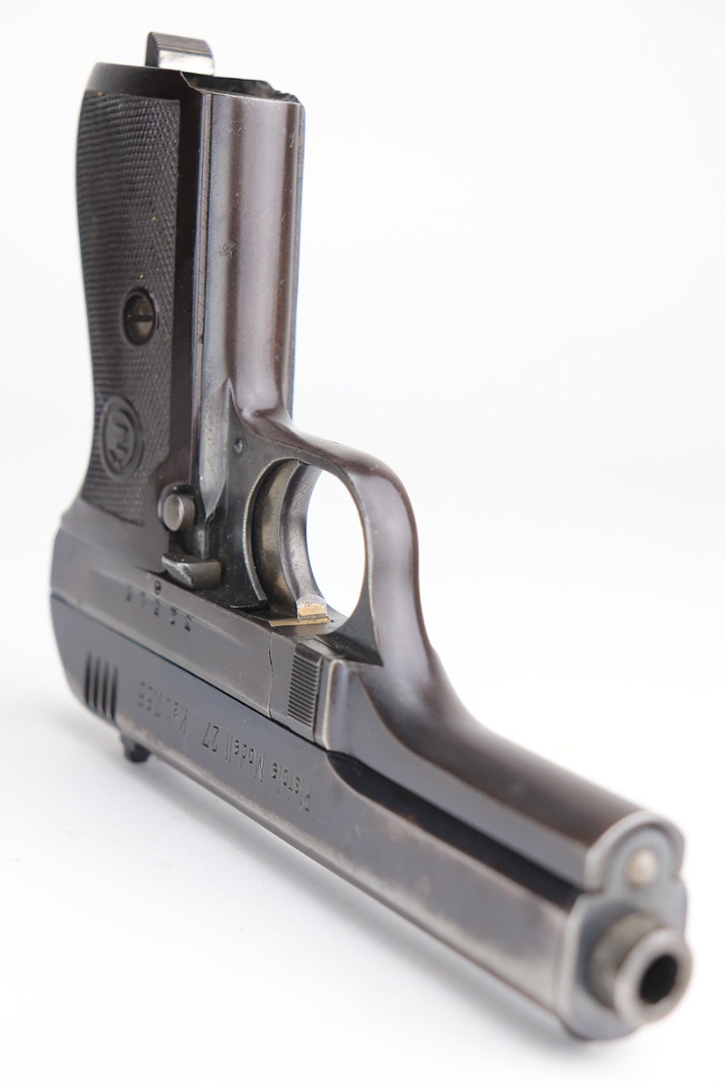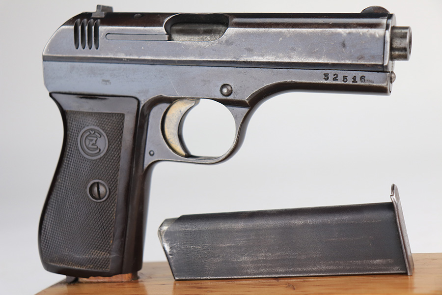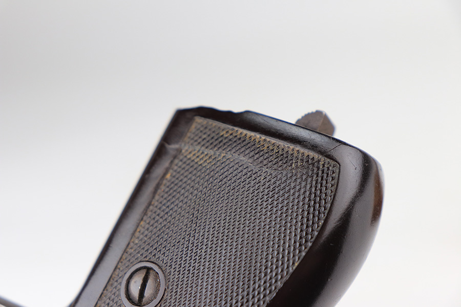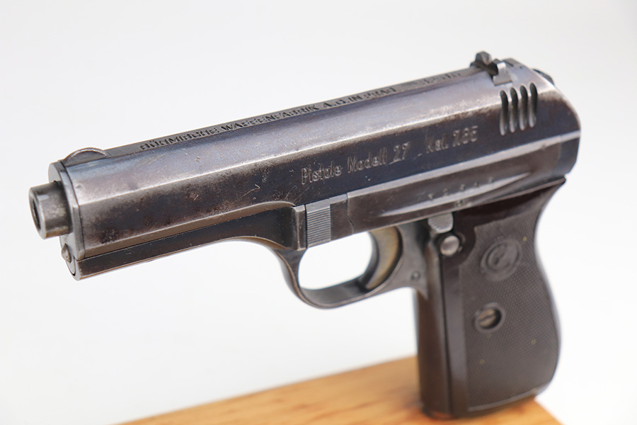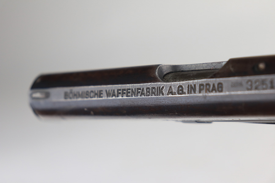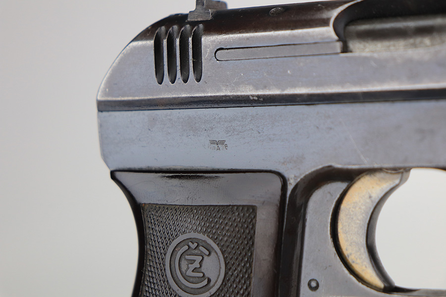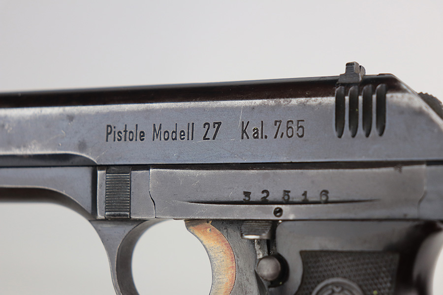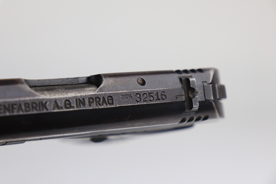 1/19/22 – This is a nice example of a CZ Model 27 issued to the Nazi military during WW2. The gun is all matching and has the proper “Waffen 76” Nazi military acceptance proofs on the slide and frame. It has retained roughly 80-85% of its original finish. Most of the wear is concentrated around the high edges of the slide. There is also light brown patina visible under the finish of most of the gun. Some areas of very light freckling. A few very light scratches on both sides of the slide. Comes with a nice period-correct grip – there are chips in each of the bottom corners and a hairline crack on the right side. Also comes with a period-correct magazine. The bore is near-mint.
