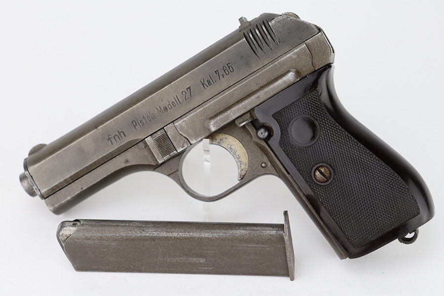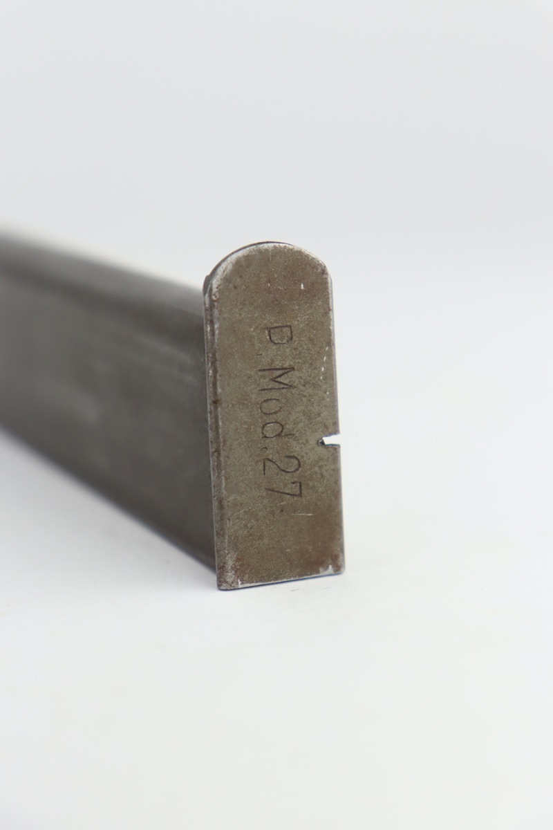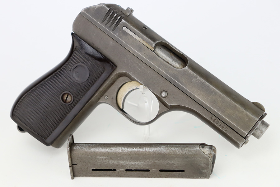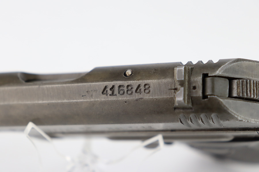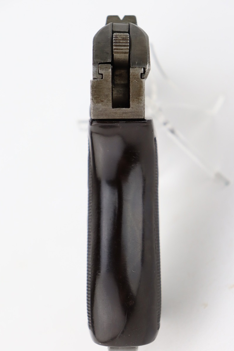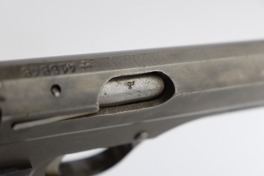 12/14/23 – This is an excellent example of a CZ Model 27 issued to the Nazi military during WW2. It is all matching, has the proper “Waffen 76” military acceptance proof, and has an all-phosphate finish. The finish rates about 97-98% with just hints of high edge wear. While there is very little finish loss, there are some spots of discoloration (typical for these finishes). Excellent period-correct bakelite grip – no cracks or chips. Comes with a really nice all-phosphate magazine. Like-new bore.