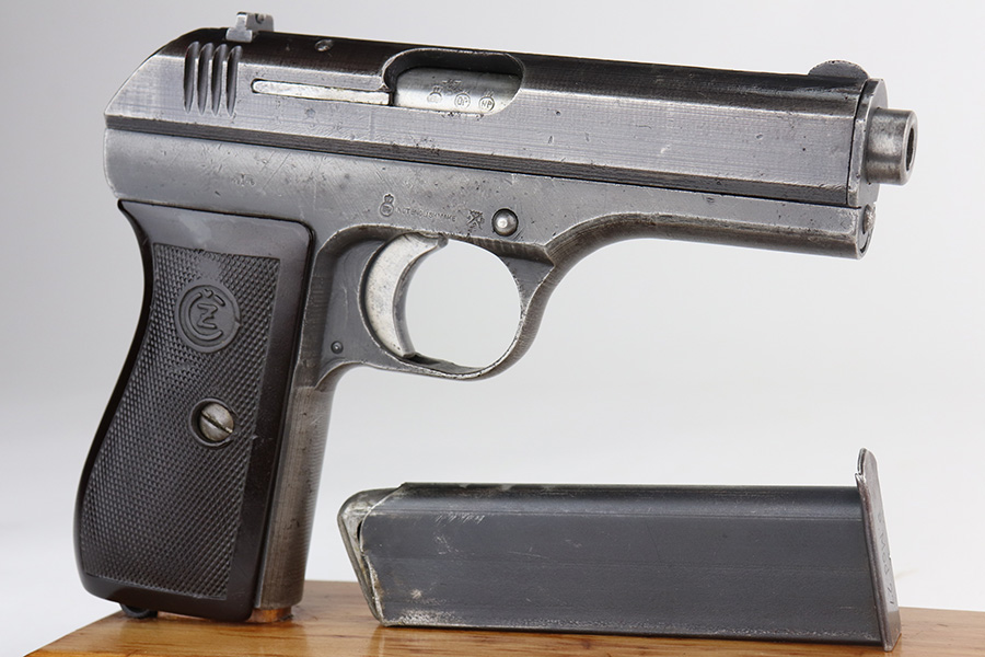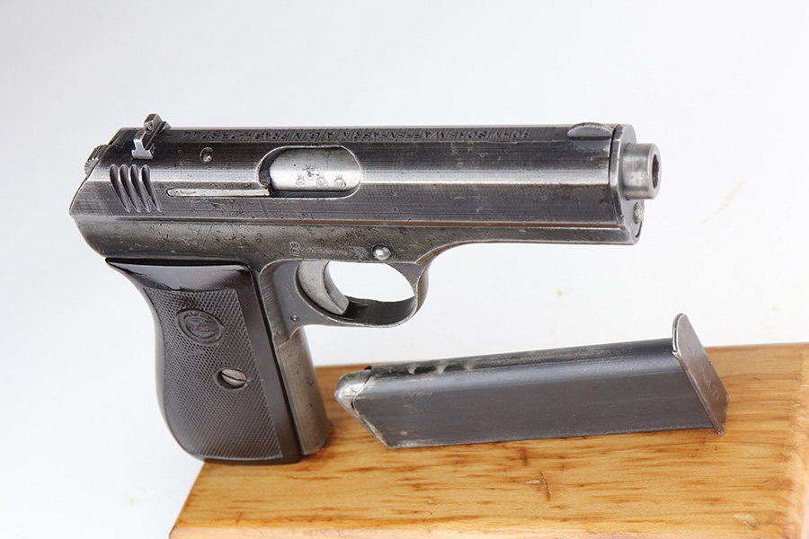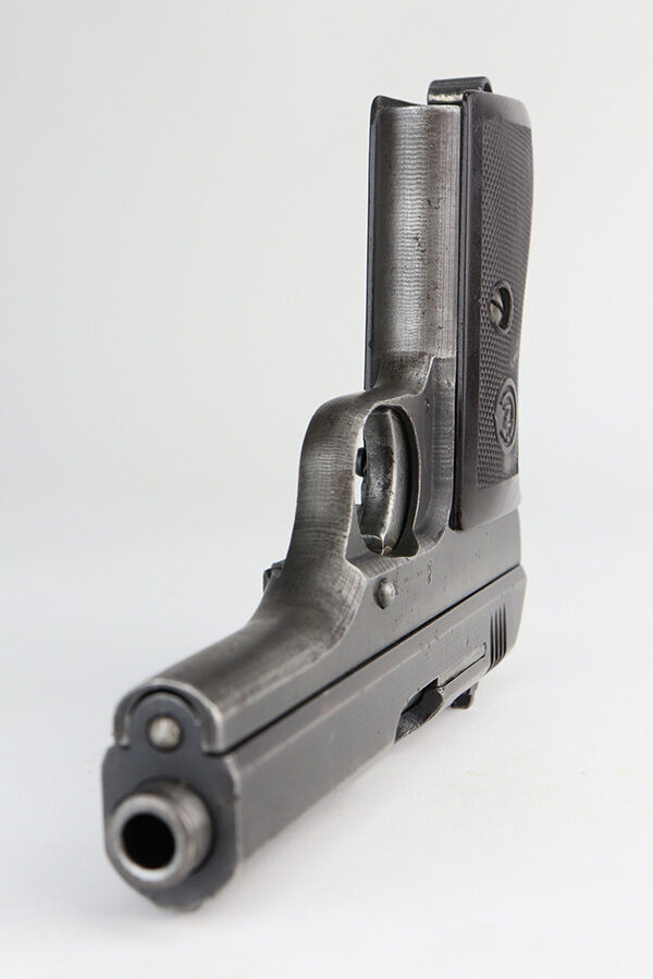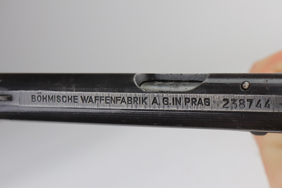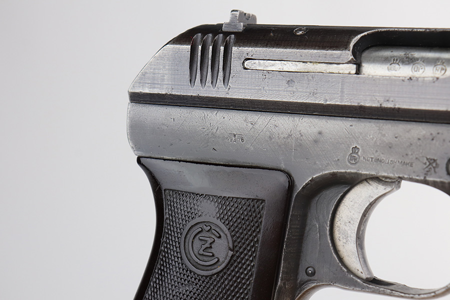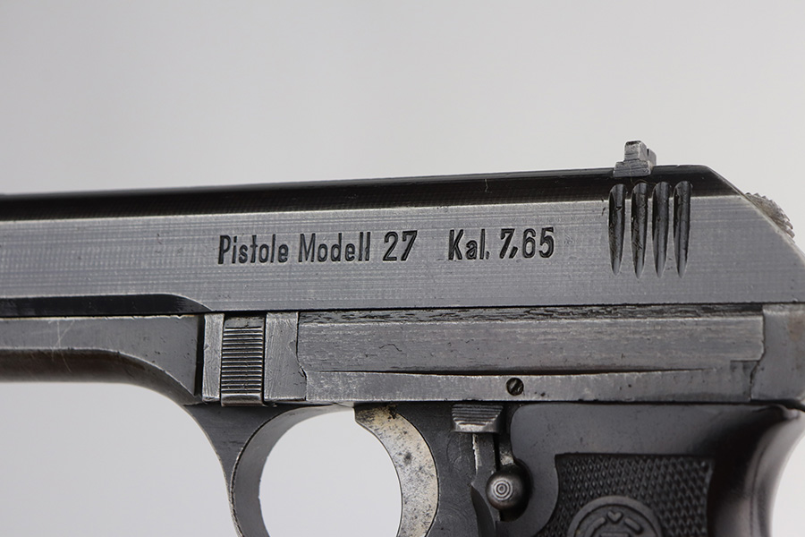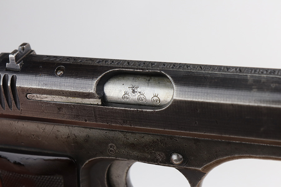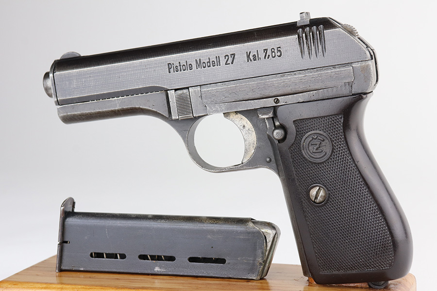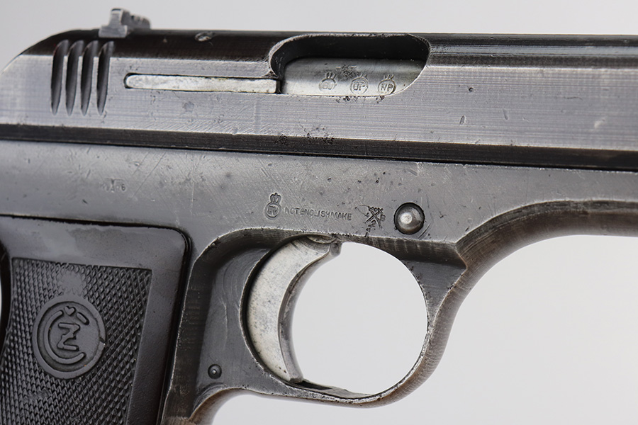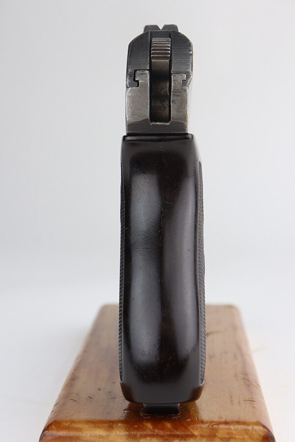 6/9/21 – This is a nice example of a CZ 27 that was issued to the Nazi military during WW2. It is matching and has the proper “Waffen 76” military proofs. This one also has British proofs and a “Not English Made” marking, indicating this one was capture by the British military. It has retained about 80-85% of its original finish. There is thinning on the front strap and minor wear around the high edges. Tiny dots of oxidation here and there. Comes with a very nice grip – very small chip in the bottom left corner. Also comes with a period-correct magazine. Mint bore.