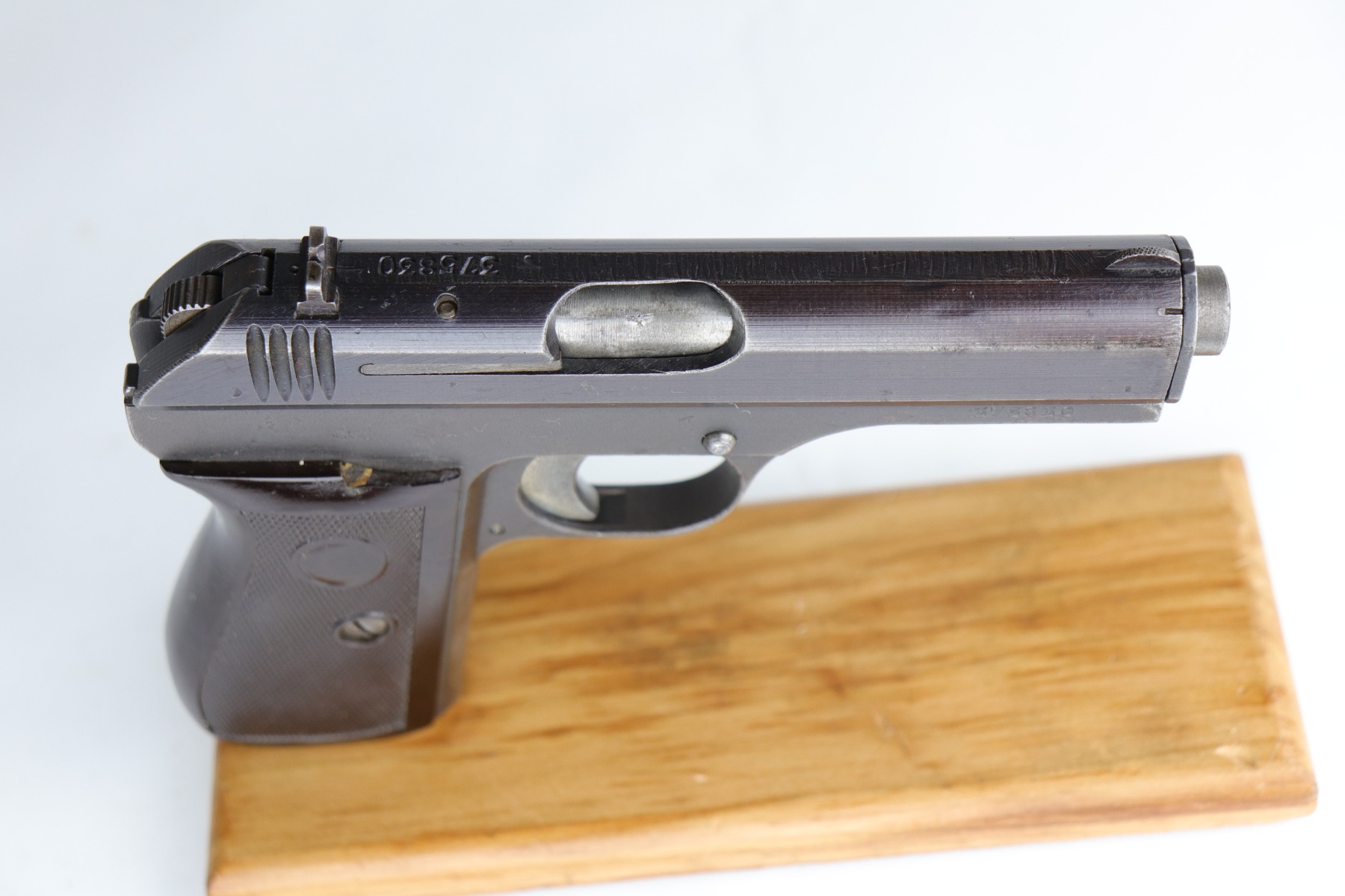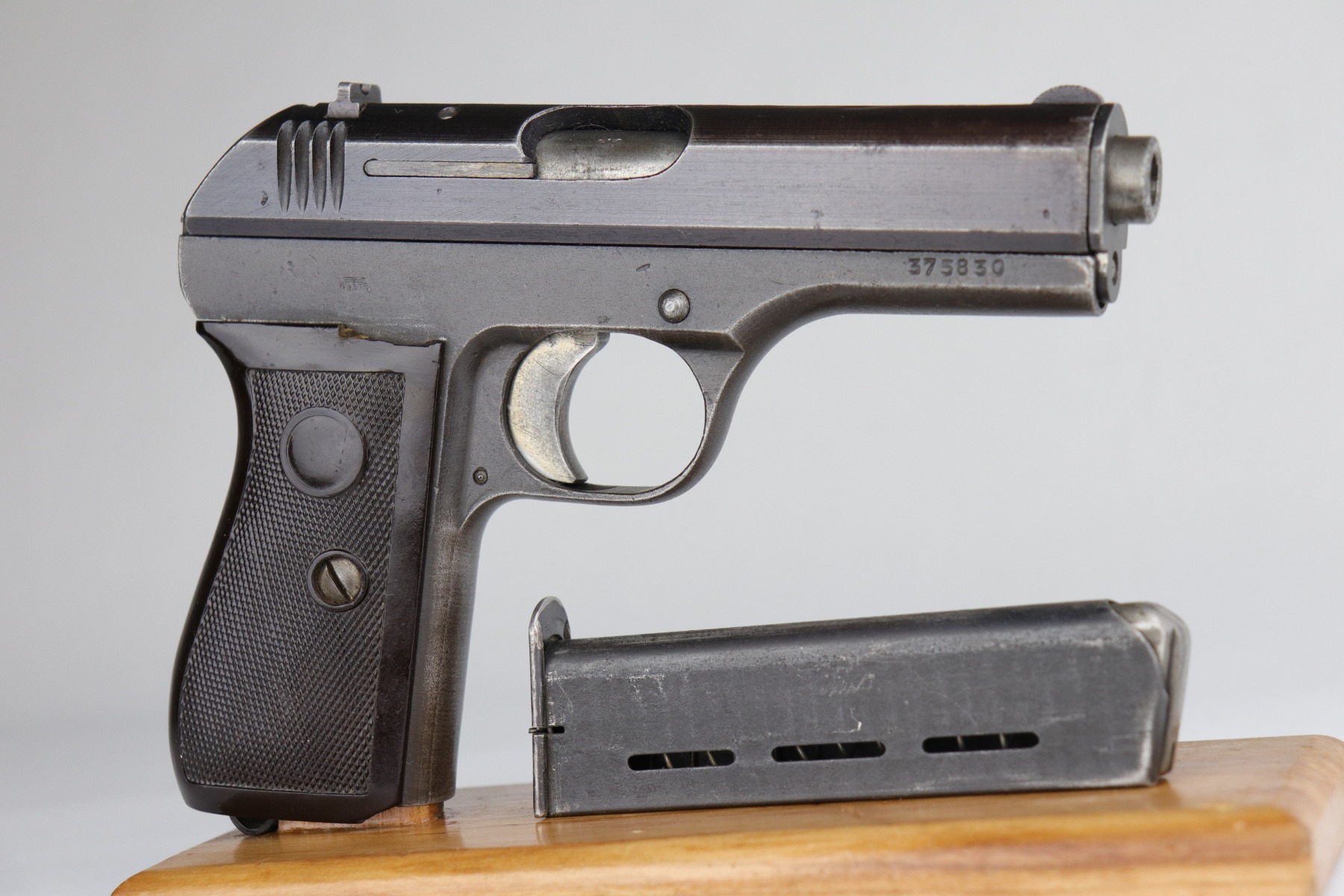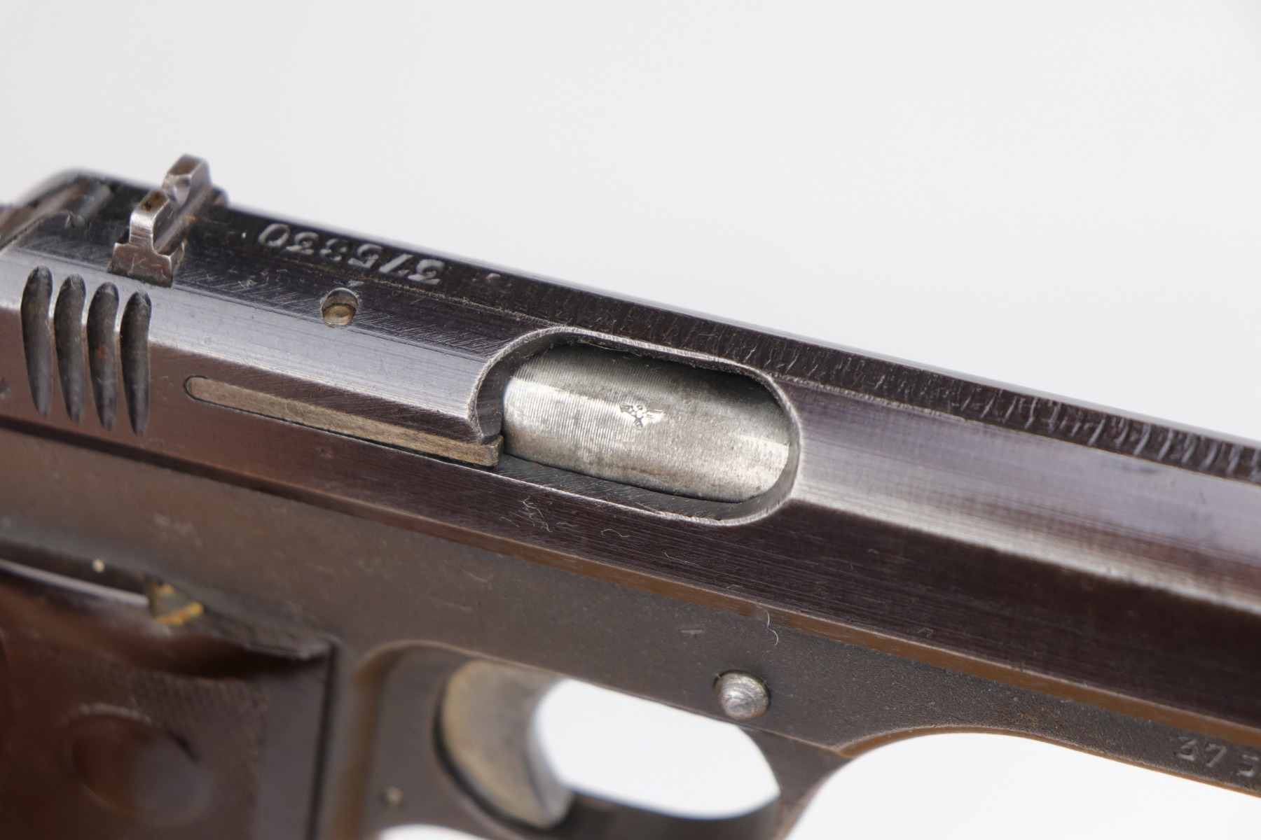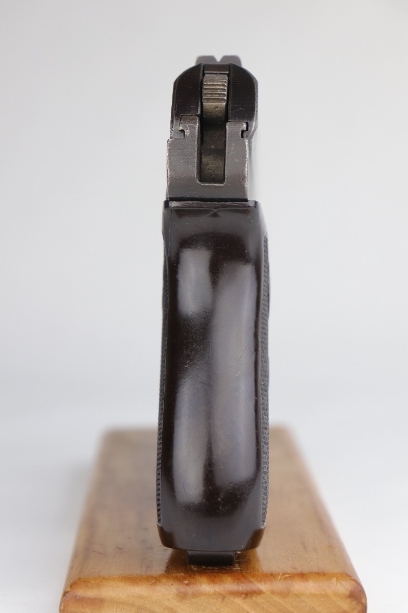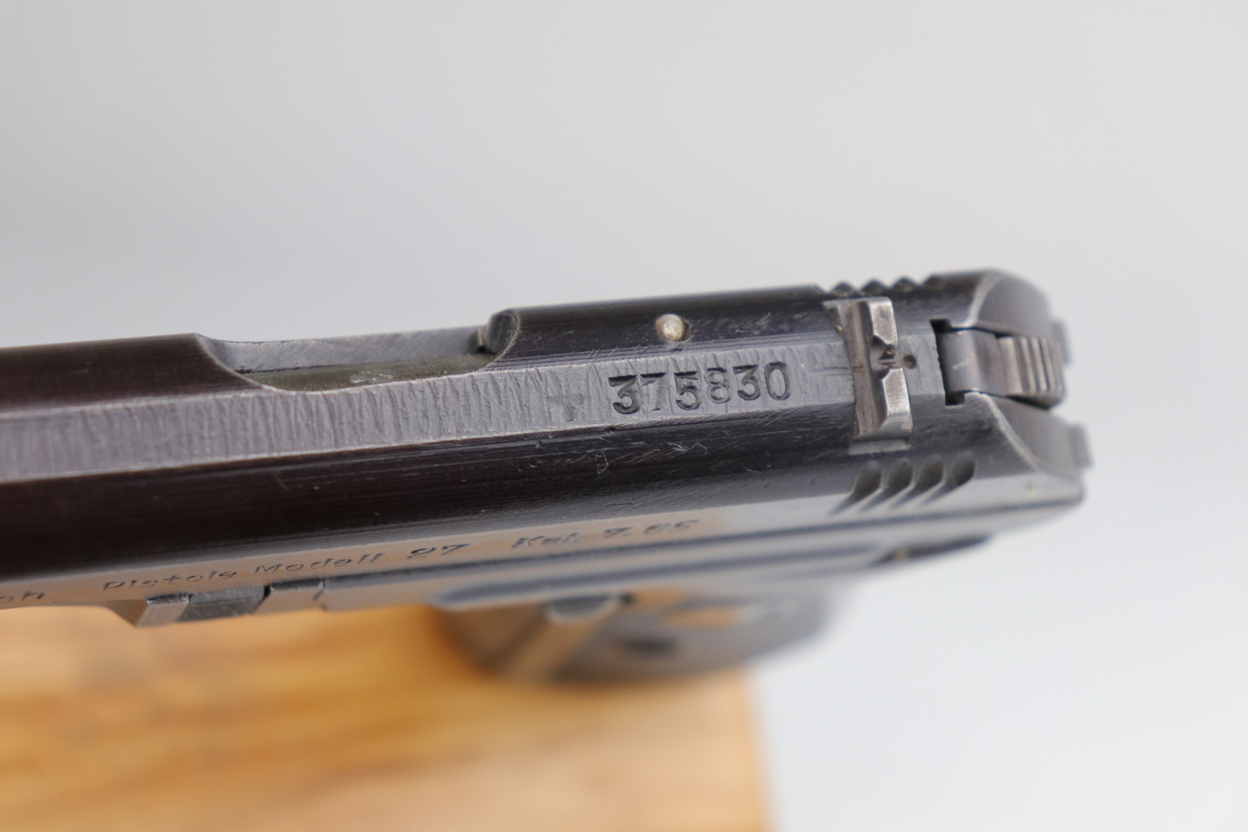 7/21/20 – This is a WW2 Nazi military-issued CZ 27 pistol, chambered in 7.65mm. The gun is all matching is properly waffenamt on the right side of the frame. It is of the “fnh” variation. It has a characteristic military blued finish. It has retained around 92% of its original bluing. Most of the wear is thinning on the front strap. There is also minor muzzle and high edge wear. The grips are excellent except for very small chips in the bottom corners (typical). The bore is shiny with strong rifling. Comes with a period-correct magazine.