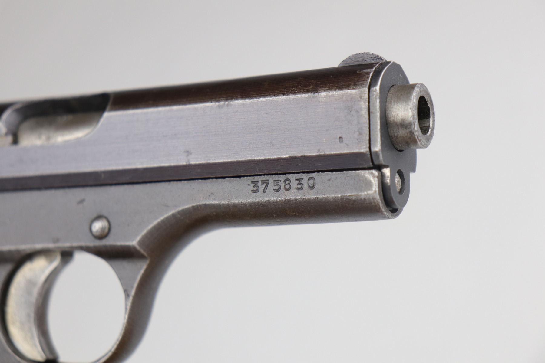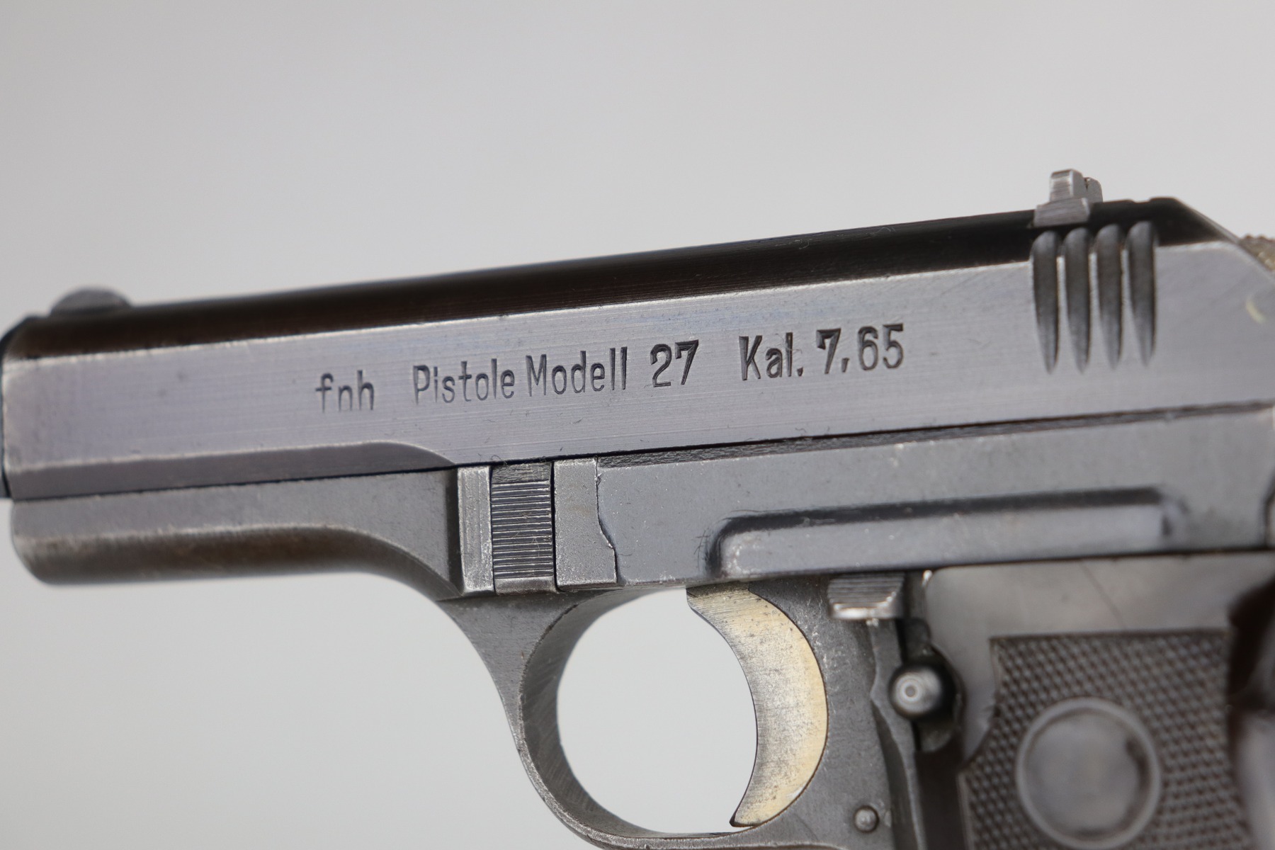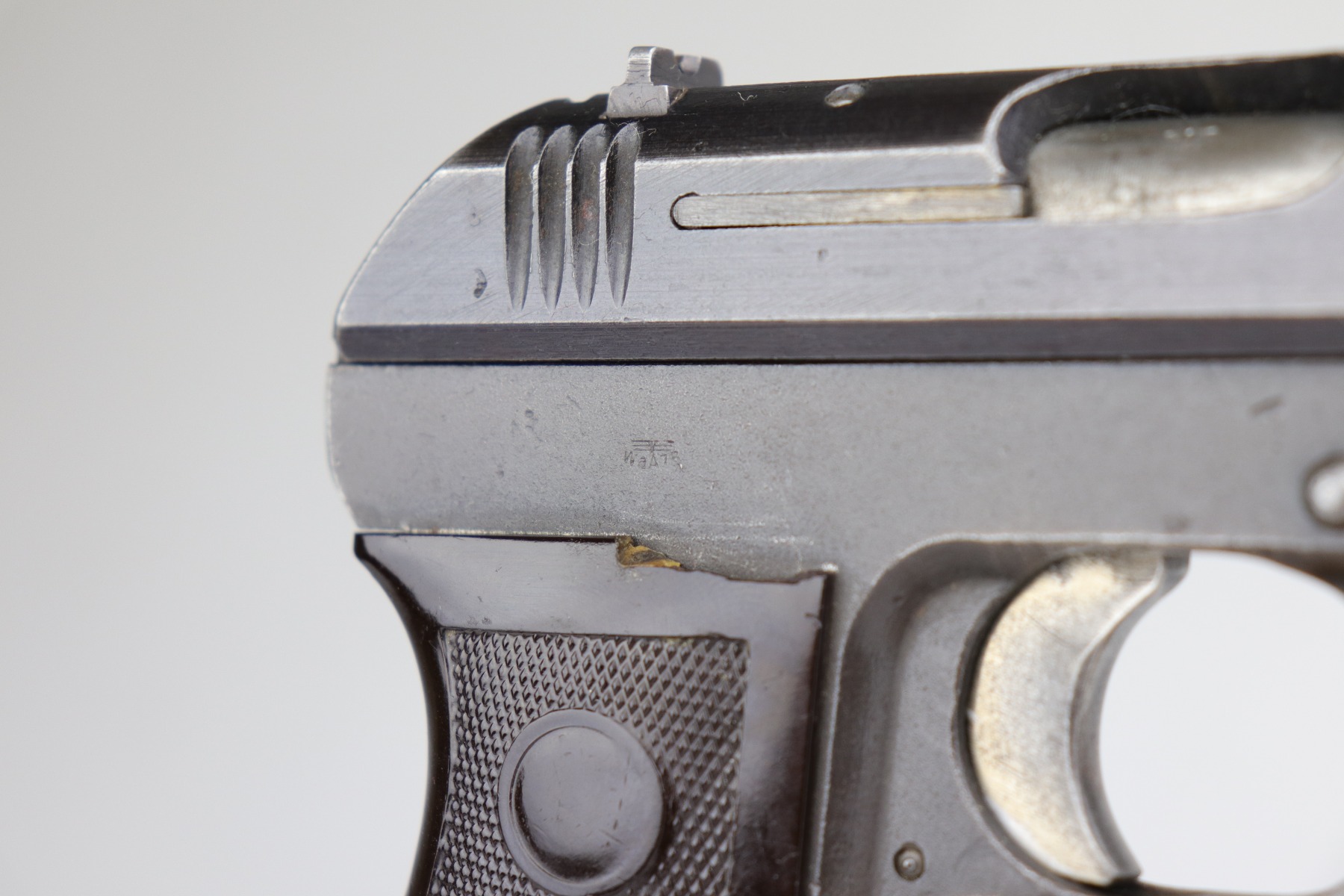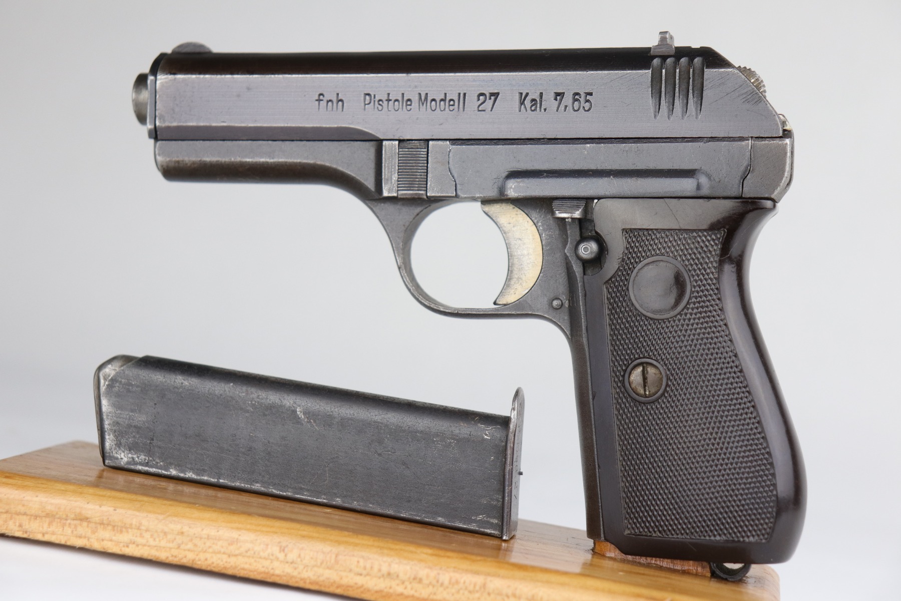 7/21/20 – This is a WW2 Nazi military-issued CZ 27 pistol, chambered in 7.65mm. The gun is all matching is properly waffenamt on the right side of the frame. It is of the “fnh” variation. It has a characteristic military blued finish. It has retained around 92% of its original bluing. Most of the wear is thinning on the front strap. There is also minor muzzle and high edge wear. The grips are excellent except for very small chips in the bottom corners (typical). The bore is shiny with strong rifling. Comes with a period-correct magazine.