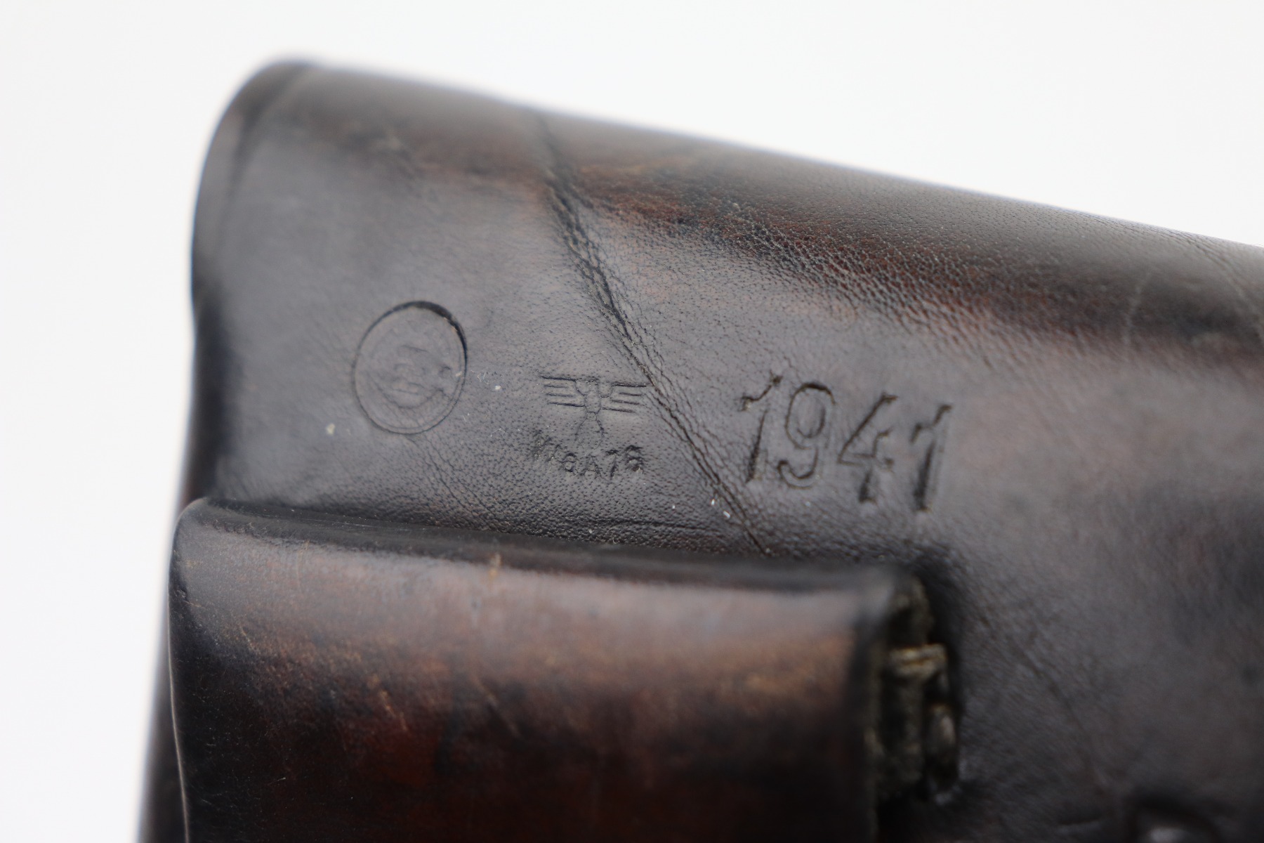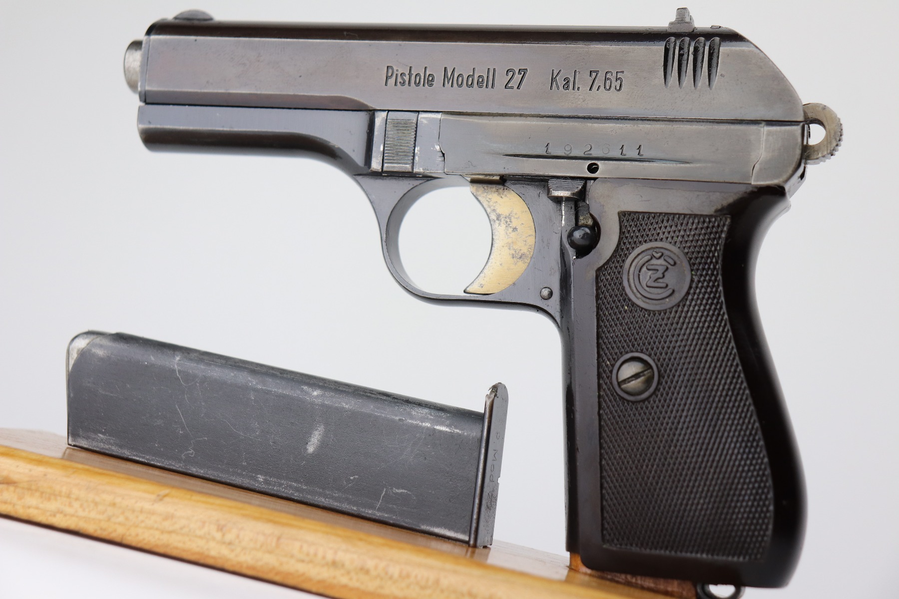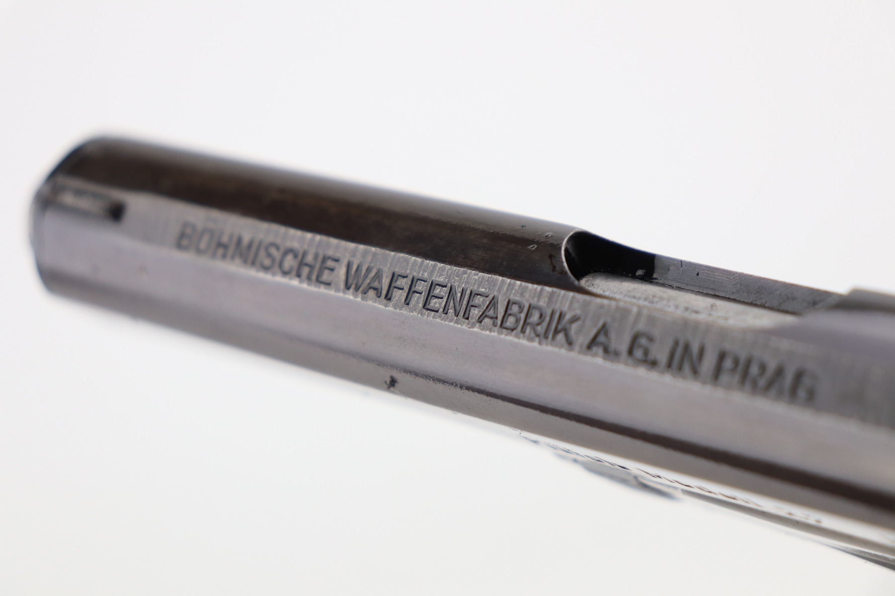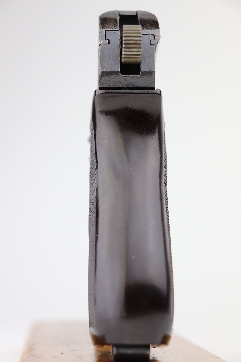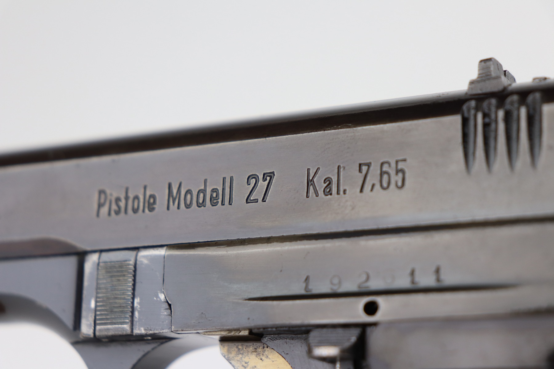 3/29/21 – This is a very nice example of a CZ 27 Rig issued to the Nazi military during WW2. The gun is all matching and has the proper waffen military proof. The rig comes with an excellent 1941-dated waffen-proofed holster, two period-correct magazines, and a custom Pelican-style hard case. The gun has retained roughly 85% of its high polish finish. There are areas of wear on the front strap and left side of the frame. Thinning and light patina on the slide throughout. Excellent grip – no cracks or chips. Excellent bore – shiny with strong rifling with very minor freckling here and there.