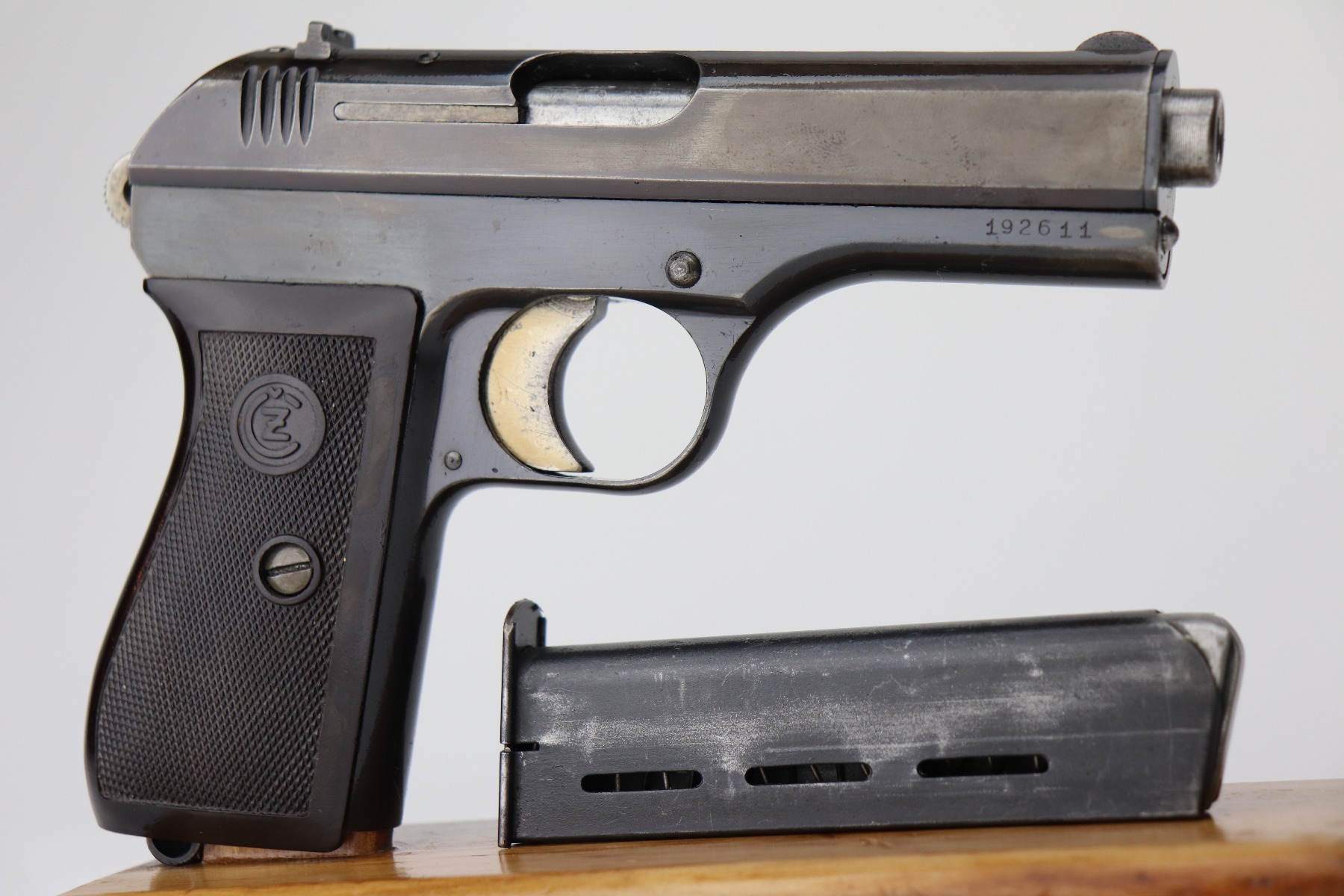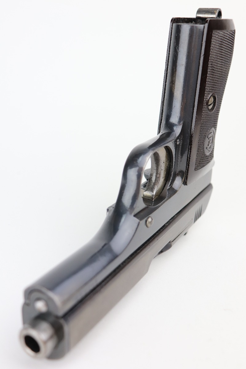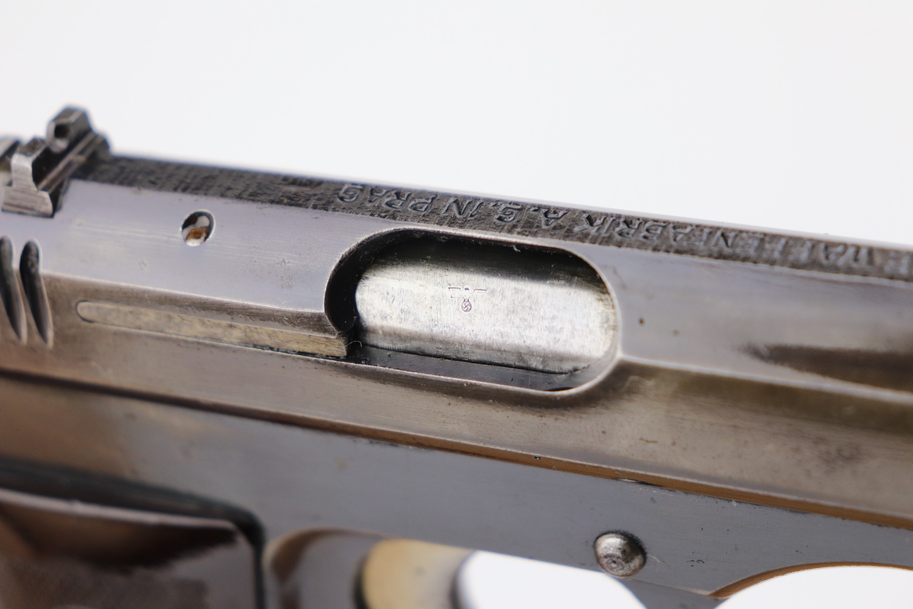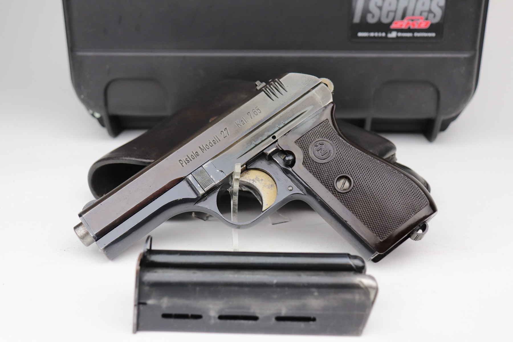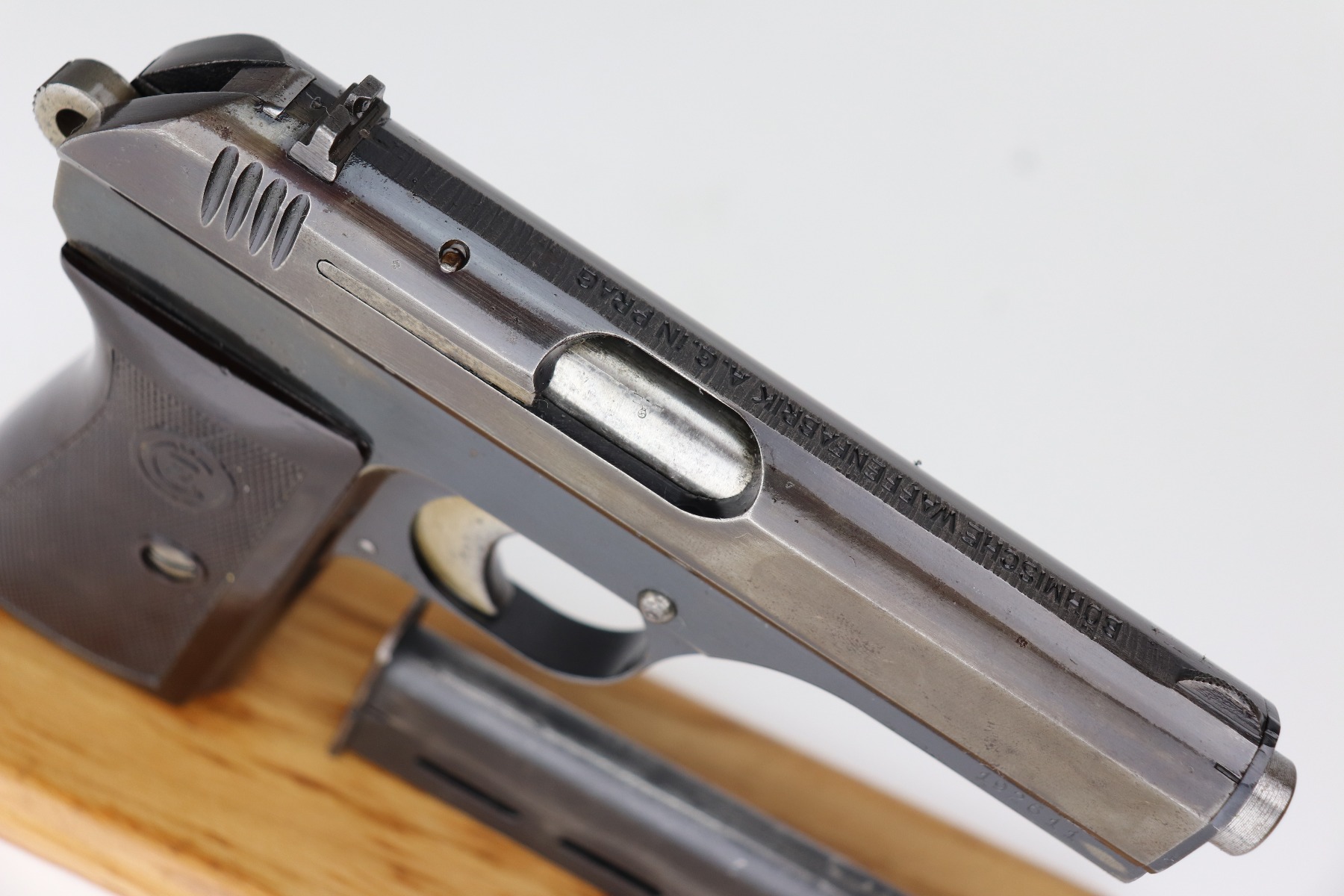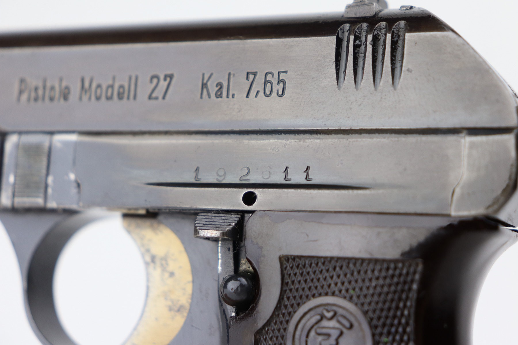 3/29/21 – This is a very nice example of a CZ 27 Rig issued to the Nazi military during WW2. The gun is all matching and has the proper waffen military proof. The rig comes with an excellent 1941-dated waffen-proofed holster, two period-correct magazines, and a custom Pelican-style hard case. The gun has retained roughly 85% of its high polish finish. There are areas of wear on the front strap and left side of the frame. Thinning and light patina on the slide throughout. Excellent grip – no cracks or chips. Excellent bore – shiny with strong rifling with very minor freckling here and there.
