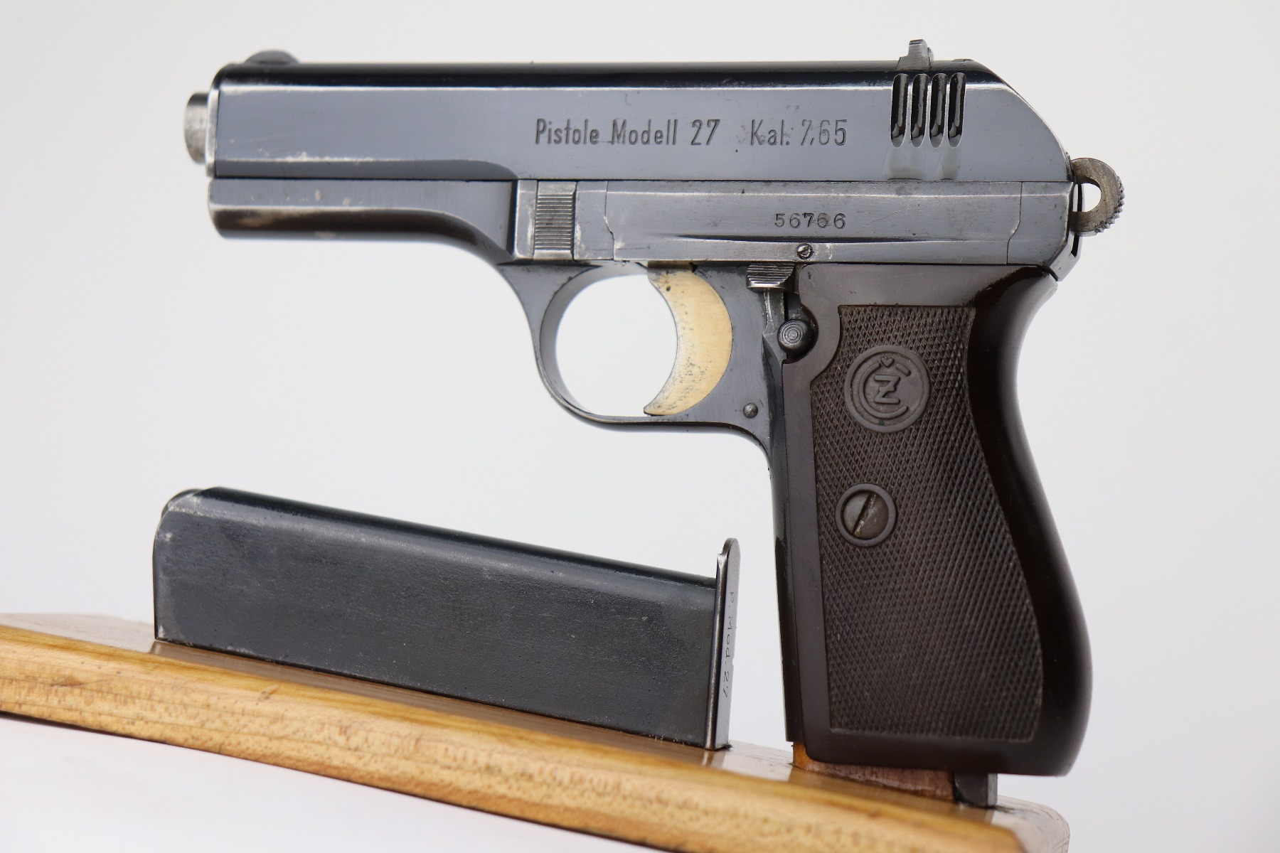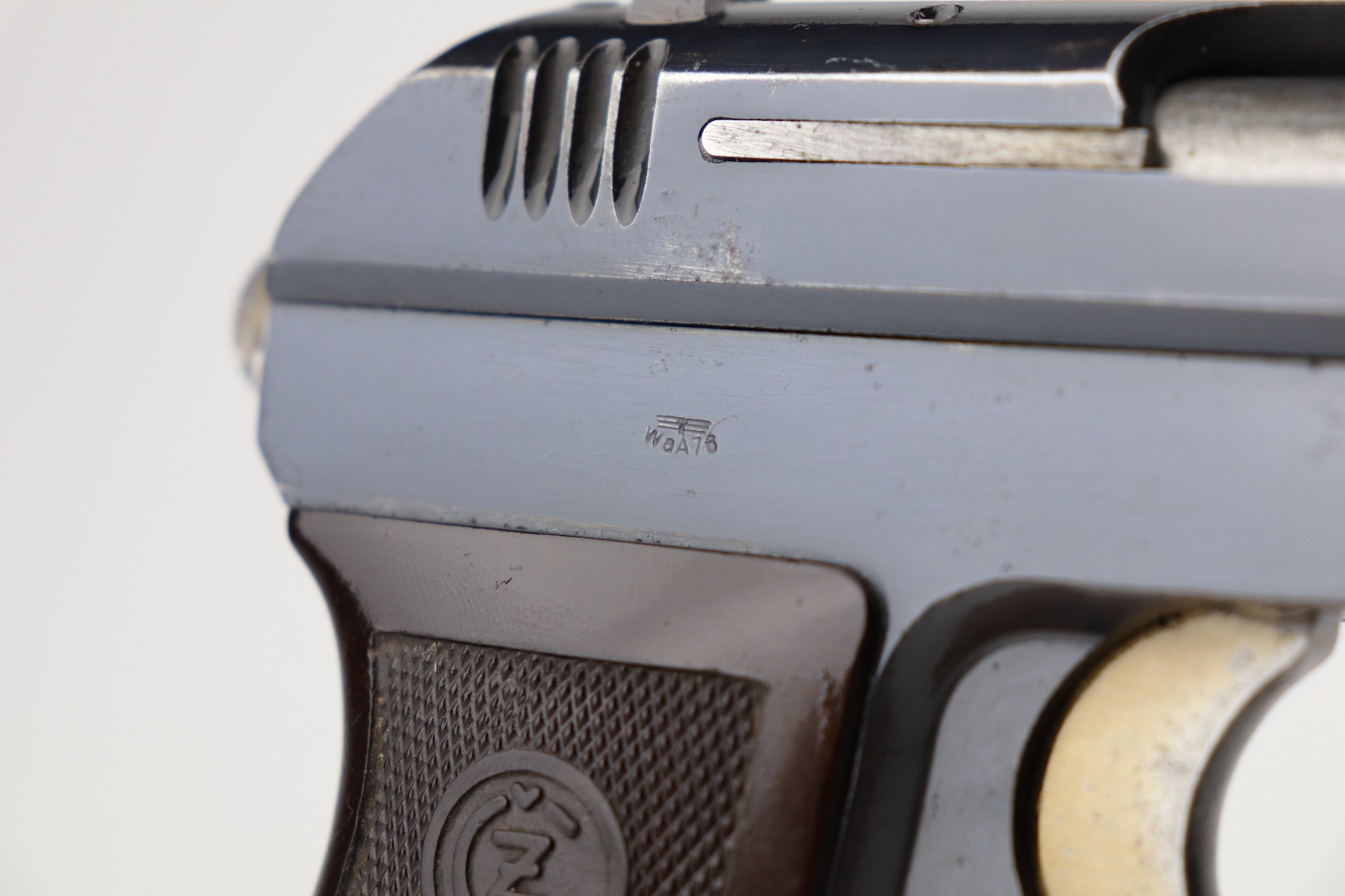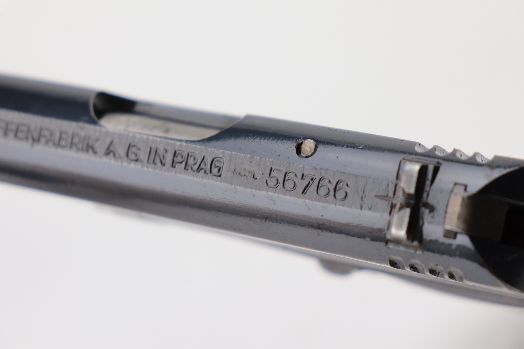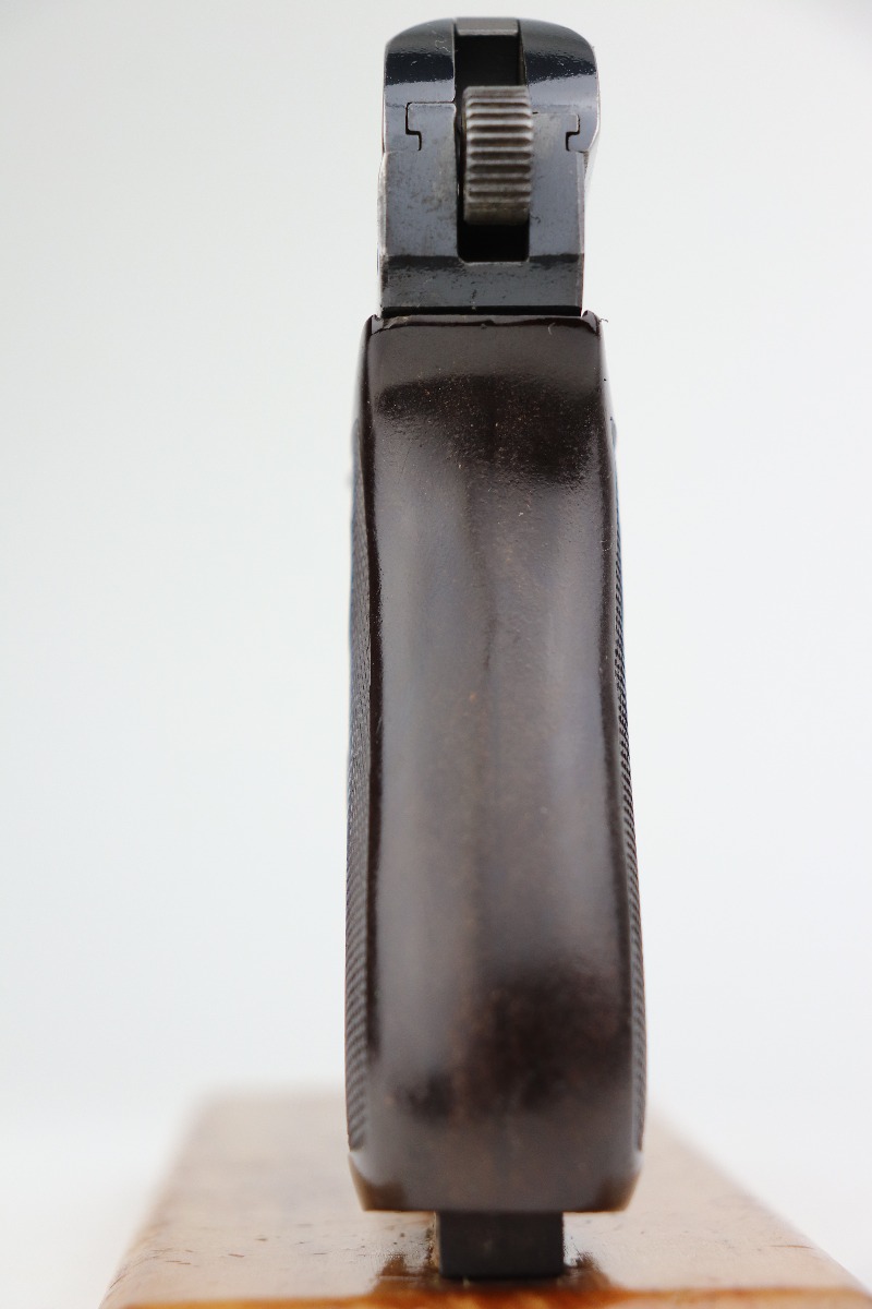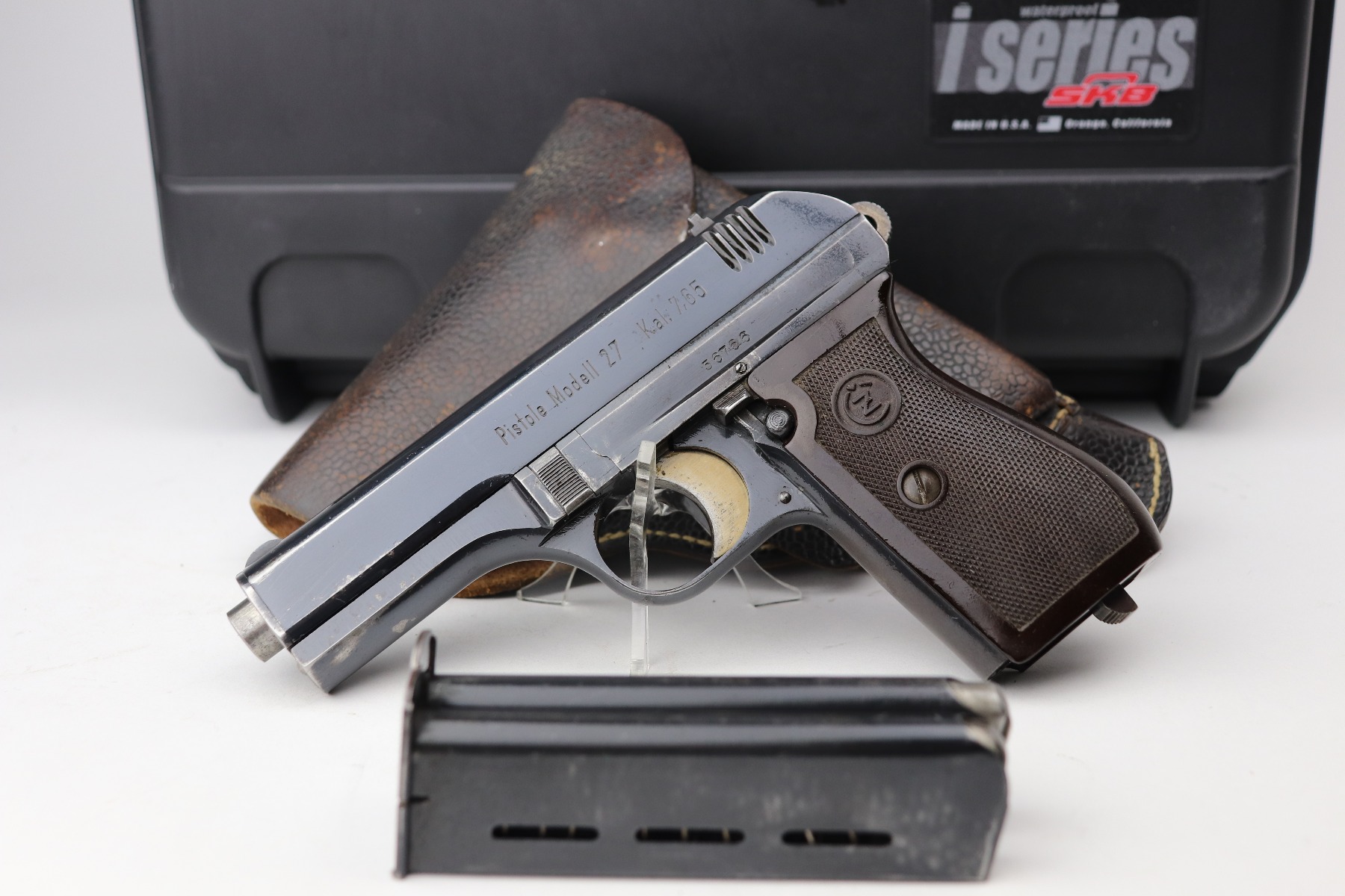 3/29/21 – This is a very nice example of a CZ 27 Rig issued to the Nazi military during WW2. The gun is all matching and has the proper waffen military proof. The rig comes with a nice pebble grain waffen-proofed holster, two period-correct magazines, and a custom Pelican-style hard case. The gun has retained about 92% of its original high polish finish. There are areas of wear around the high edges of the slide, the front strap, under the frame near the muzzle, and on the right side of the slide. Tiny dots of oxidation here and there. Very nice grip with a very small chip on the bottom of the right side. The bore is minty.
