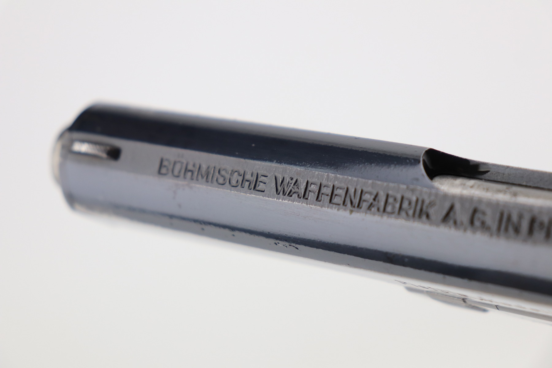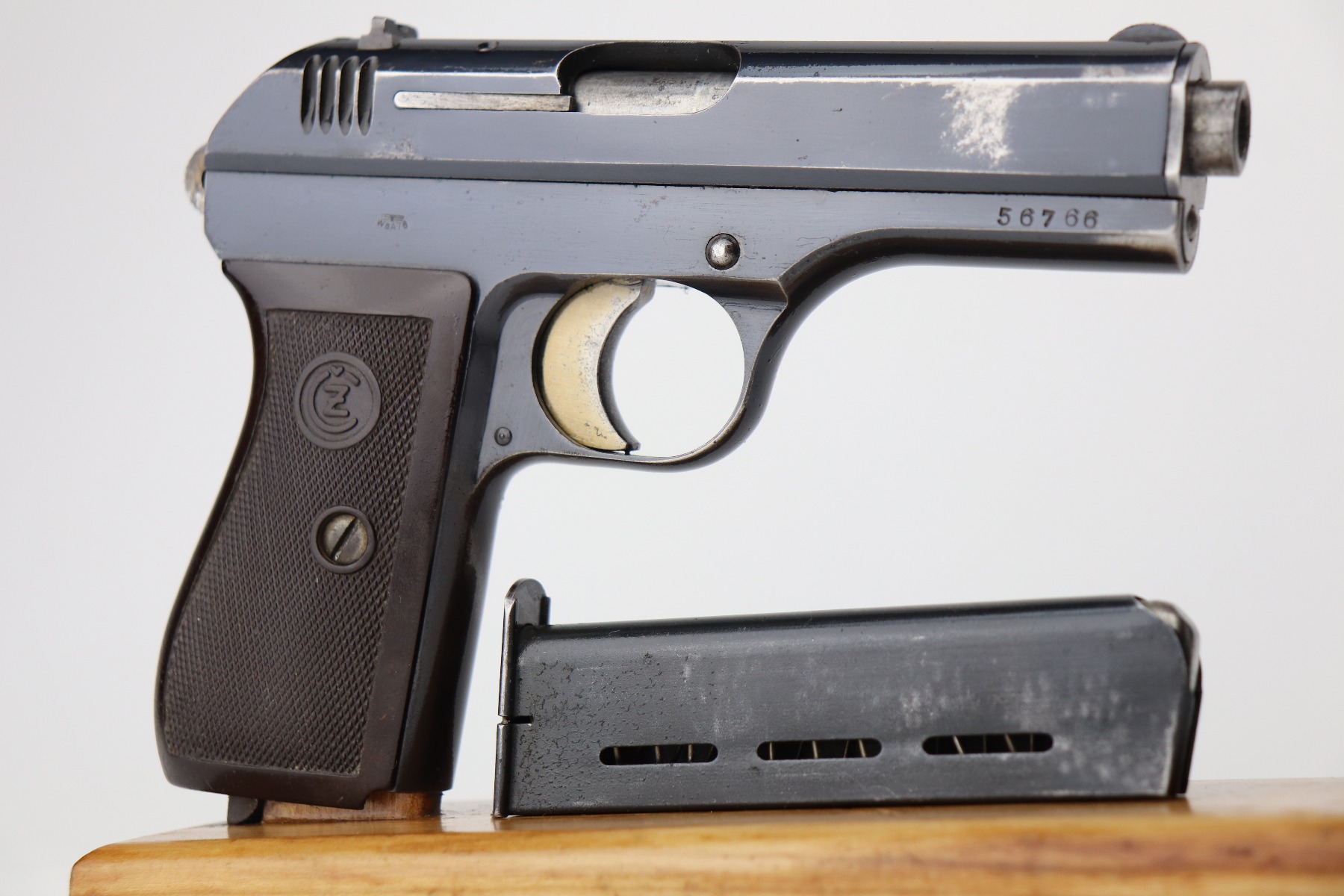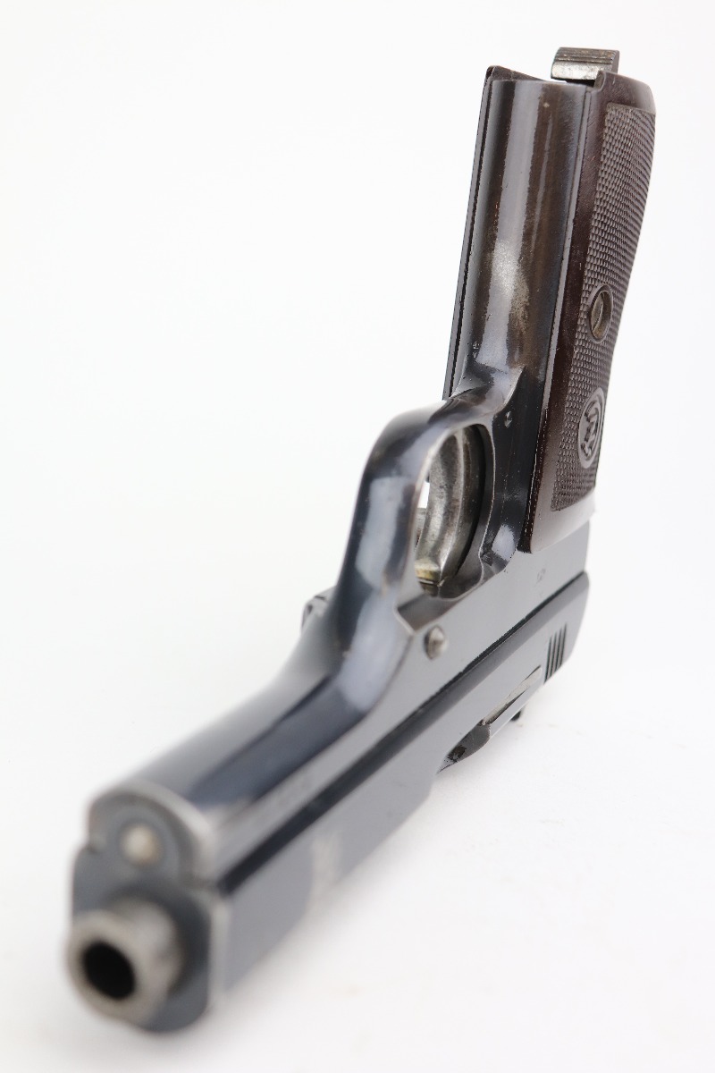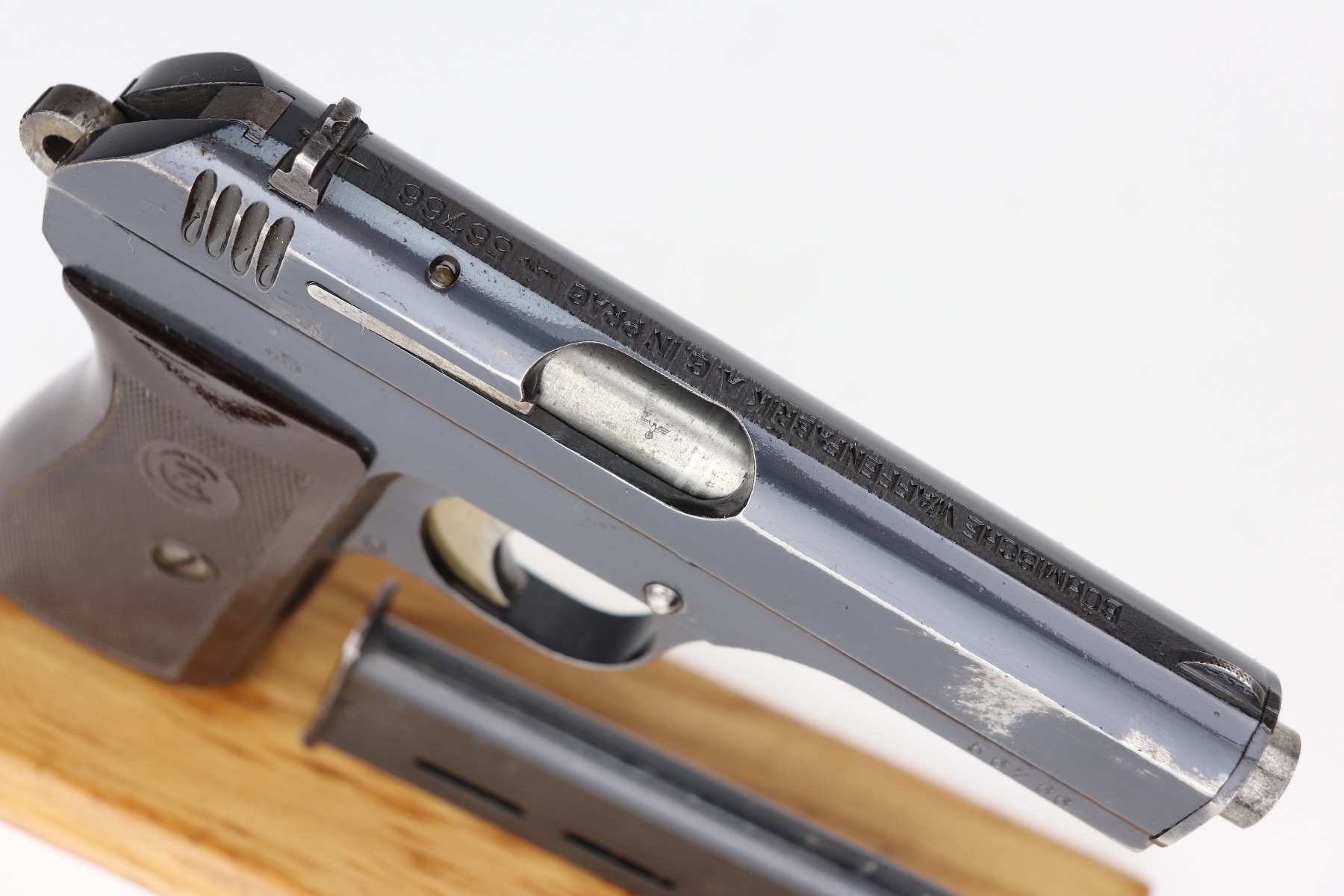 3/29/21 – This is a very nice example of a CZ 27 Rig issued to the Nazi military during WW2. The gun is all matching and has the proper waffen military proof. The rig comes with a nice pebble grain waffen-proofed holster, two period-correct magazines, and a custom Pelican-style hard case. The gun has retained about 92% of its original high polish finish. There are areas of wear around the high edges of the slide, the front strap, under the frame near the muzzle, and on the right side of the slide. Tiny dots of oxidation here and there. Very nice grip with a very small chip on the bottom of the right side. The bore is minty.