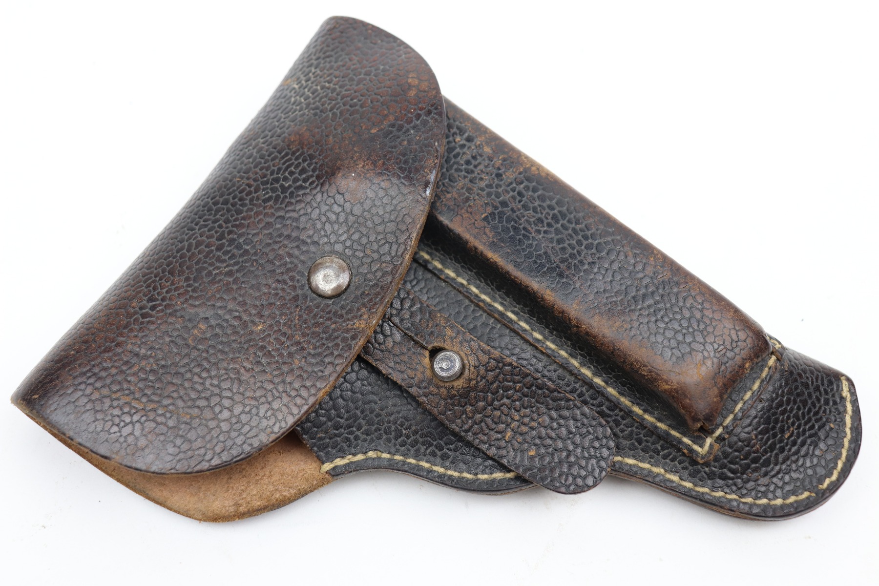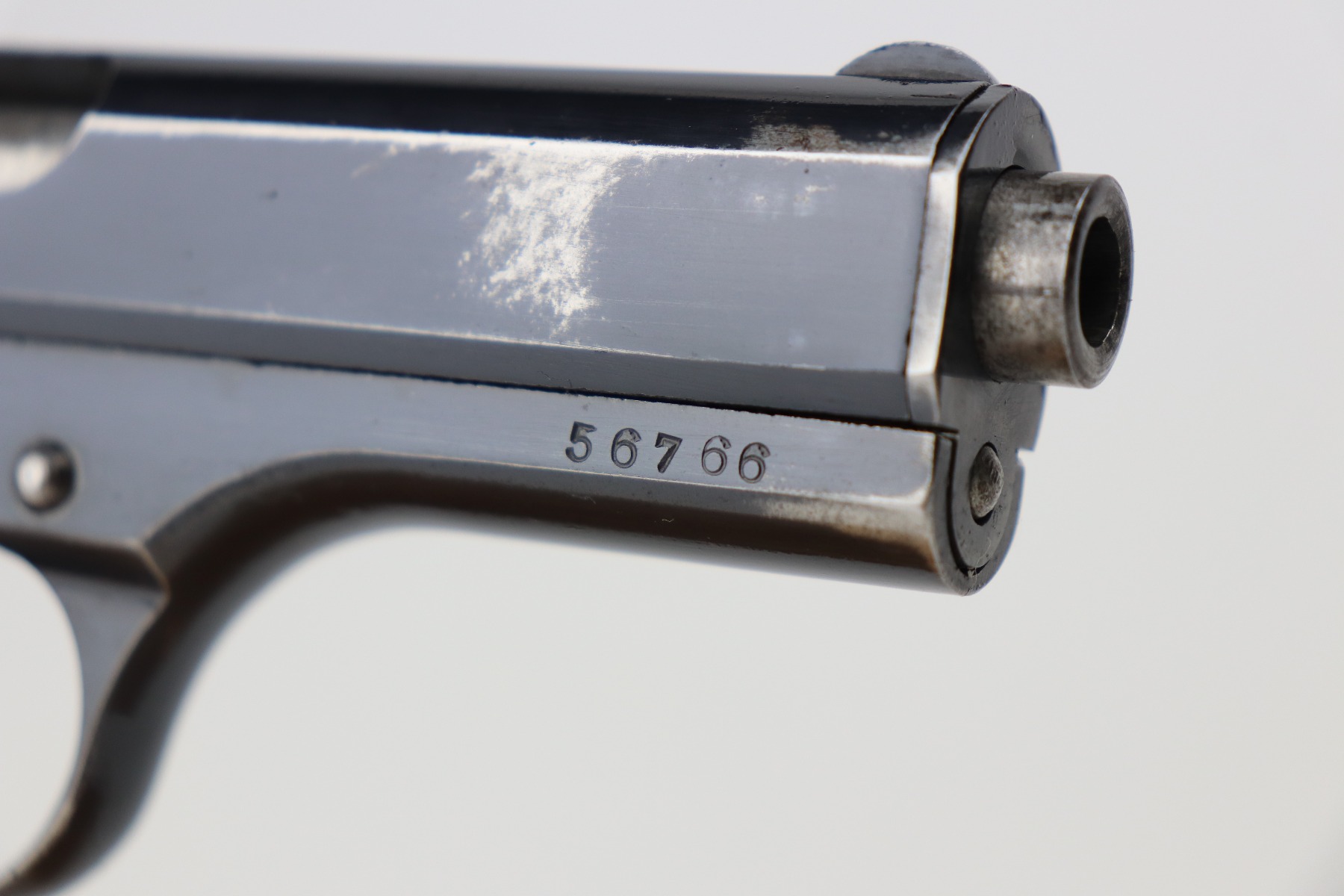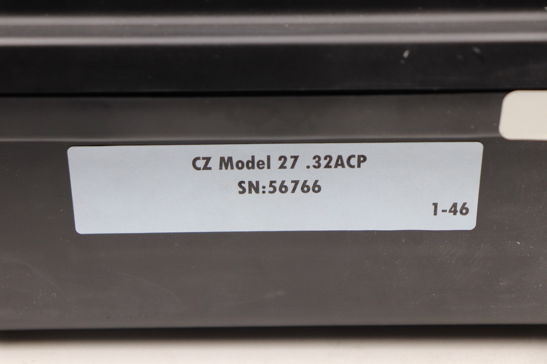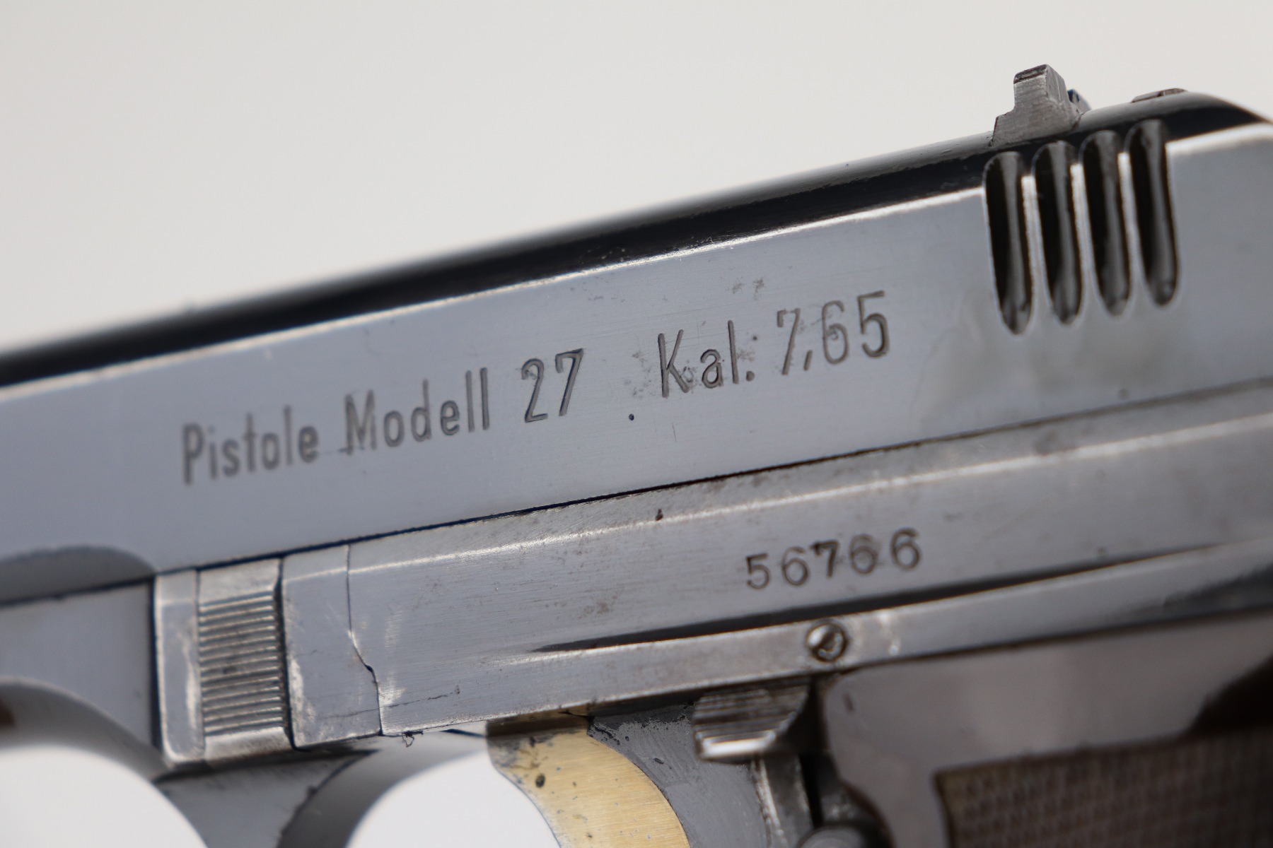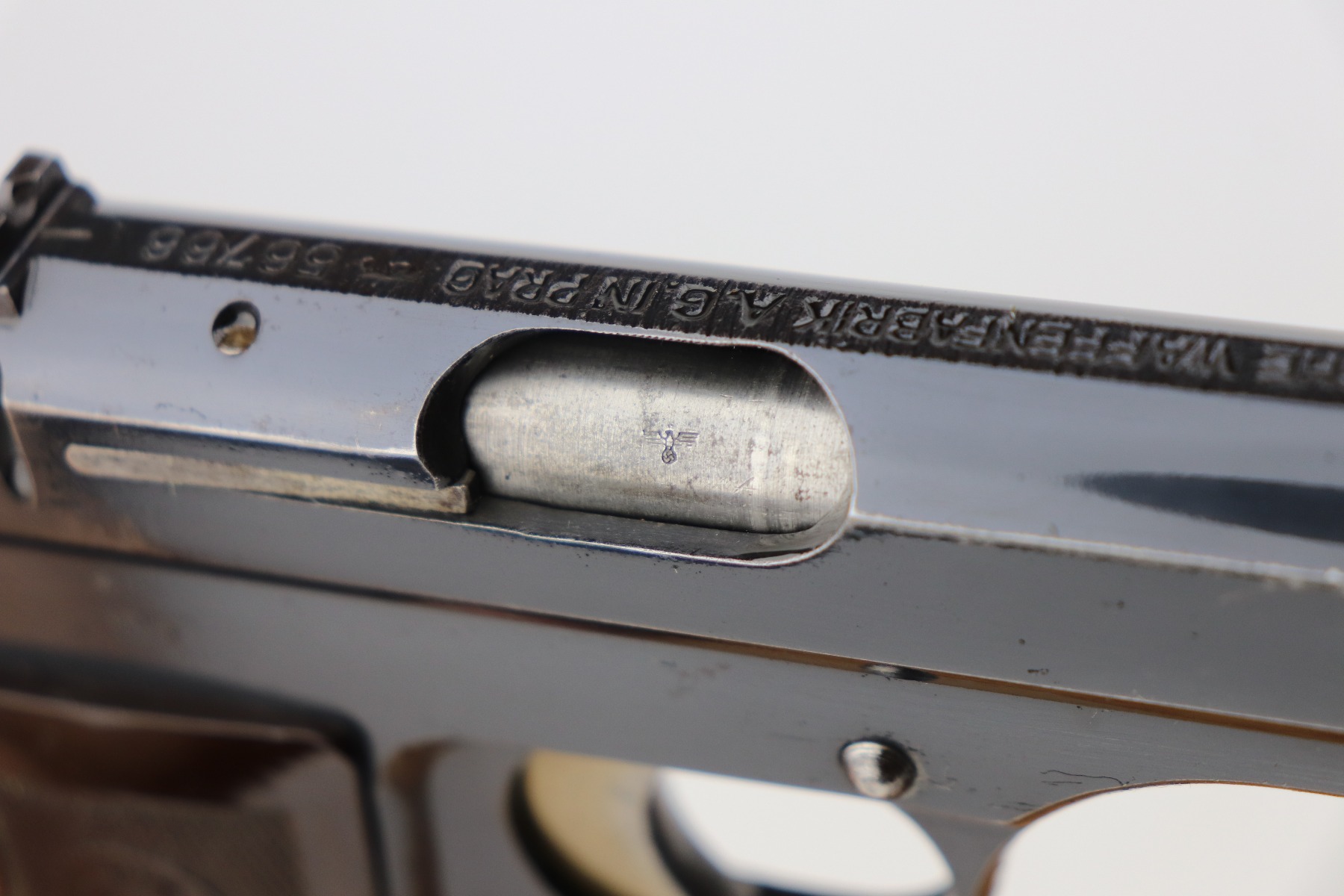 3/29/21 – This is a very nice example of a CZ 27 Rig issued to the Nazi military during WW2. The gun is all matching and has the proper waffen military proof. The rig comes with a nice pebble grain waffen-proofed holster, two period-correct magazines, and a custom Pelican-style hard case. The gun has retained about 92% of its original high polish finish. There are areas of wear around the high edges of the slide, the front strap, under the frame near the muzzle, and on the right side of the slide. Tiny dots of oxidation here and there. Very nice grip with a very small chip on the bottom of the right side. The bore is minty.