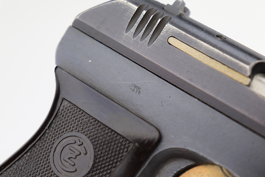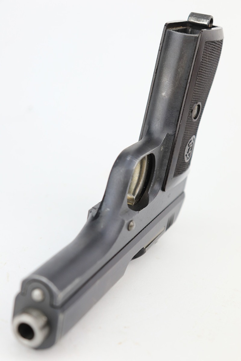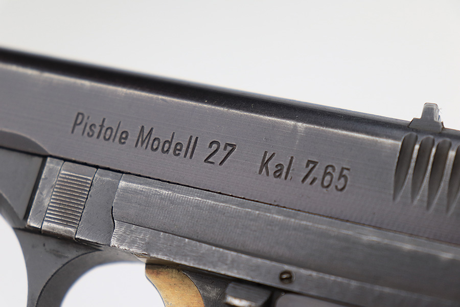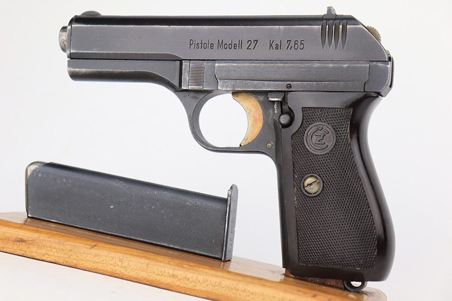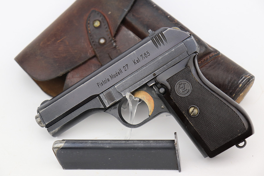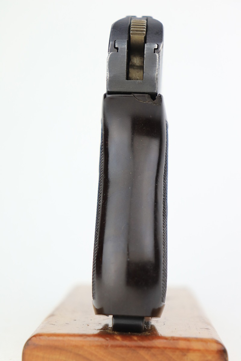 3/27/23 – This is an excellent example of a CZ Model 27 issued to the Nazi military during WW2. It is all matching and has the proper “Waffen 76” Nazi military acceptance proof on the right side of the frame. Generally, there is minor wear on the high edges and some light spotty wear on the right side of the slide. Beautiful straw-coloring on the trigger. Excellent period-correct bakelite grip – no cracks or chips. Comes as a rig with a generic un-marked leather holster and one proper magazine. Mint bore.