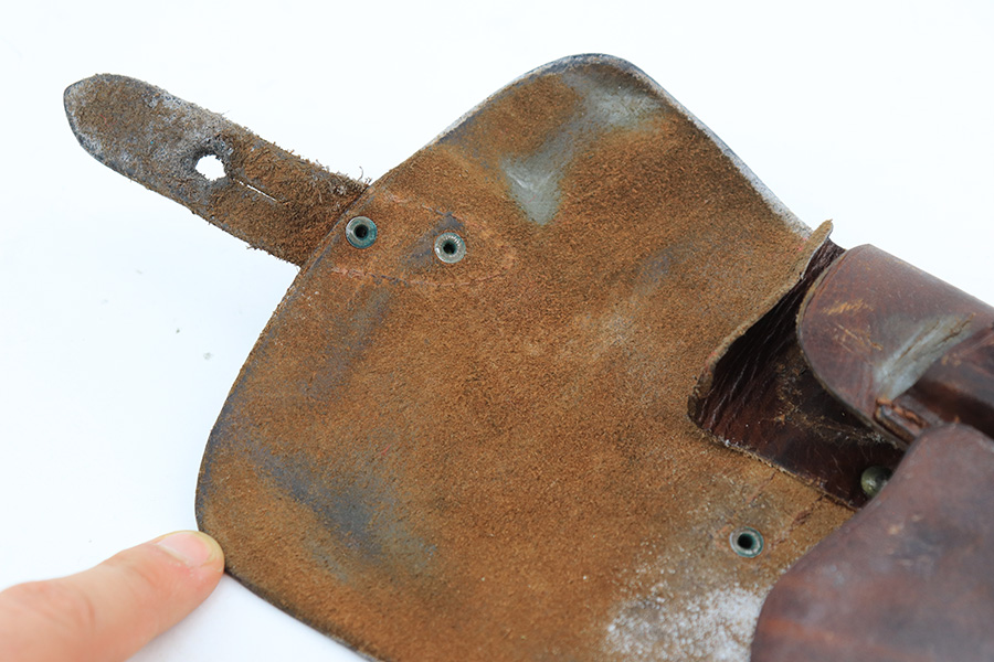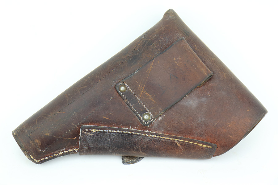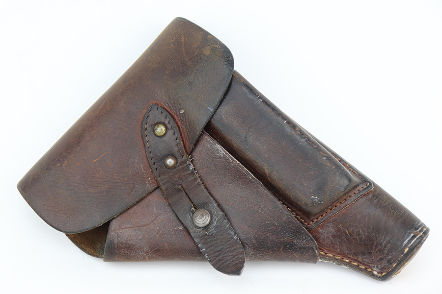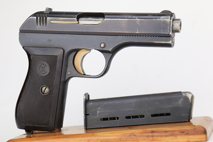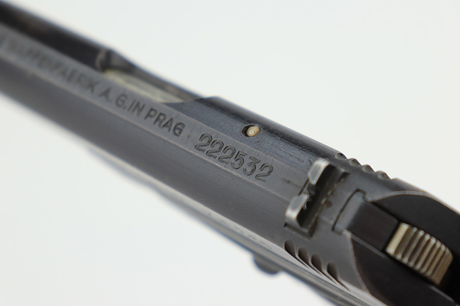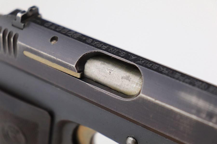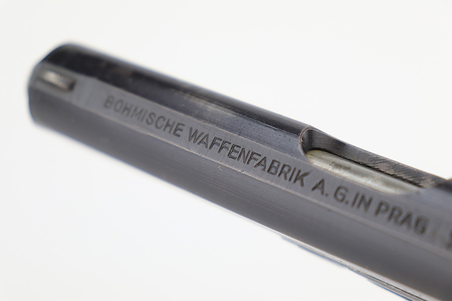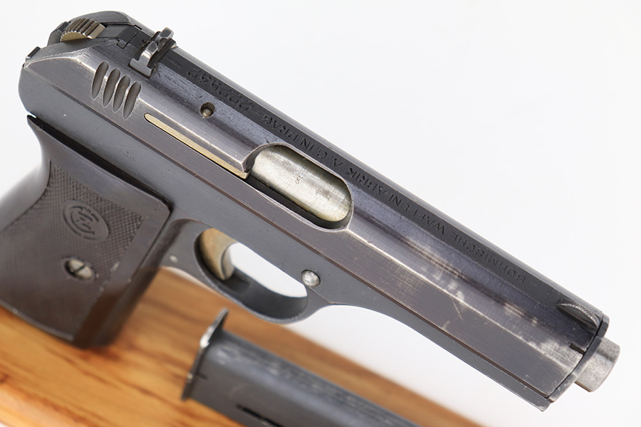 3/27/23 – This is an excellent example of a CZ Model 27 issued to the Nazi military during WW2. It is all matching and has the proper “Waffen 76” Nazi military acceptance proof on the right side of the frame. Generally, there is minor wear on the high edges and some light spotty wear on the right side of the slide. Beautiful straw-coloring on the trigger. Excellent period-correct bakelite grip – no cracks or chips. Comes as a rig with a generic un-marked leather holster and one proper magazine. Mint bore.