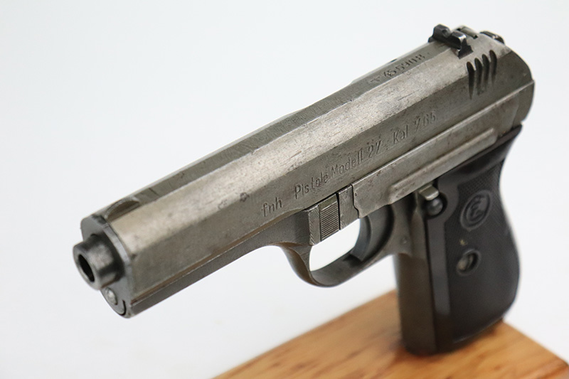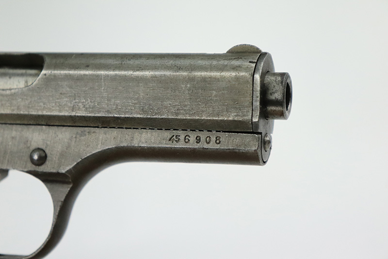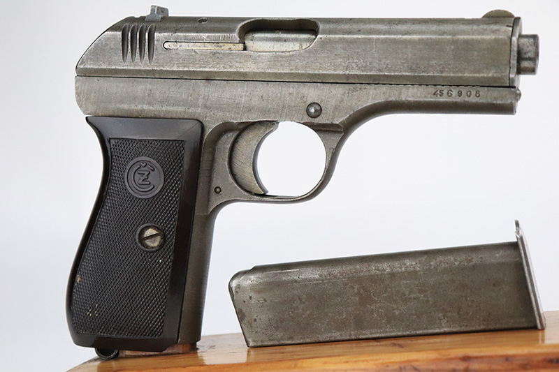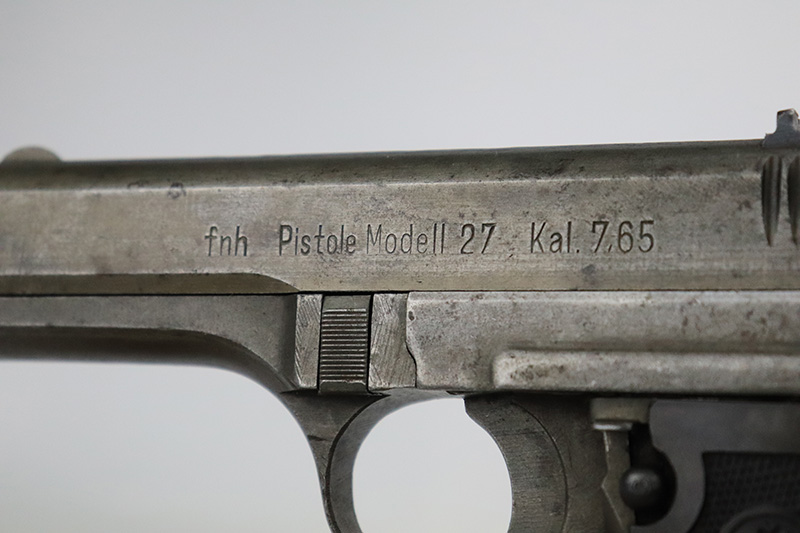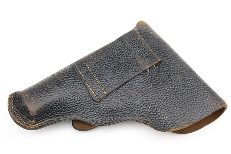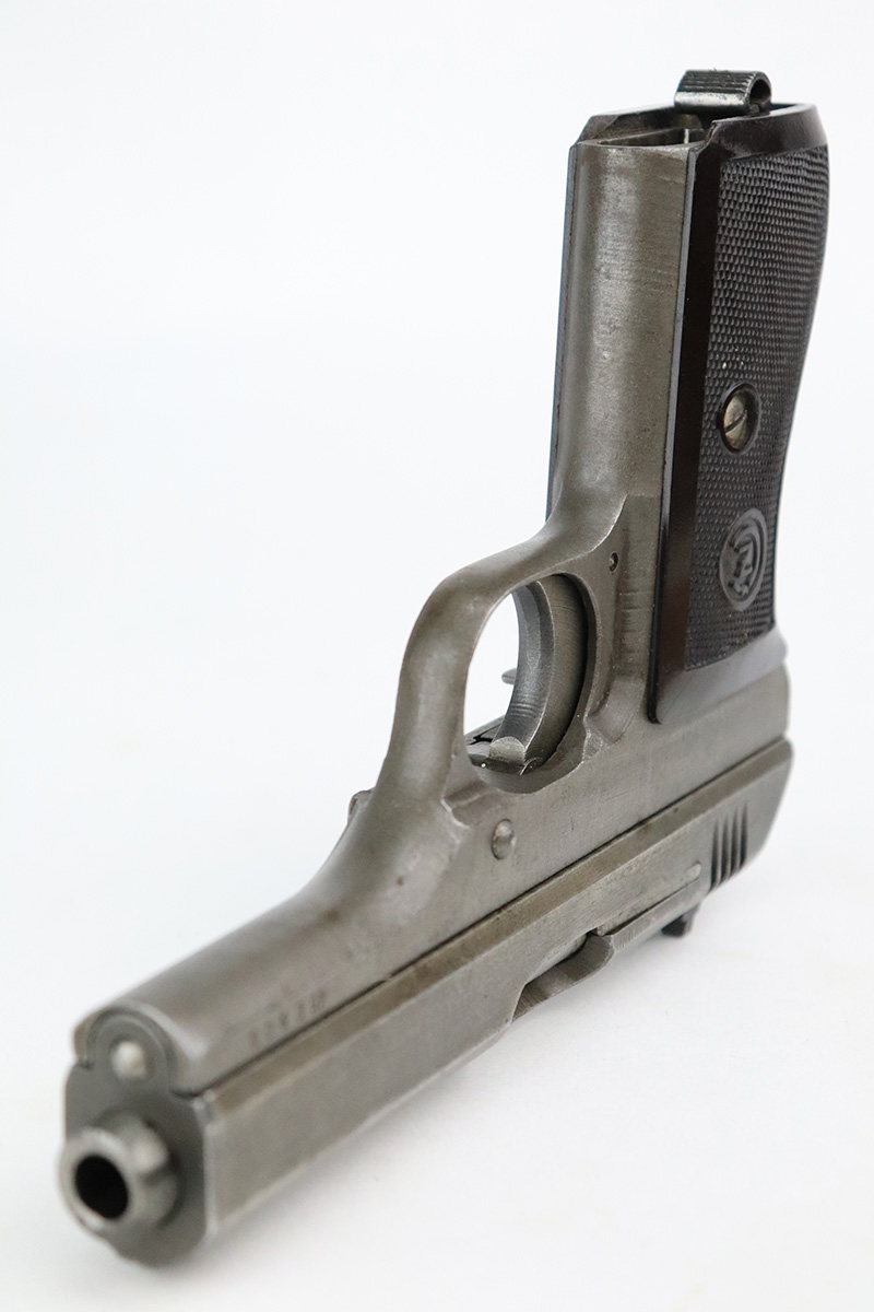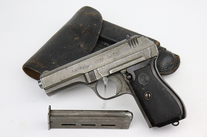 9/23/22 – This is an excellent example of an all-phosphate CZ Model 27 issued to the Nazi military during WW2. It is all matching and has the proper “Waffen 76” military acceptance proof on the right side of the frame. It comes as a rig with a nice 1944-dated (very faintly dated on the back) pebble grain holster and a scarce phosphate magazine. These phosphate finishes are a little difficult to rate, but we estimate the gun has retained about 95%. While there is very little finish loss, there is light spotty oxidation throughout (typical). Comes with a very nice period-correct bakelite grip – tiny chips in the bottom corners. The bore is mint.
