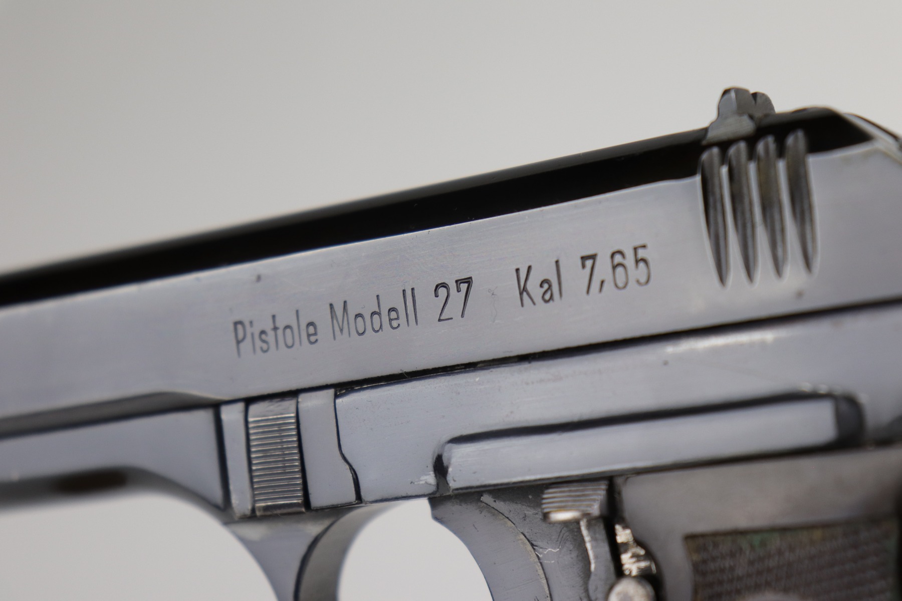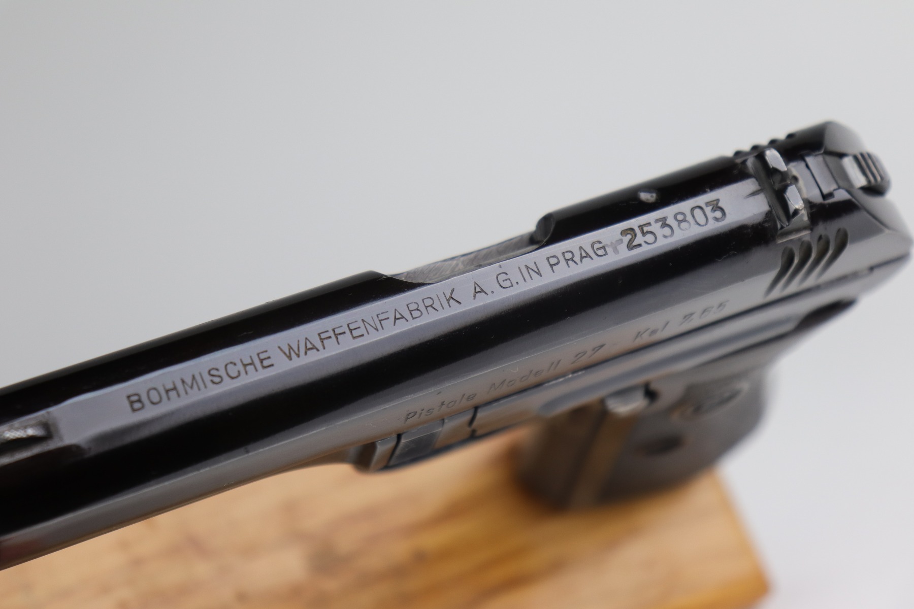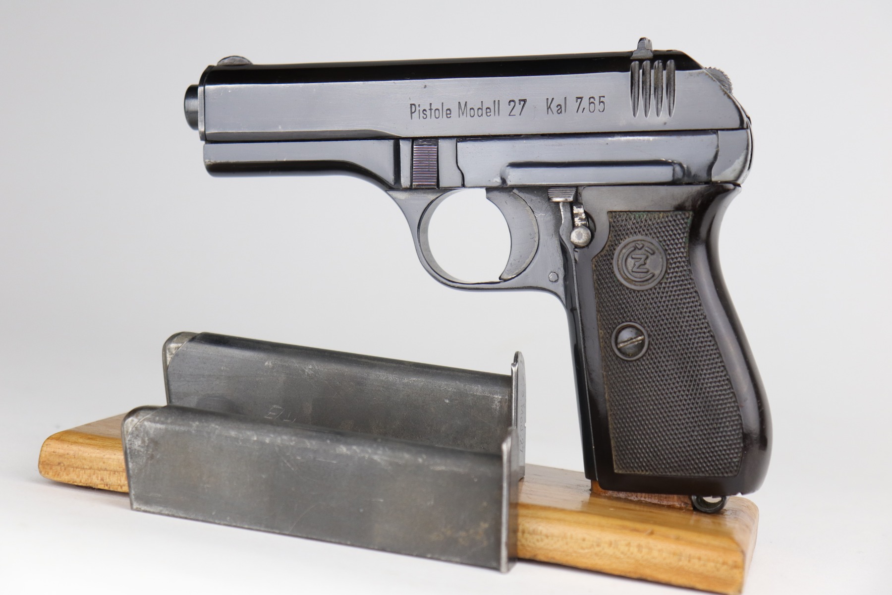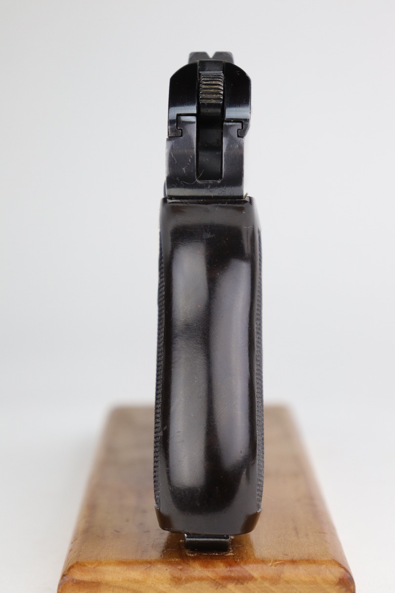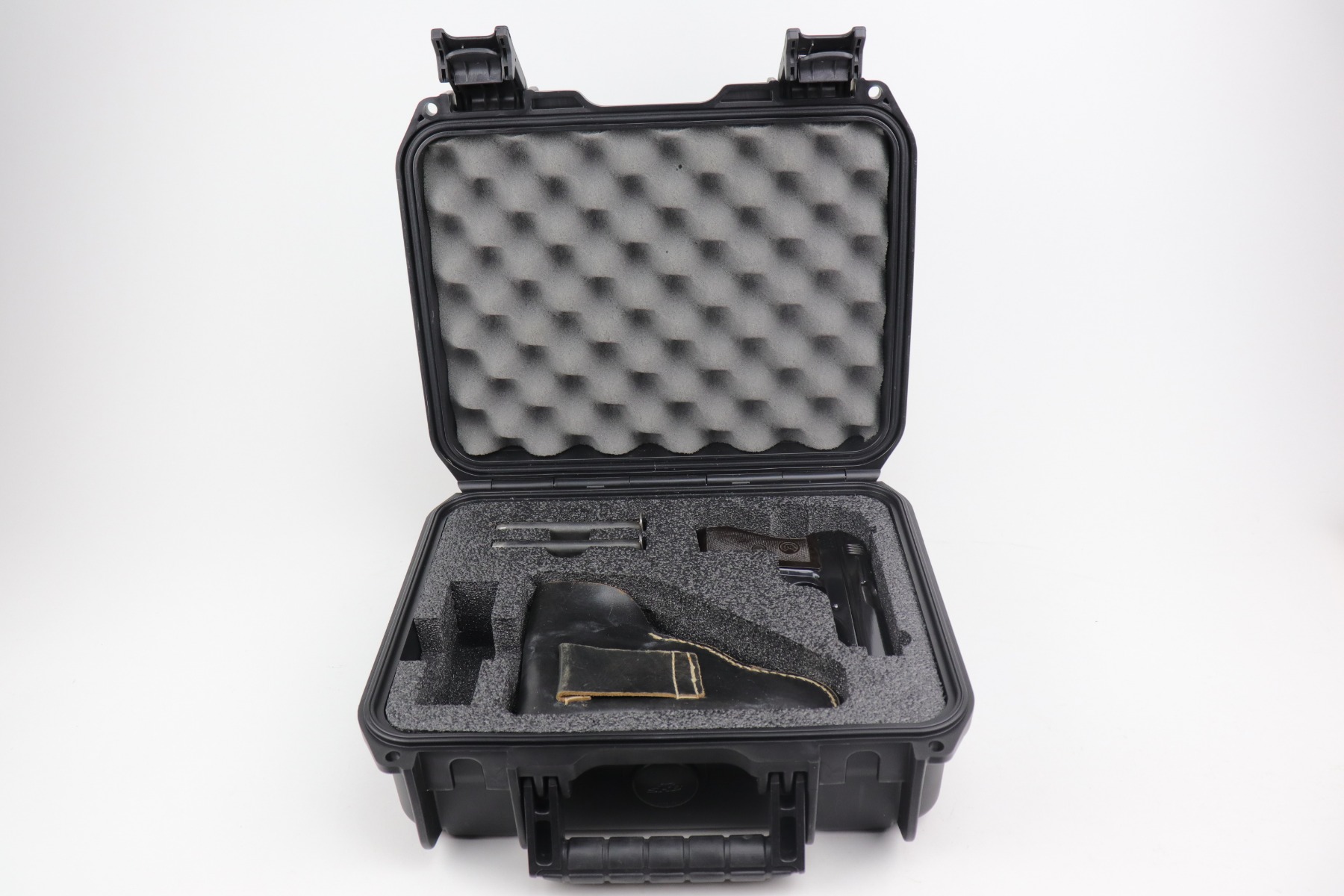 5/31/24 – This is a very nice example of a CZ 27 Rig issued to the Nazi military during WW2. This rig comes with a black leather holster, two period-correct magazines, and a great Pelican-style hard case that has cutouts to fit the parts perfectly. This gun is all matching and has the proper Nazi military proof. This one has been beautifully professionally restored. It has retained about 98% of its re-blued finish. It comes with an excellent grip, just on very small chip on the bottom of the right side. The bore is excellent – shiny with strong rifling.