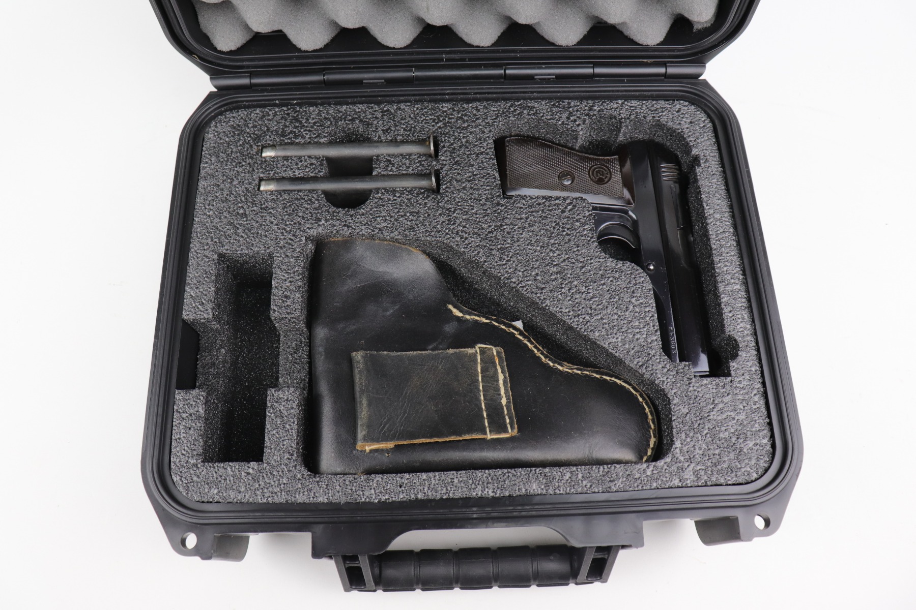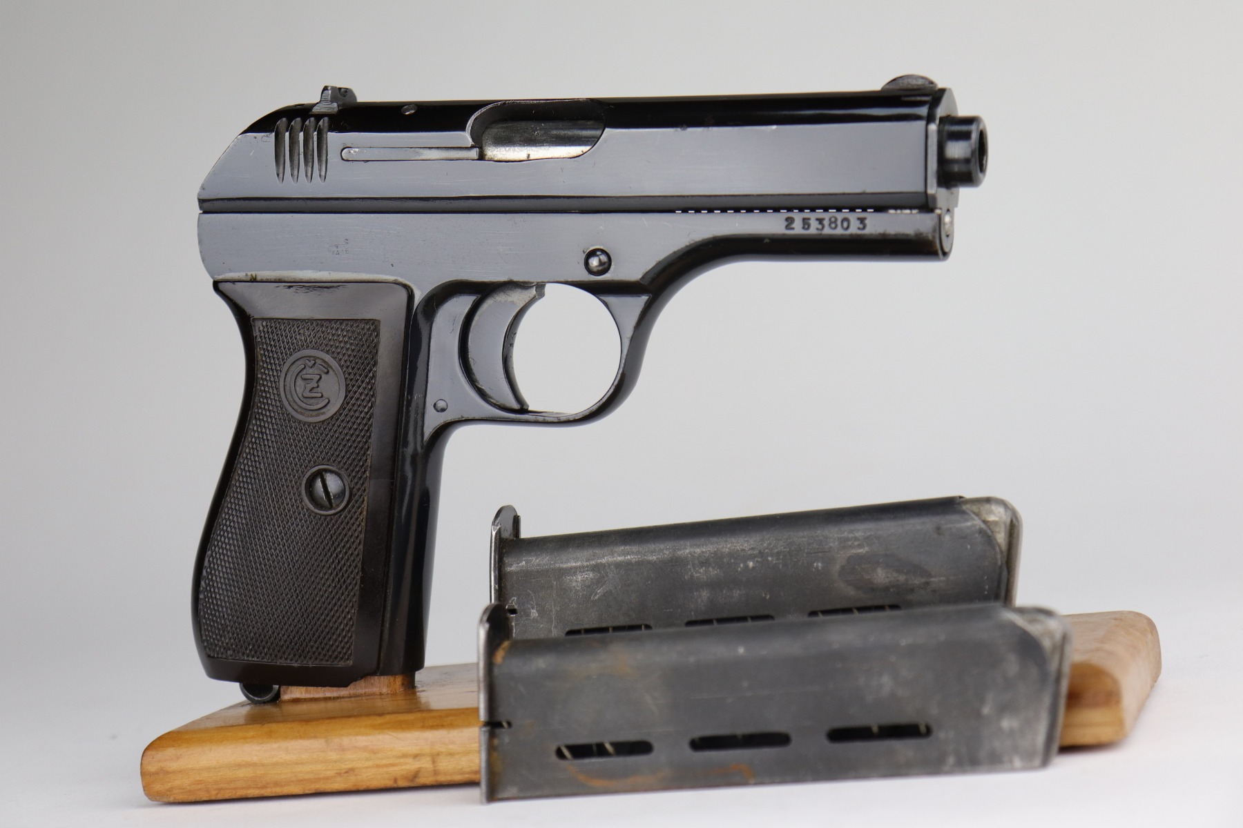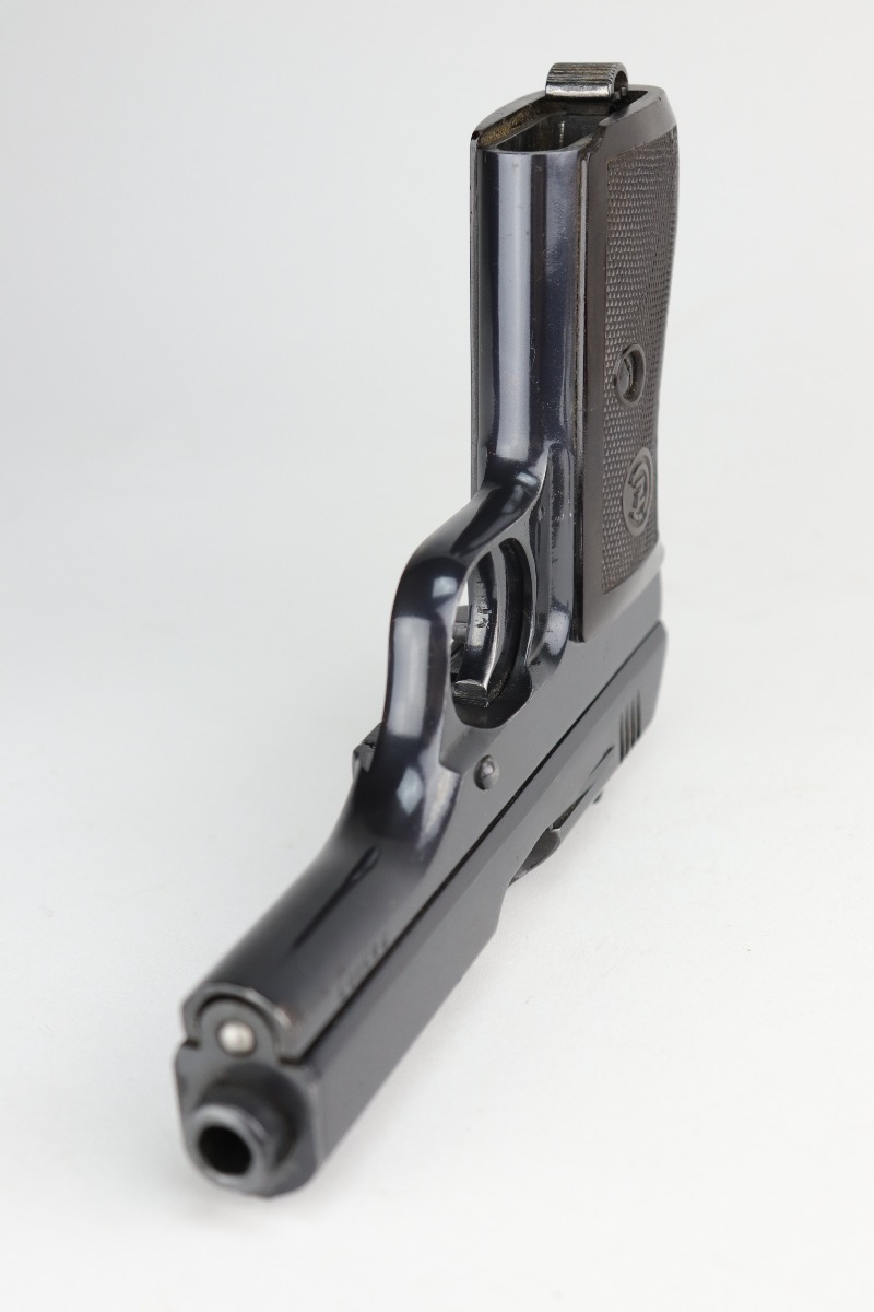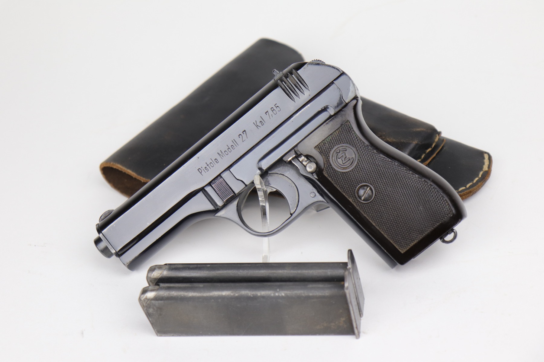 5/31/24 – This is a very nice example of a CZ 27 Rig issued to the Nazi military during WW2. This rig comes with a black leather holster, two period-correct magazines, and a great Pelican-style hard case that has cutouts to fit the parts perfectly. This gun is all matching and has the proper Nazi military proof. This one has been beautifully professionally restored. It has retained about 98% of its re-blued finish. It comes with an excellent grip, just on very small chip on the bottom of the right side. The bore is excellent – shiny with strong rifling.