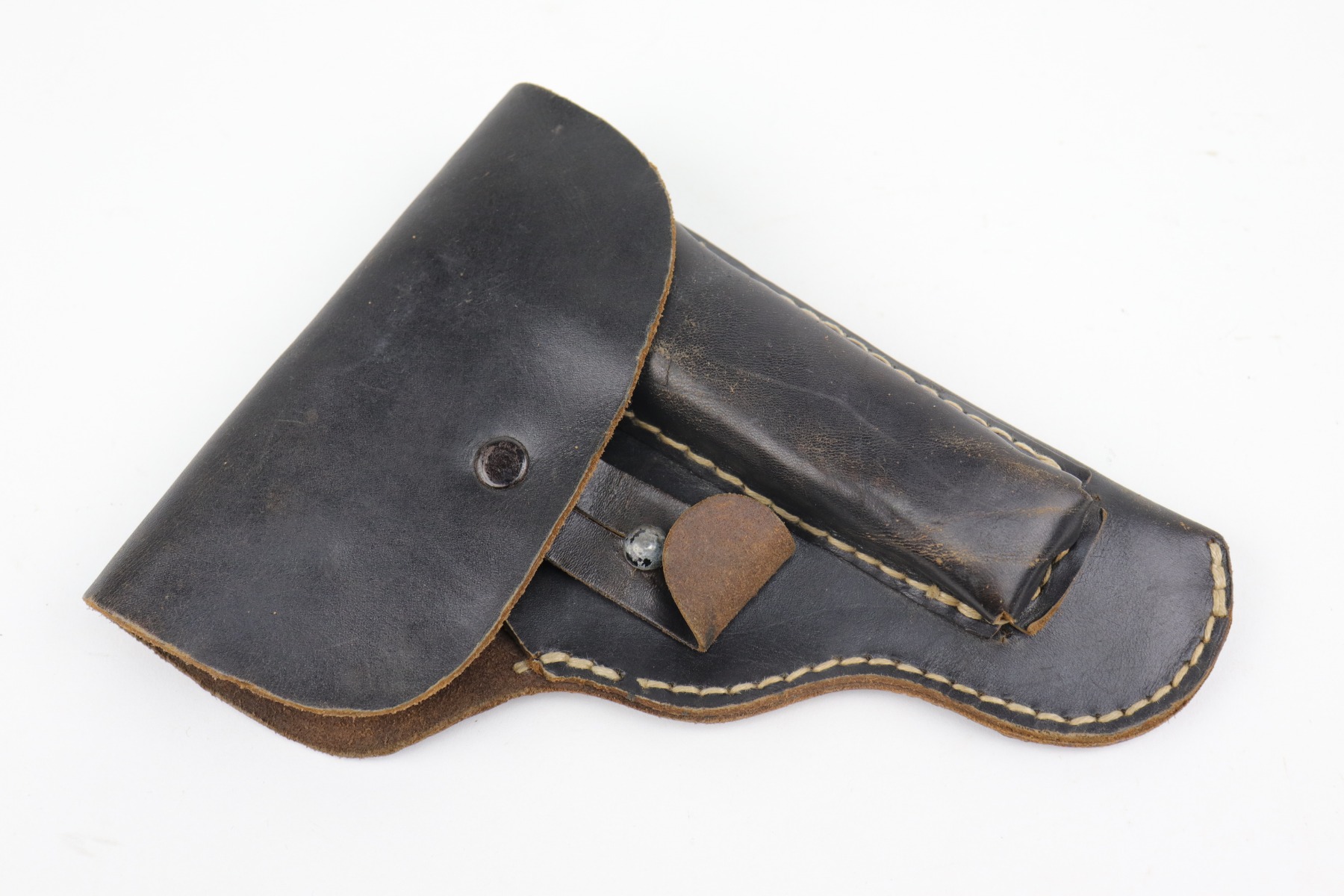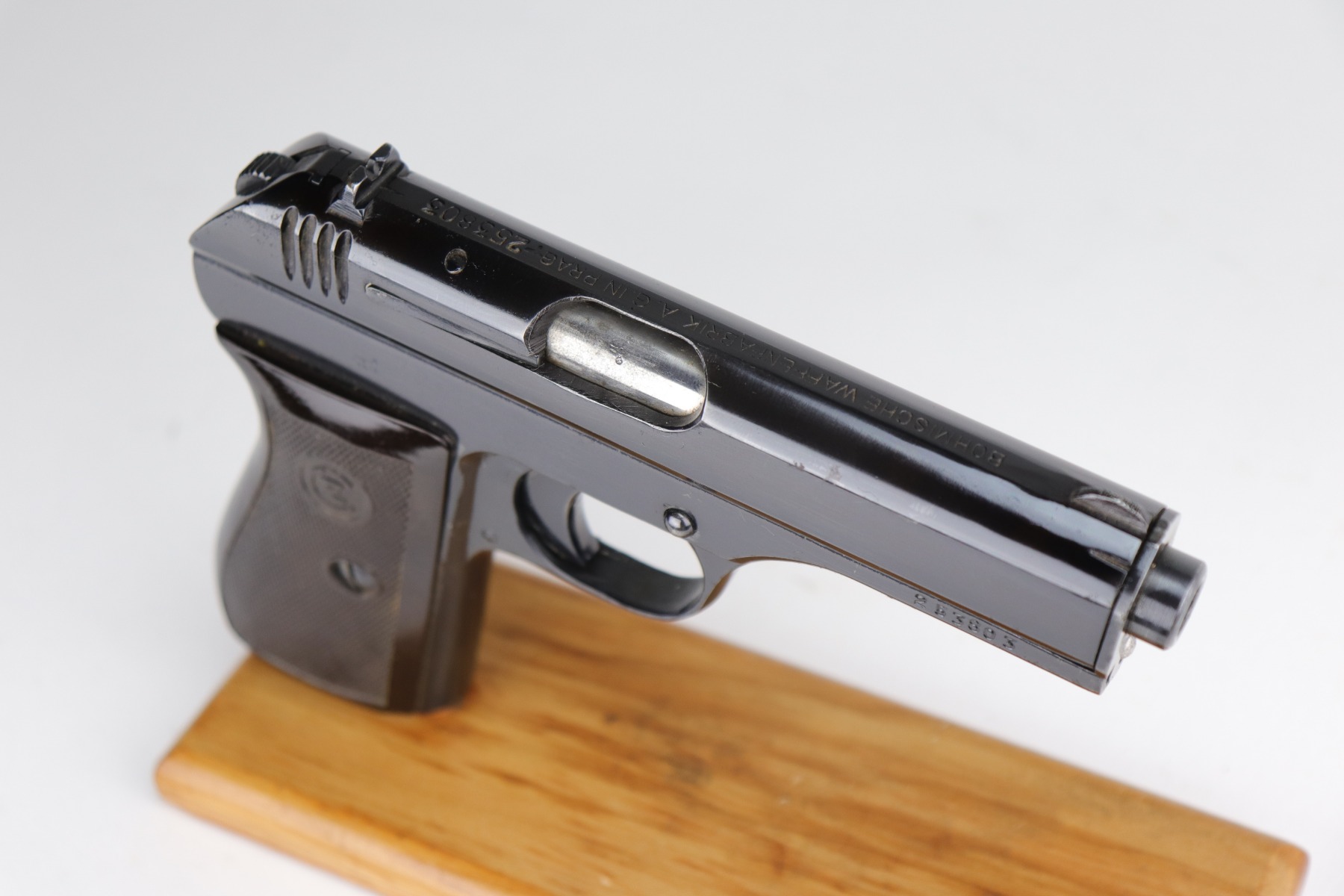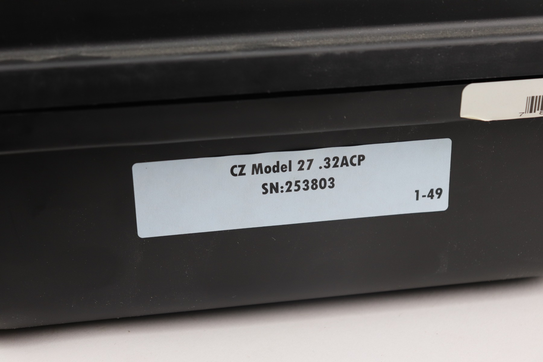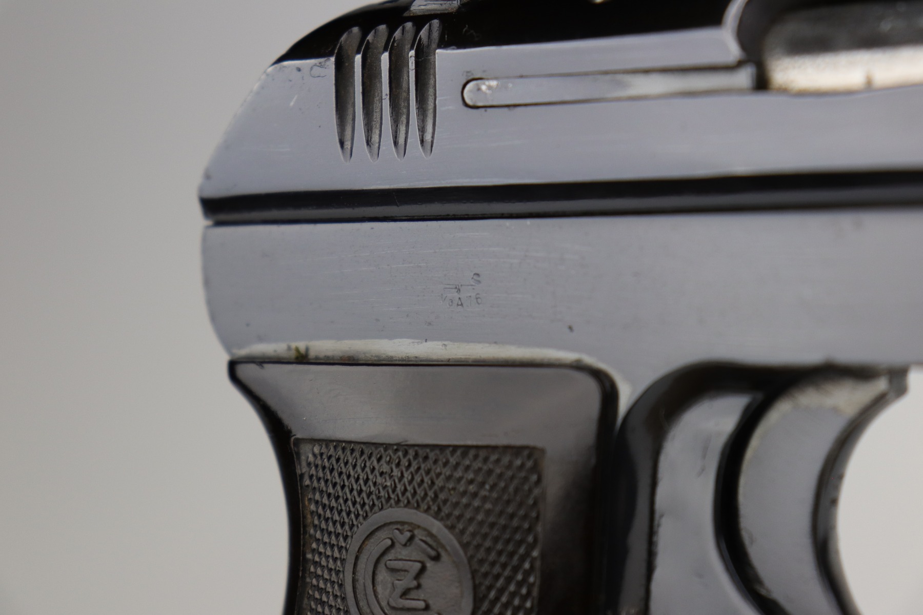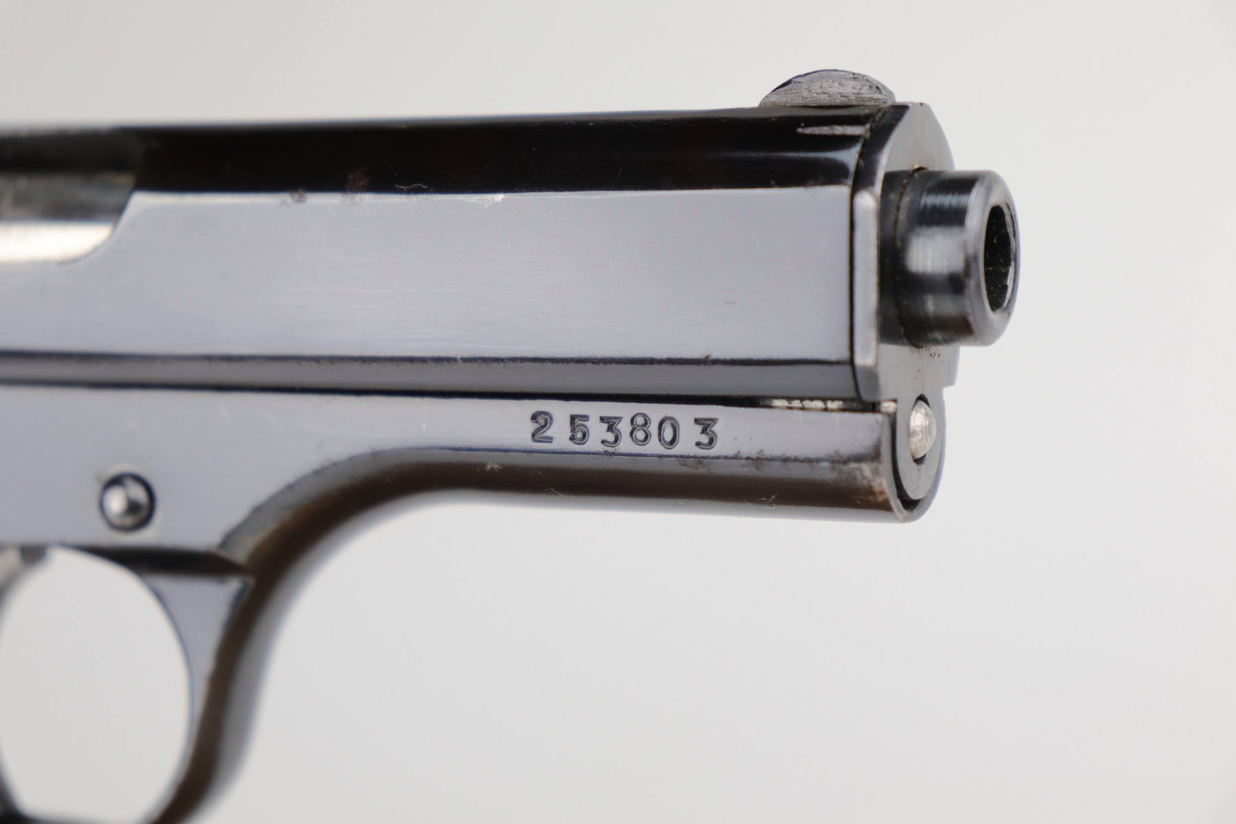 5/31/24 – This is a very nice example of a CZ 27 Rig issued to the Nazi military during WW2. This rig comes with a black leather holster, two period-correct magazines, and a great Pelican-style hard case that has cutouts to fit the parts perfectly. This gun is all matching and has the proper Nazi military proof. This one has been beautifully professionally restored. It has retained about 98% of its re-blued finish. It comes with an excellent grip, just on very small chip on the bottom of the right side. The bore is excellent – shiny with strong rifling.