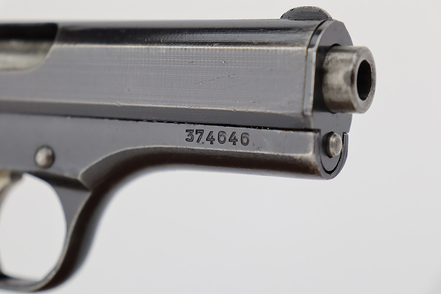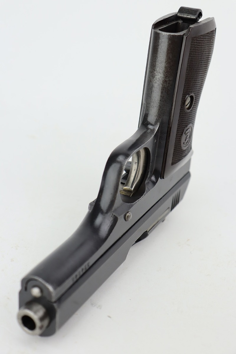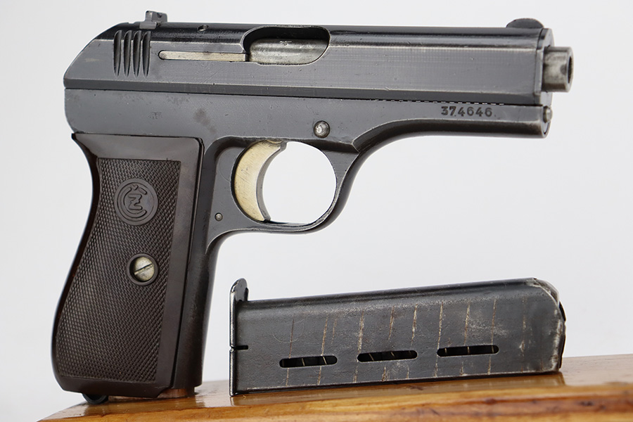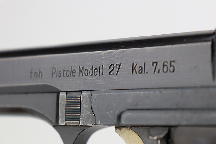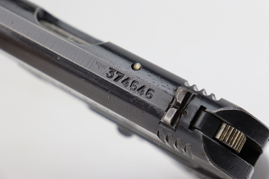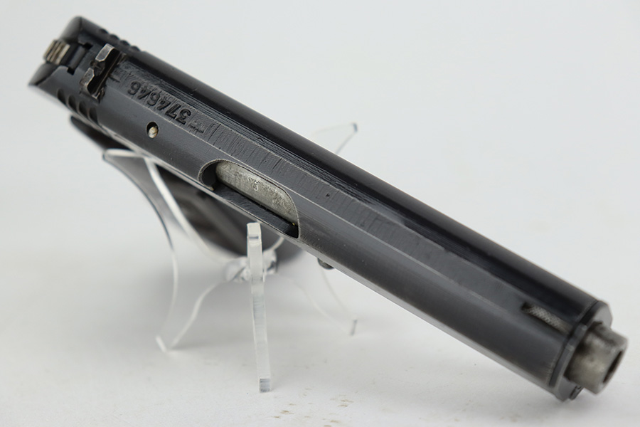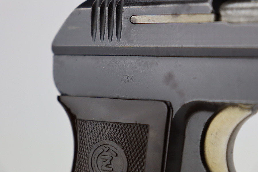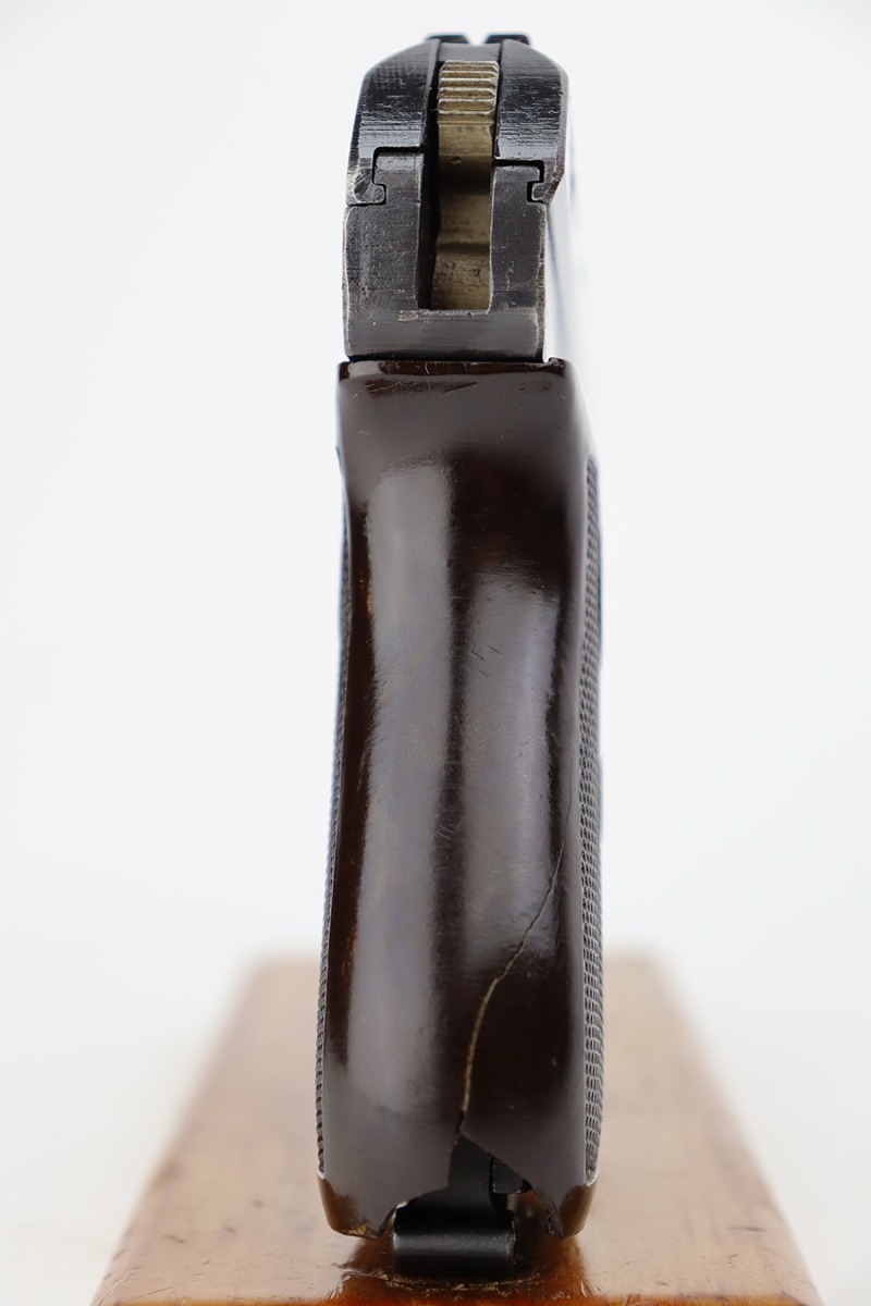 8/25/23 – This is a very nice example of a CZ Model 27 issued to the Nazi military during WW2. It is all matching and has the proper “Waffen 76” military acceptance proof on the right side of the frame. It has retained about 94-95% of its original wartime finish. There is minor wear around the muzzle and on the high edges of the slide. Minor thinning and light freckling on the front strap. Fitted with a period-correct bakelite grip – there is a significant chip and crack in the spine. Comes with one proper magazine. Excellent bore with strong rifling.