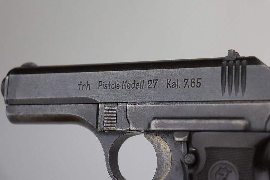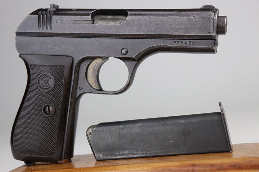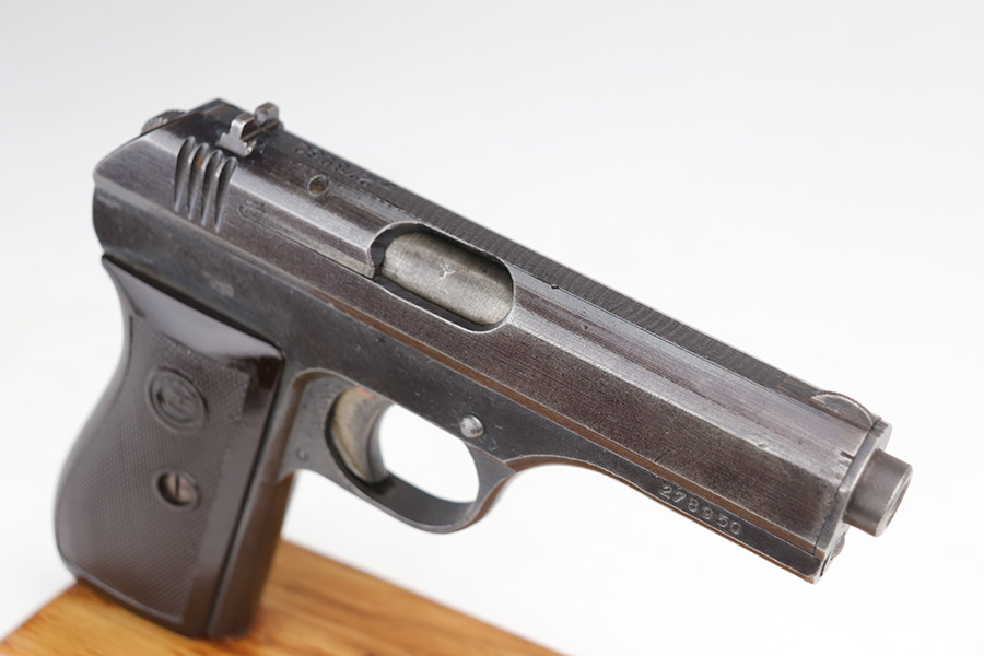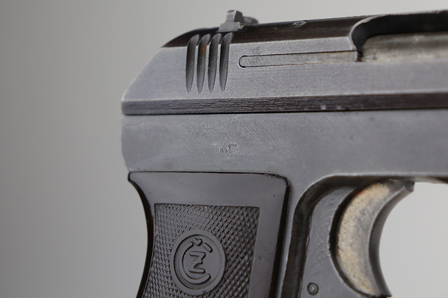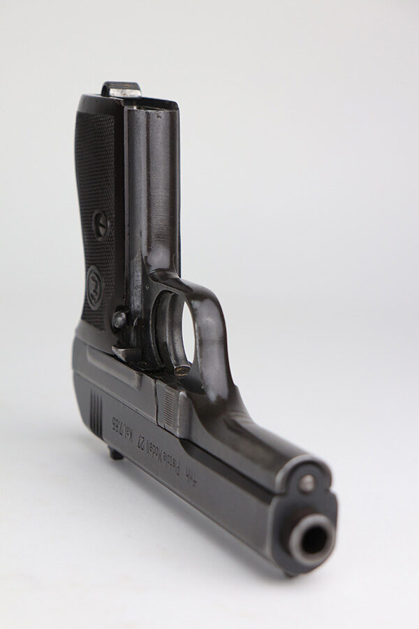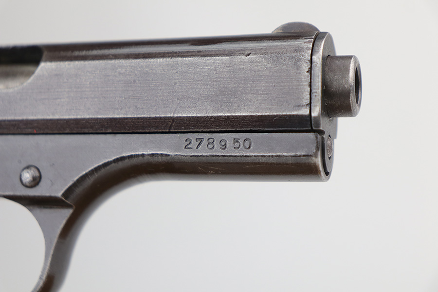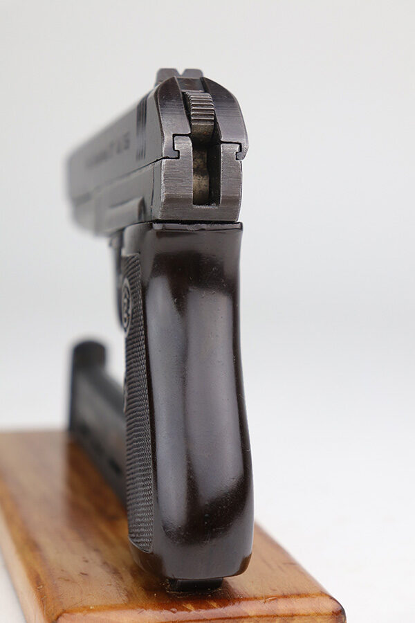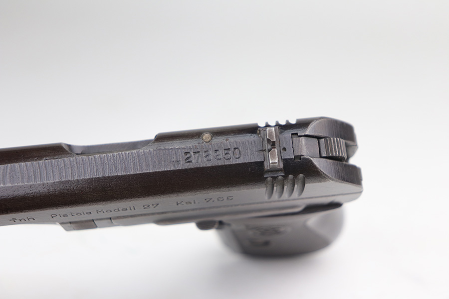 10/20/21 – This is a very nice example of a CZ Model 27 issued to the Nazi military during WW2. It is all matching and has the proper “Waffen 76” Nazi military proof on the right side of the frame. The military finishes on these guns are a little difficult to rate, because they can sometimes appear thin even if there is no significant finish loss. In any case, we estimate it has retained about 90% of its original finish. There is minor wear around the high edges and around the muzzle. There are areas of thinning on both sides of the slide and on the underside of the frame. Tiny dots of oxidation and some noticeable brown throughout. Comes with an excellent period-correct grip with small chips in both of the bottom corners. Also comes with an un-marked period-correct magazine. The bore is mint.