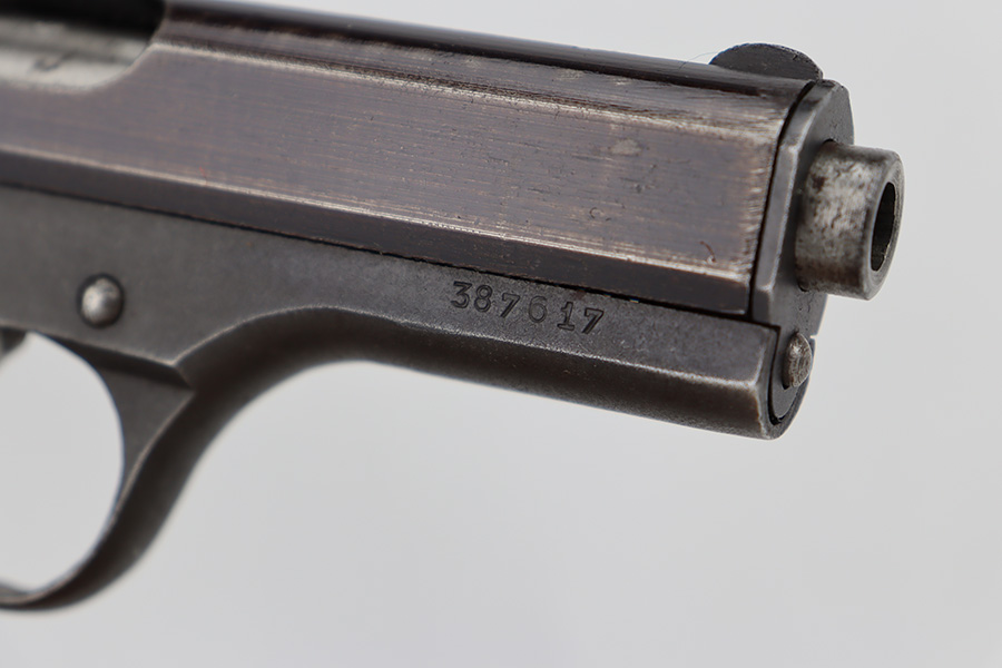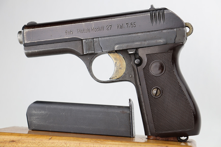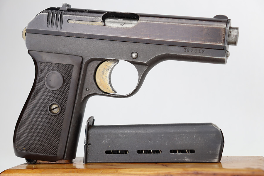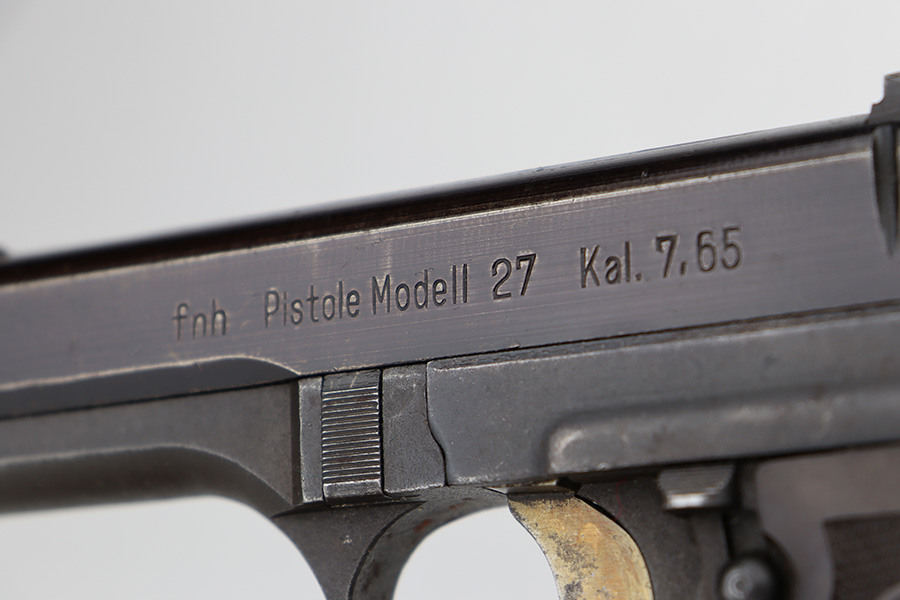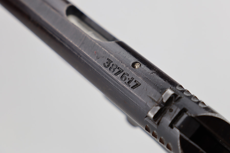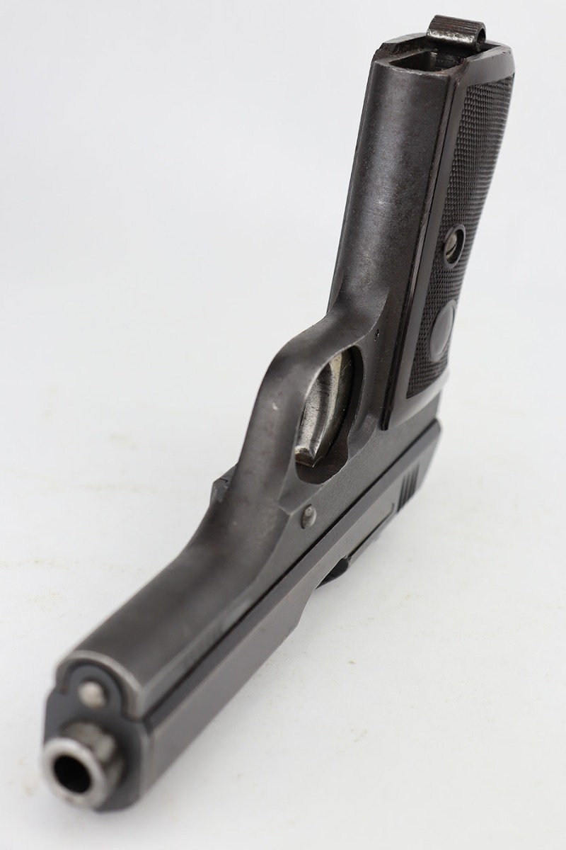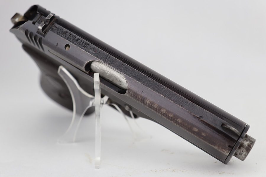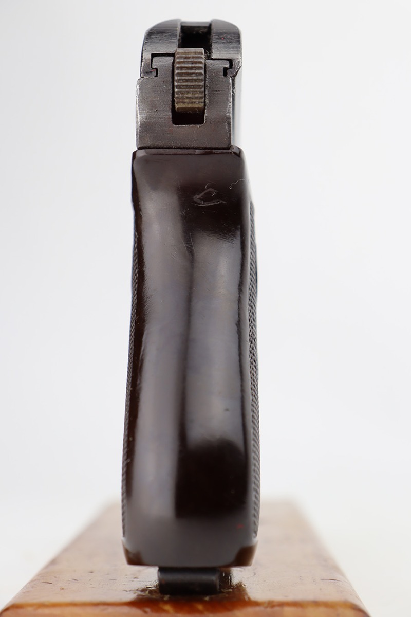 6/12/23 – This is a very nice example of a CZ Model 27 issued to the Nazi military during WW2. All matching with the proper “Waffen 76” military acceptance proof on the right side of the frame. It has retained about 90-92% of its original finish. There is minor wear along both sides of the slide, concentrated mostly around the high edges. Some light spotty oxidation on the front strap. Fitted with a very nice period-correct bakelite grip – tiny chips in the bottom front corners. Comes with one proper magazine. Mint bore. The hold-open does not work properly with this magazine.