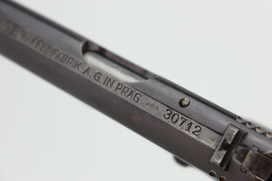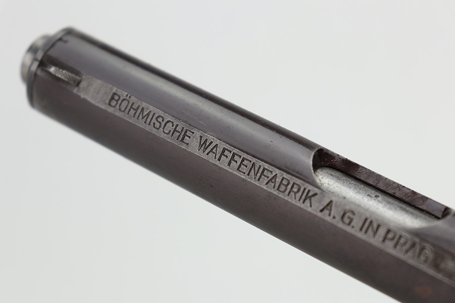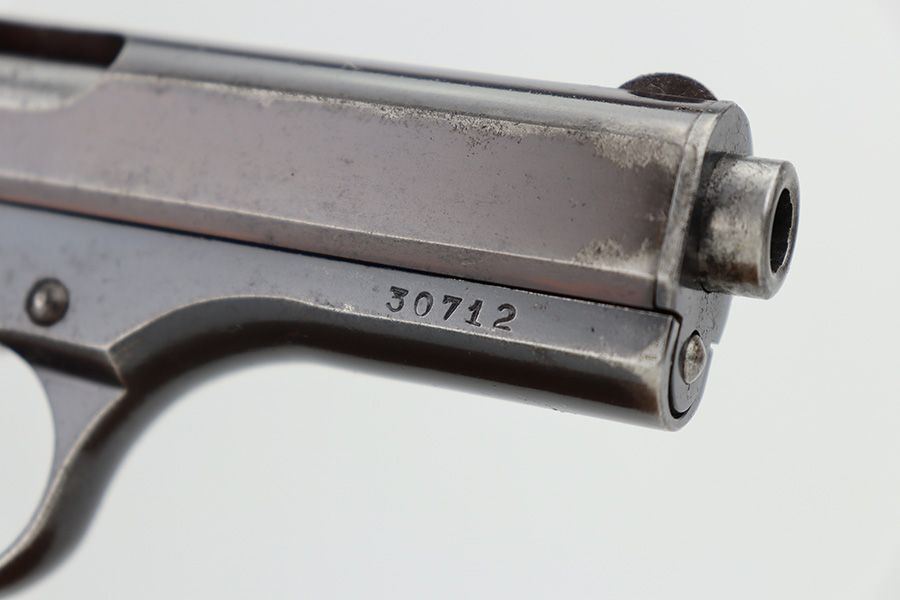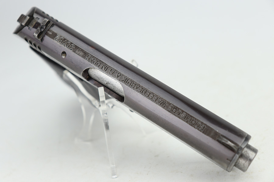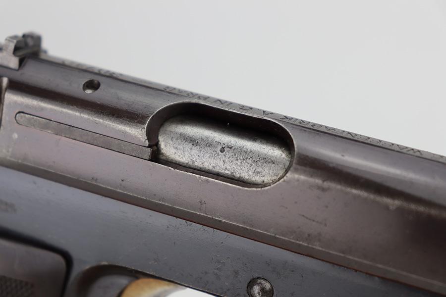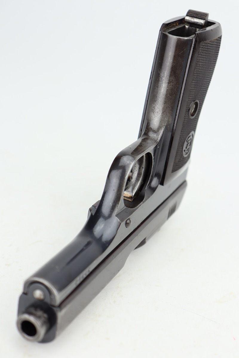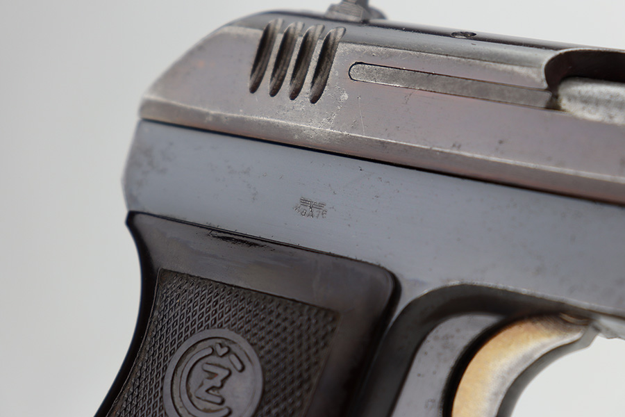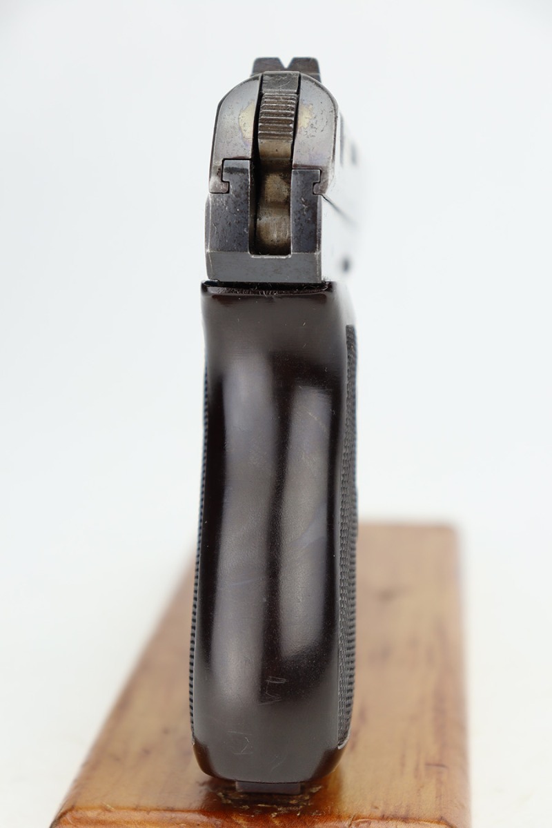 12/27/23 – This is a very nice CZ 27 issued to the Nazi military during WW2. All matching with the proper “Waffen 76” military acceptance proof. This is an earlier variation with a high polish finish and straw-colored small parts. The slide has a nice plum tint to it. The original finish rates about 90% with general high edge wear and some minor thinning on the front strap. Some light pin-pricking in some of the same areas. Fitted with a period-correct bakelite grip – a tiny chip in the bottom left corner. Comes with a proper magazine. Mint bore.