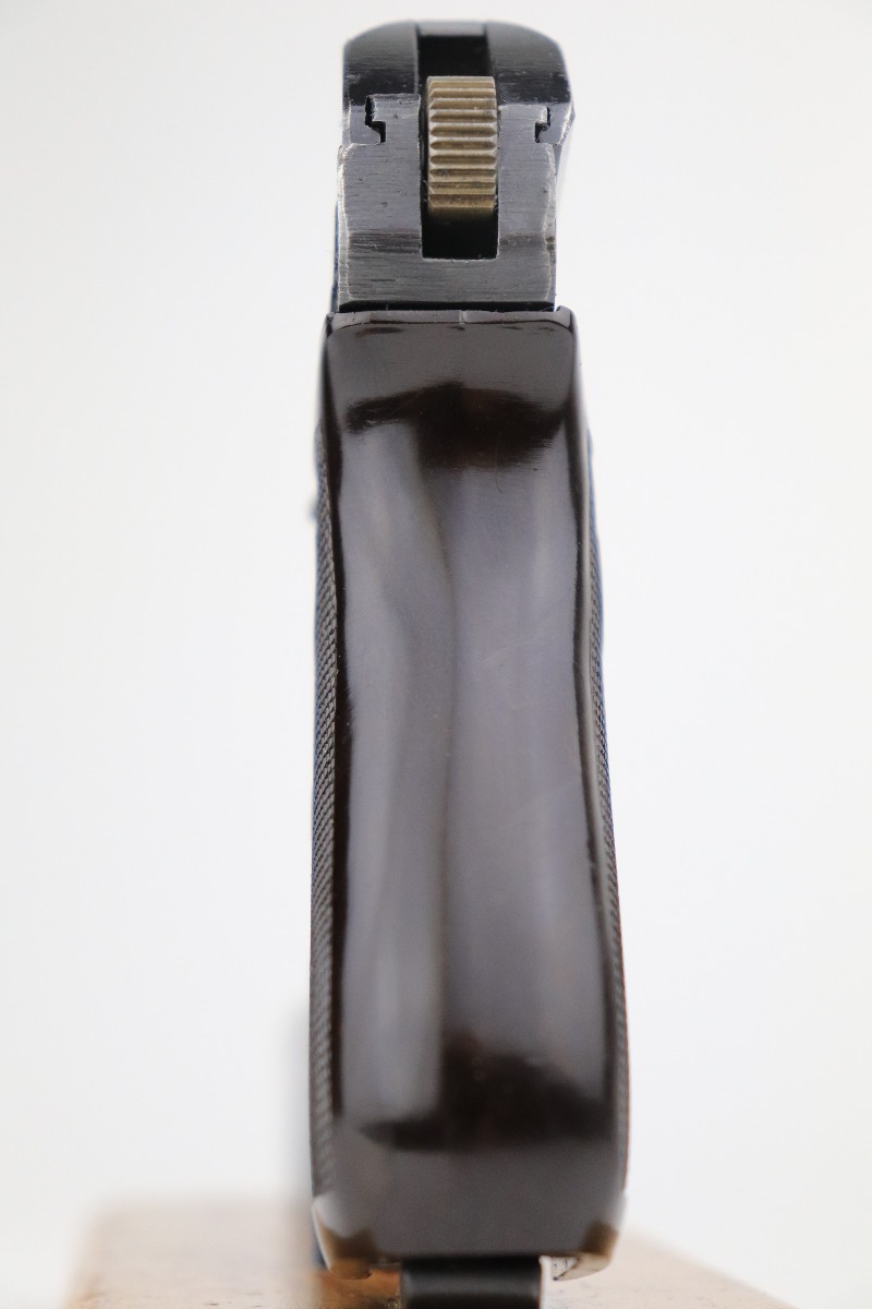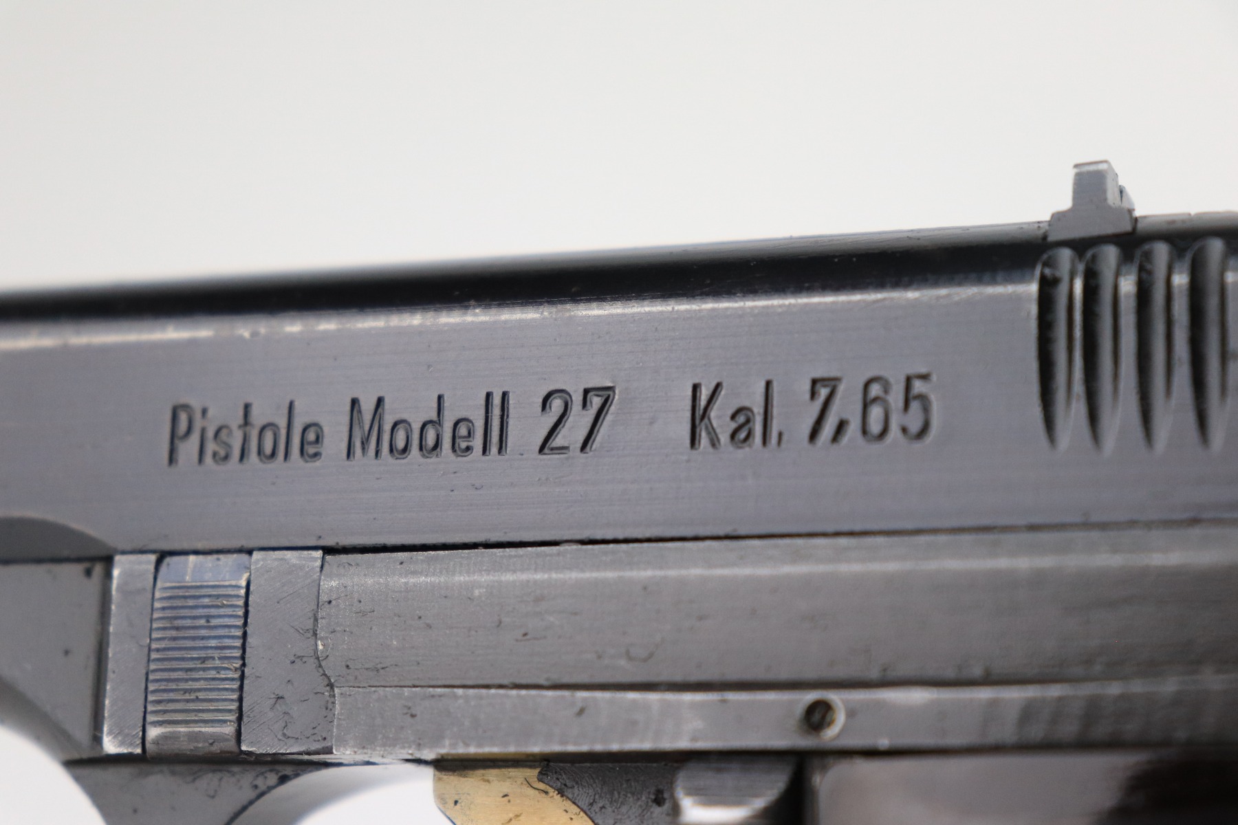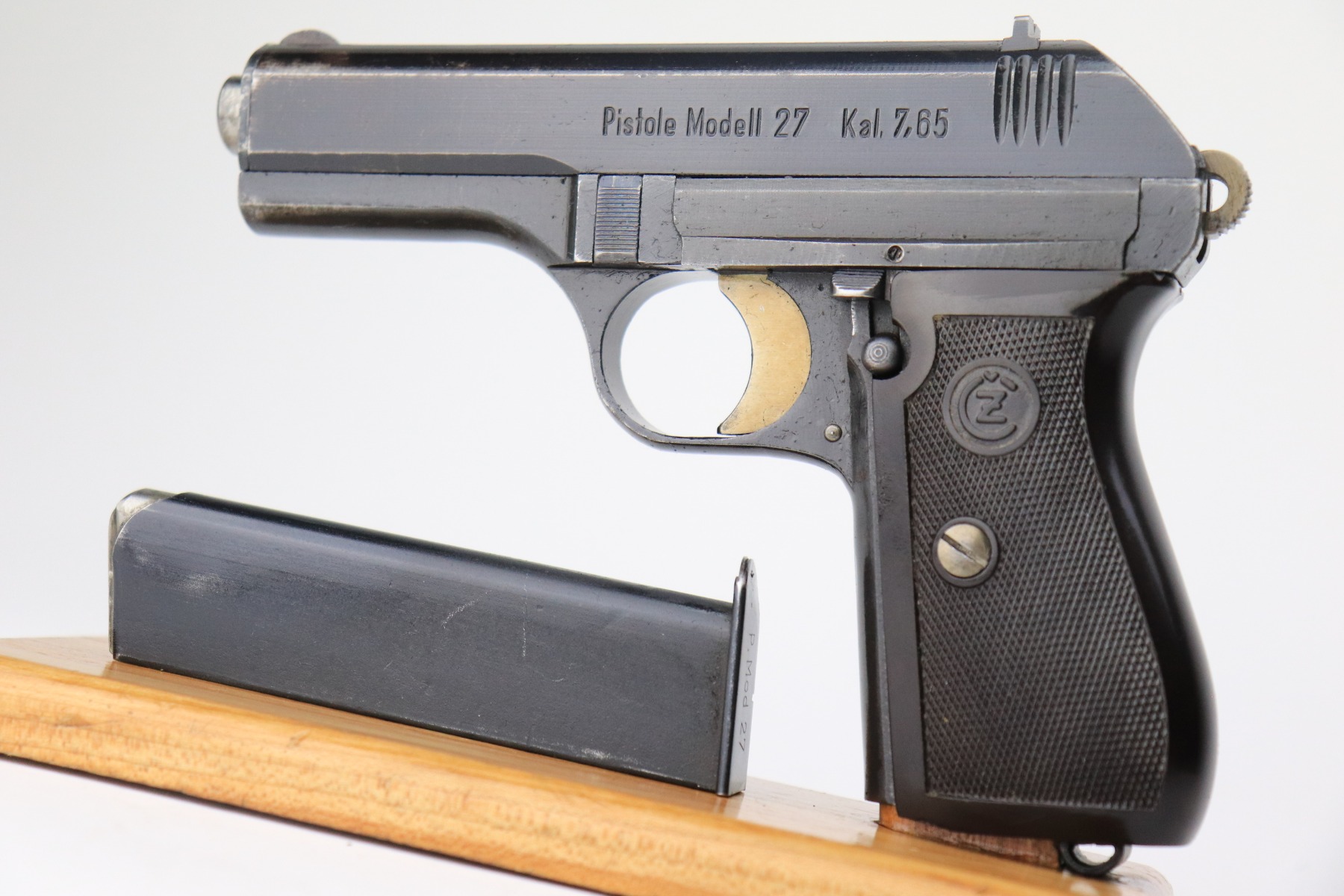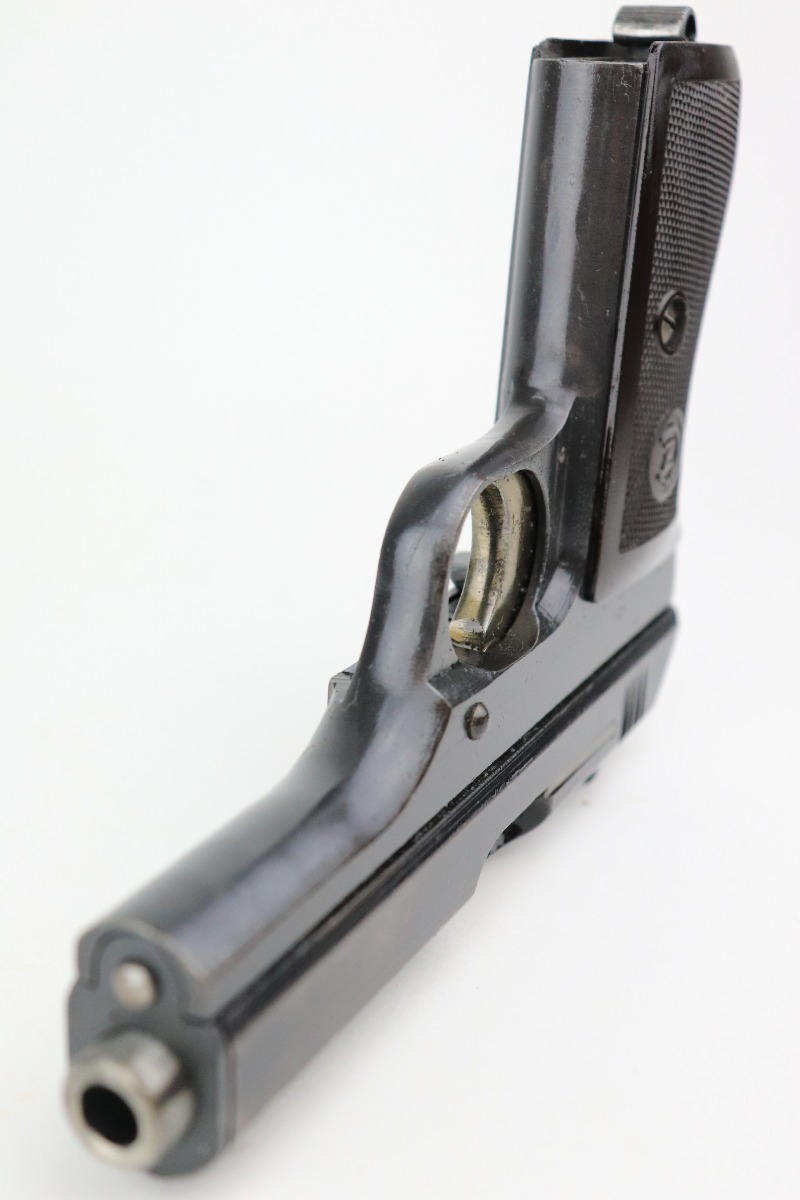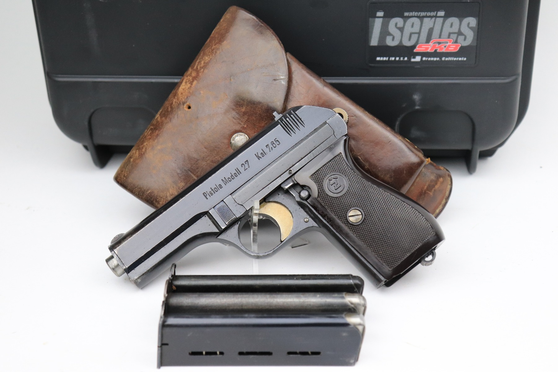 4/8/21 – This is a very nice example of a CZ Model 27 issued to the Nazi military during WW2. The gun is all matching and has the proper waffen military proof. The gun comes with a nice 1941-dated holster, three period-correct magazines, a spare reproduction grip, spare springs, and a Pelican-style hard case. There is a small hole in the top flap of the holster. The gun has retained about 92-93% of its military blue finish. Generally, there is minor wear around the muzzle and high edges of the slide. There are a few dots of wear on the top of the slide and thinning on the right side of the slide. Comes with a very nice grip that has a very small chip on the left side in the bottom corner. The bore is mint.
