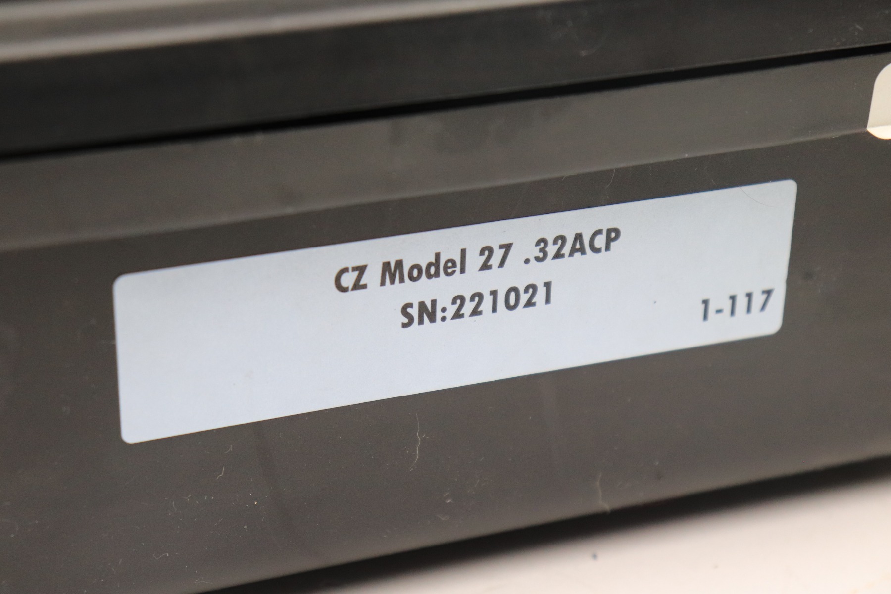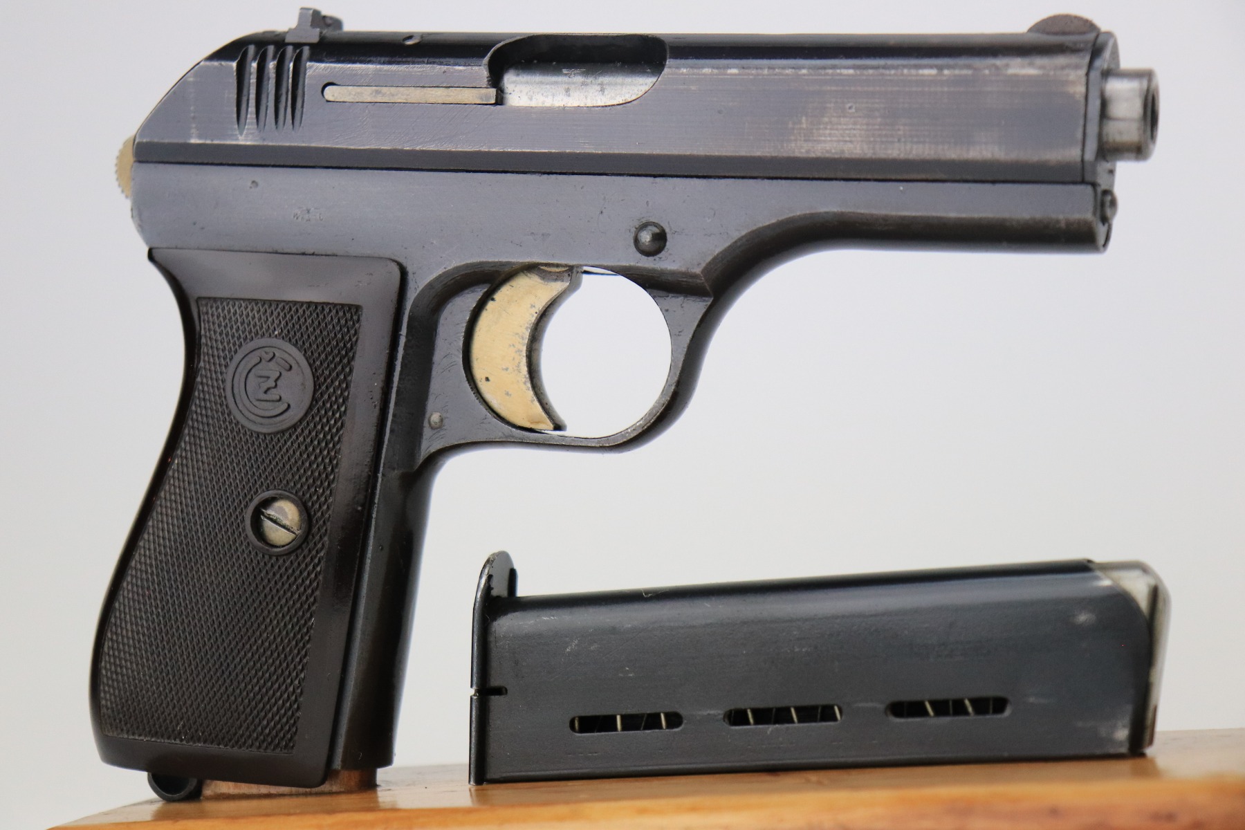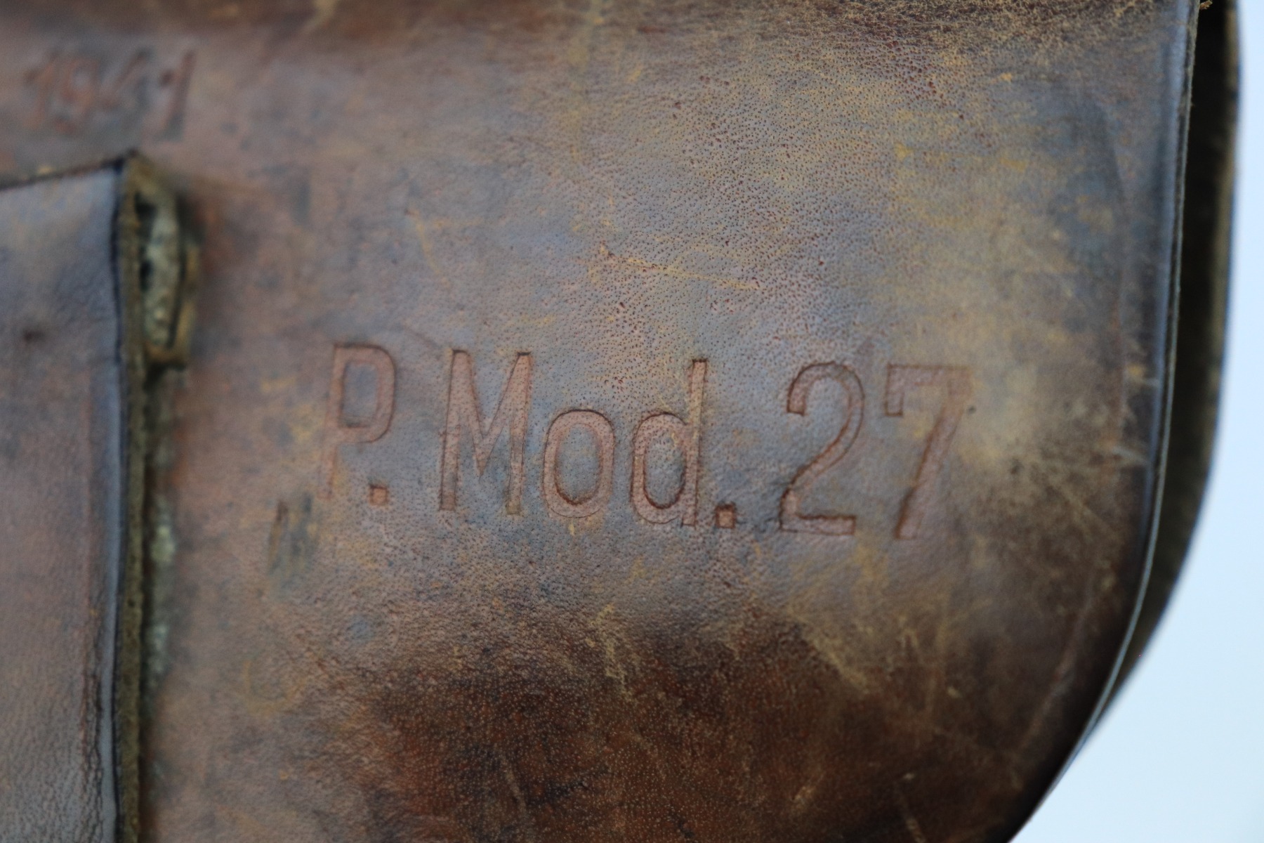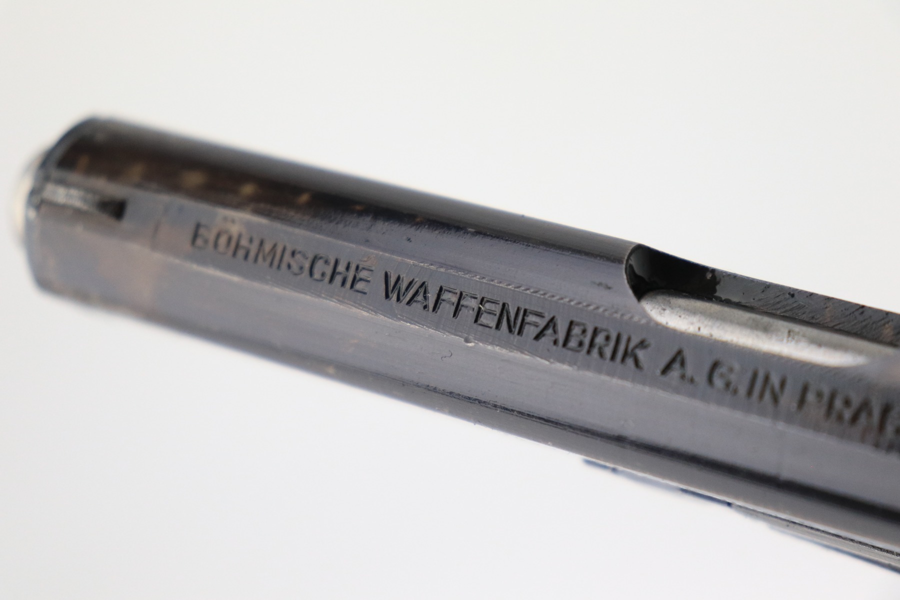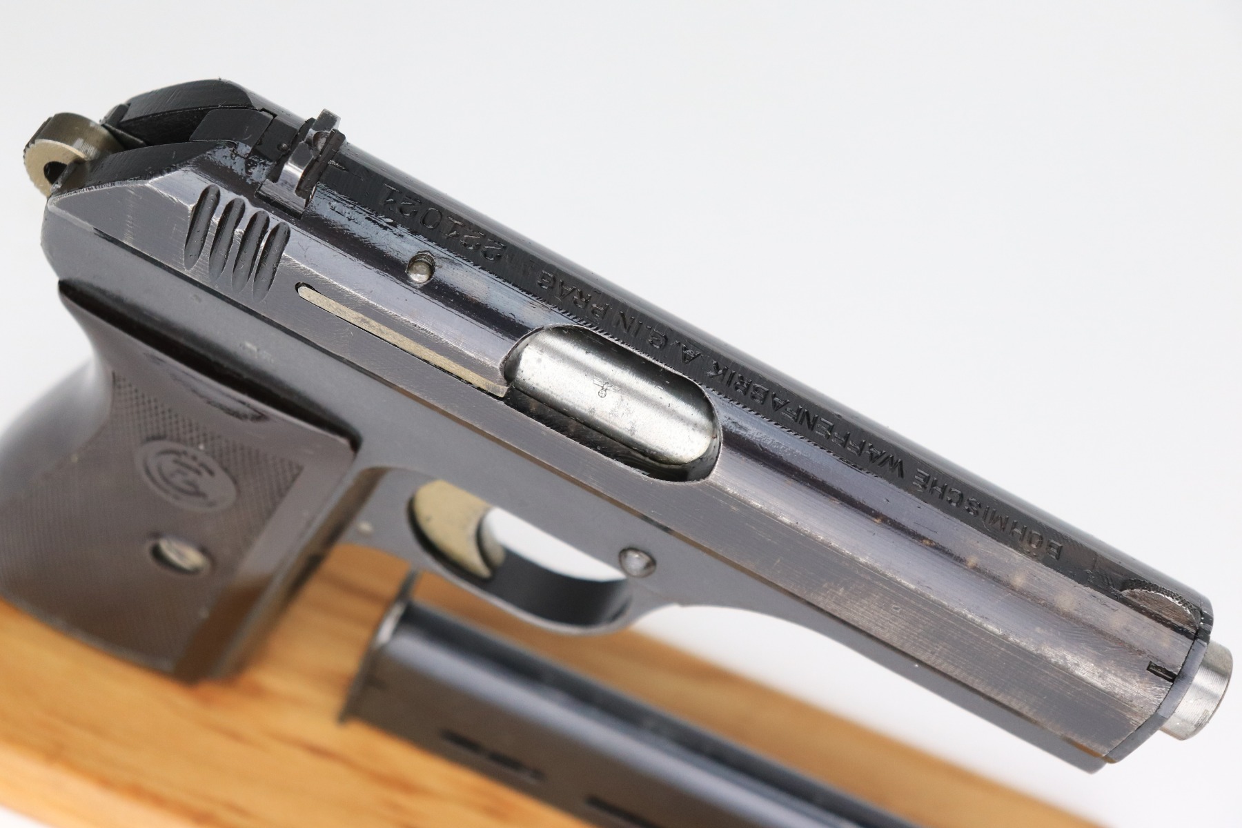 4/8/21 – This is a very nice example of a CZ Model 27 issued to the Nazi military during WW2. The gun is all matching and has the proper waffen military proof. The gun comes with a nice 1941-dated holster, three period-correct magazines, a spare reproduction grip, spare springs, and a Pelican-style hard case. There is a small hole in the top flap of the holster. The gun has retained about 92-93% of its military blue finish. Generally, there is minor wear around the muzzle and high edges of the slide. There are a few dots of wear on the top of the slide and thinning on the right side of the slide. Comes with a very nice grip that has a very small chip on the left side in the bottom corner. The bore is mint.