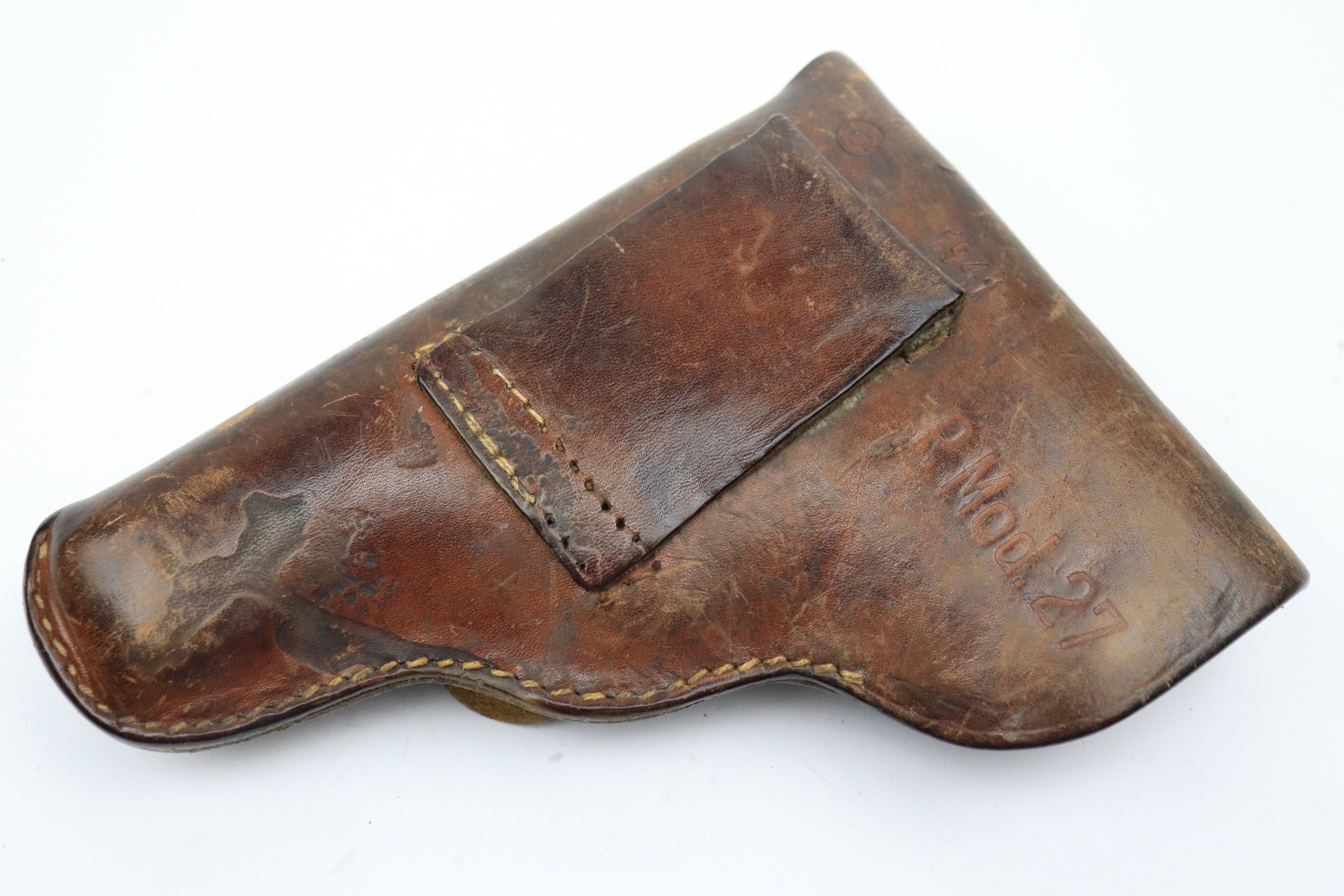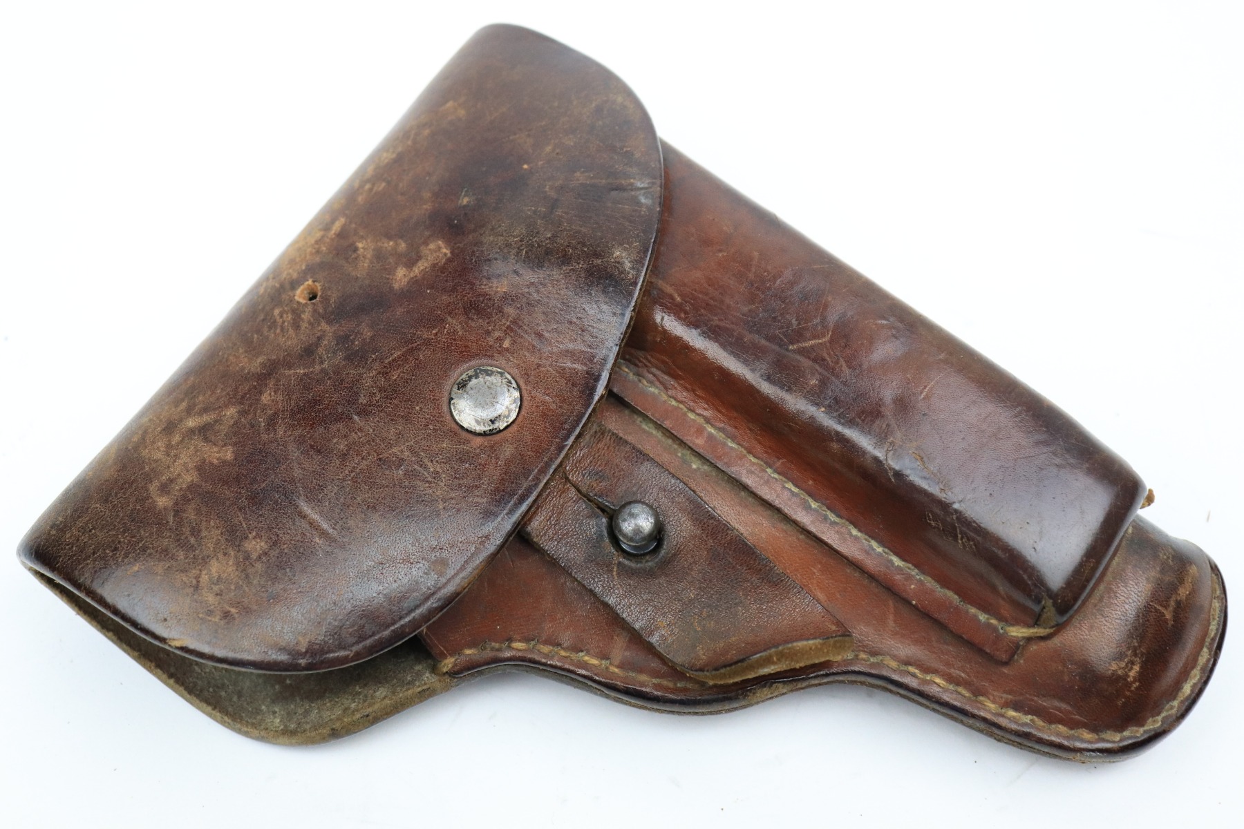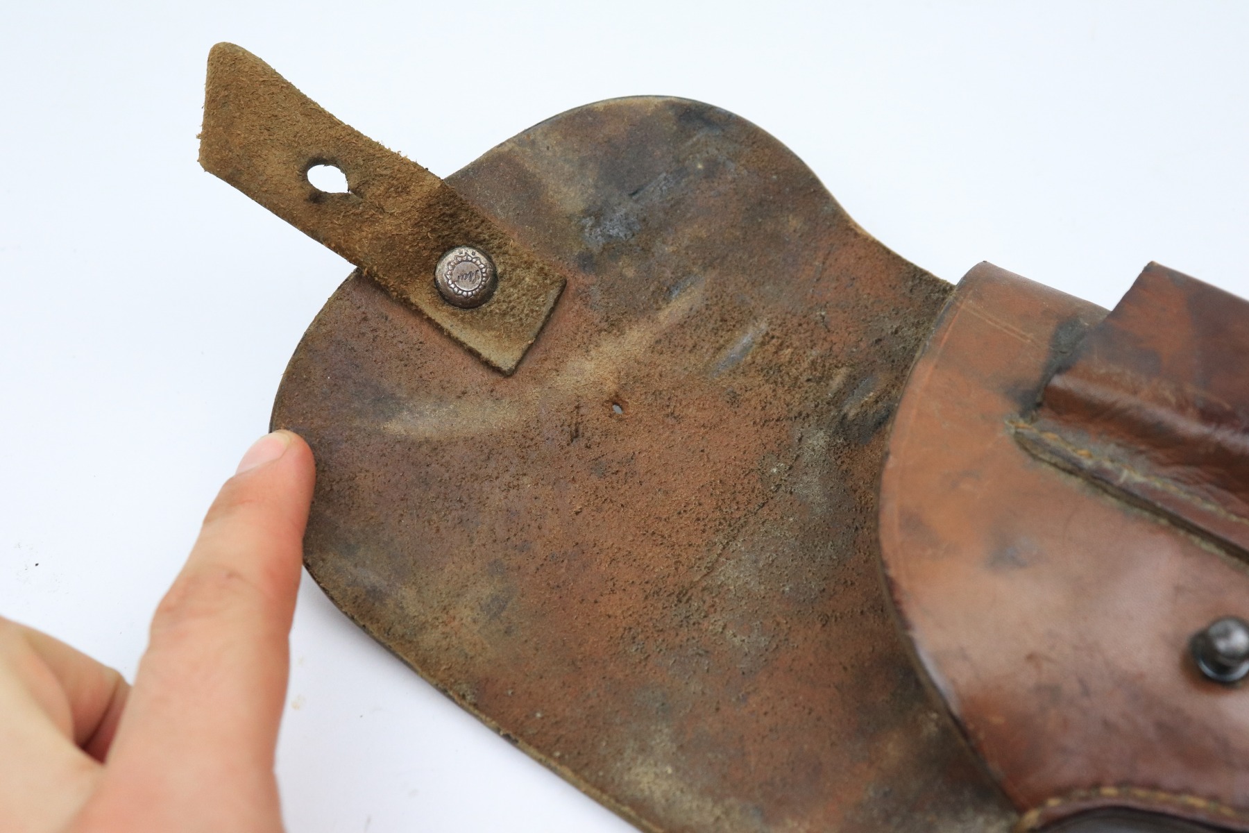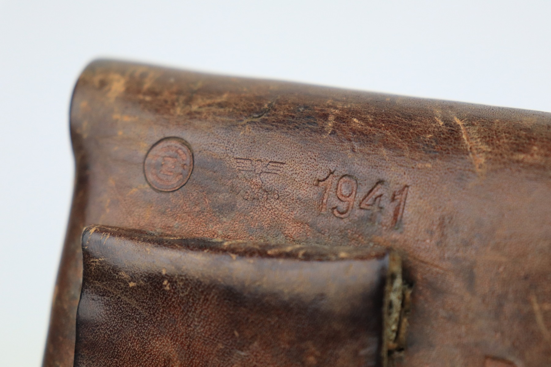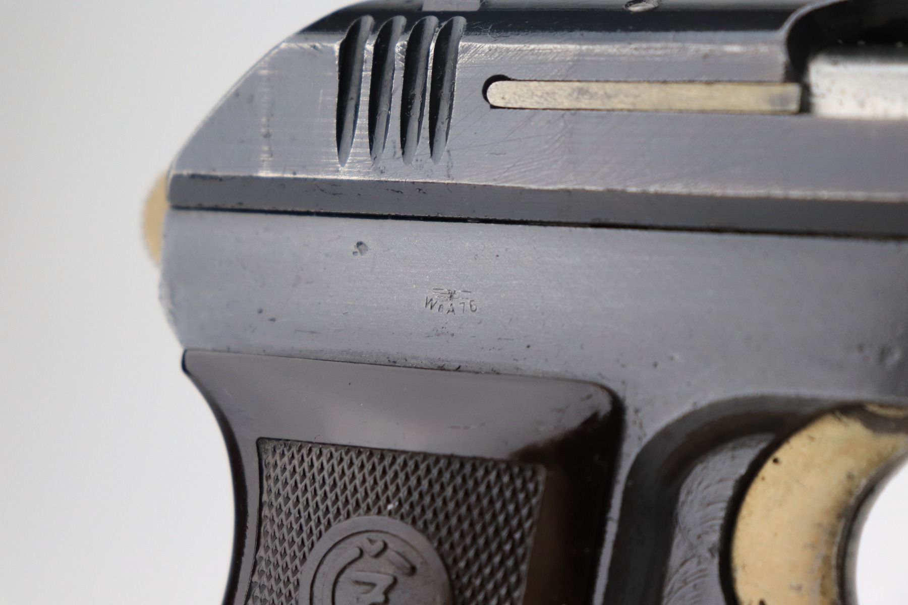 4/8/21 – This is a very nice example of a CZ Model 27 issued to the Nazi military during WW2. The gun is all matching and has the proper waffen military proof. The gun comes with a nice 1941-dated holster, three period-correct magazines, a spare reproduction grip, spare springs, and a Pelican-style hard case. There is a small hole in the top flap of the holster. The gun has retained about 92-93% of its military blue finish. Generally, there is minor wear around the muzzle and high edges of the slide. There are a few dots of wear on the top of the slide and thinning on the right side of the slide. Comes with a very nice grip that has a very small chip on the left side in the bottom corner. The bore is mint.