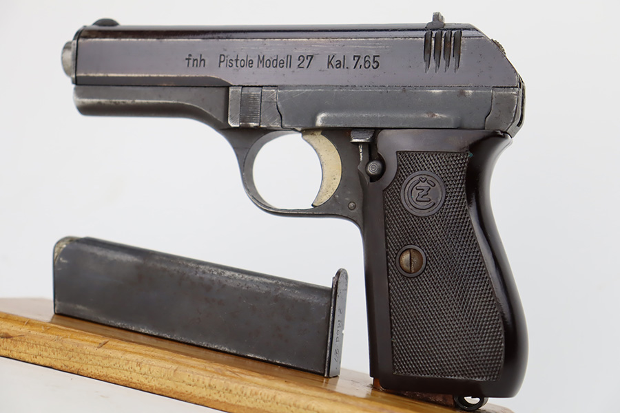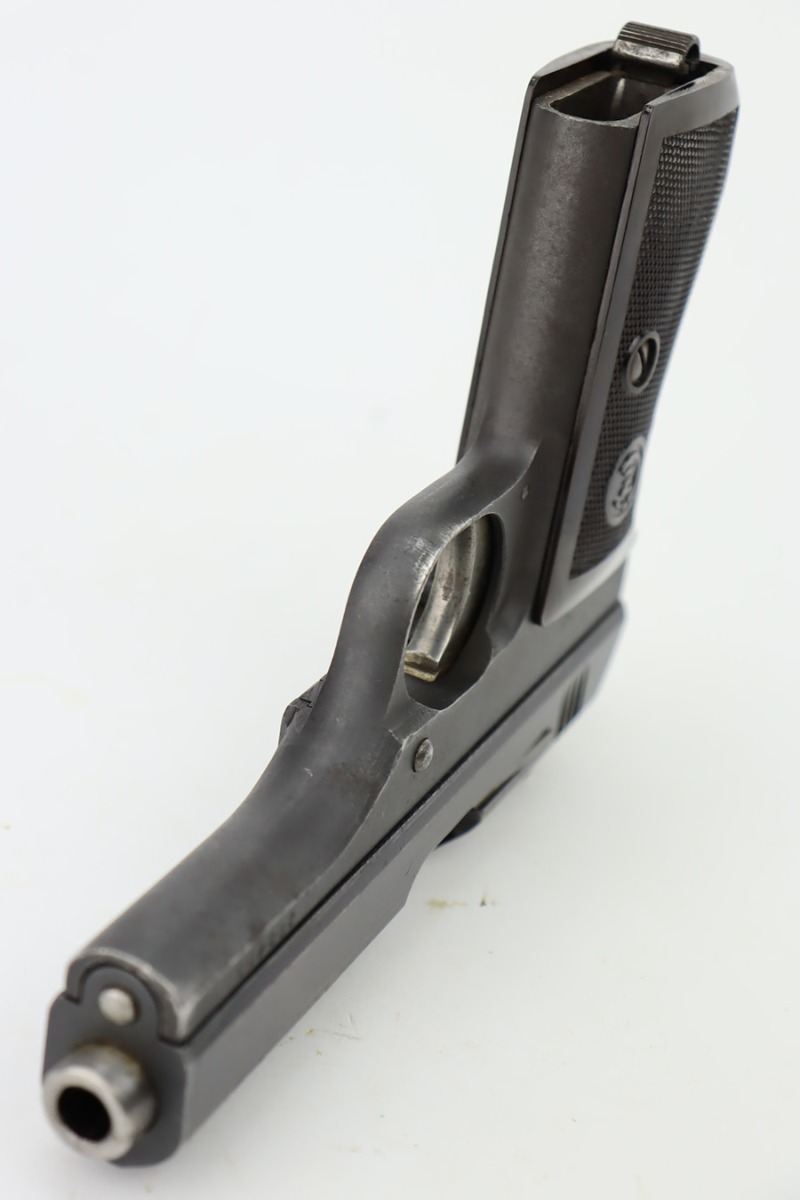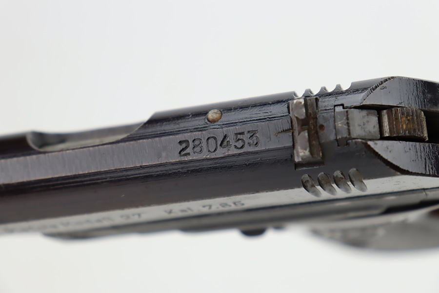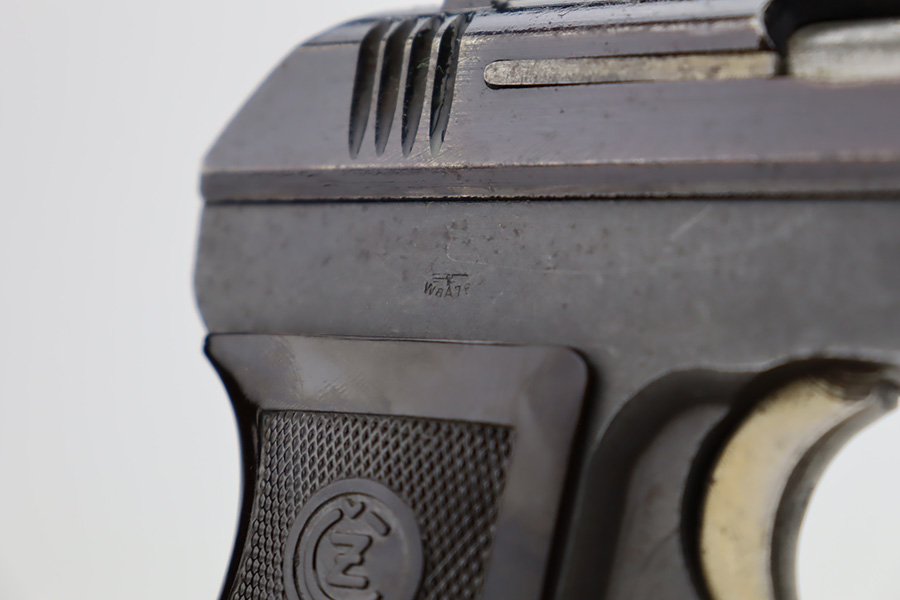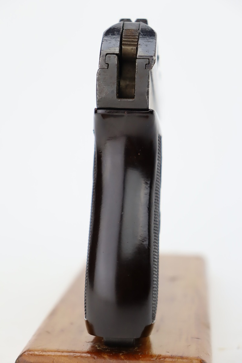 10/19/23 – This is a very nice example of a CZ Model 27 issued to the Nazi military during WW2. It is all matching with the proper “Waffen 76” military acceptance proof on the right side of the frame. It comes as a rig with one proper magazine and a very nice 1940-dated black leather holster. The gun has retained about 93% of its original wartime finish. There is minor wear around the high edges, an area of wear on the right side of the slide, and some areas of light freckling here and there. Fitted with an excellent bakelite grip – no cracks or chips. Mint bore.