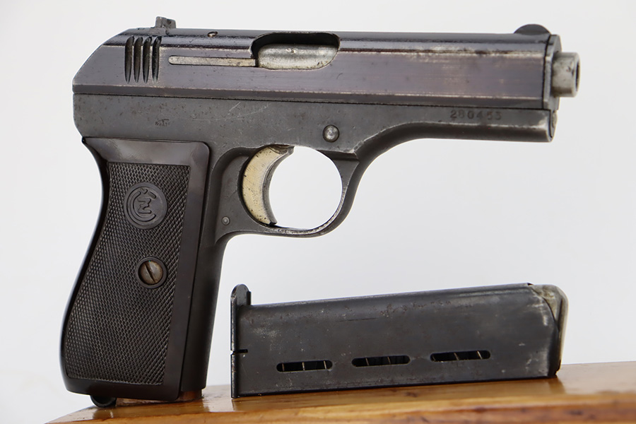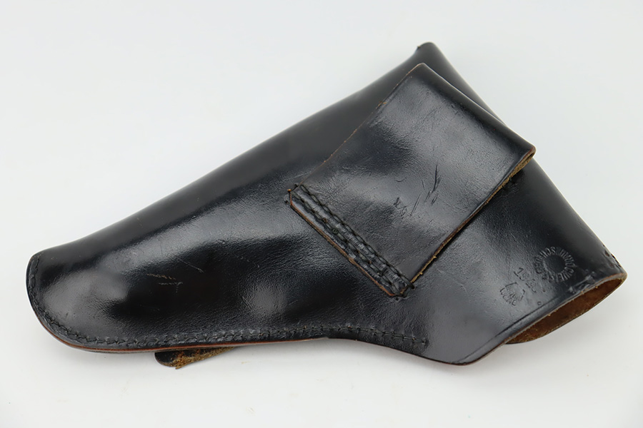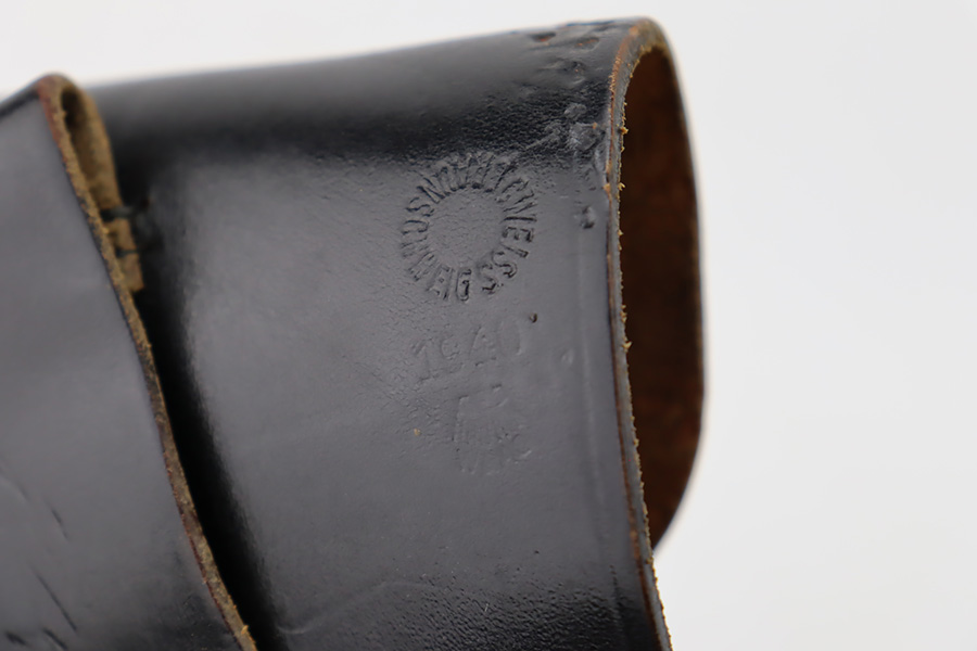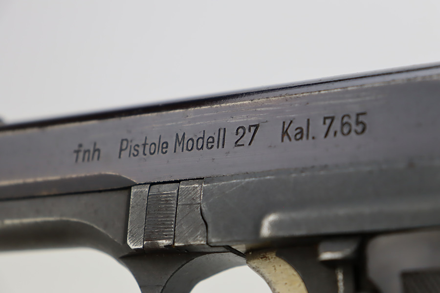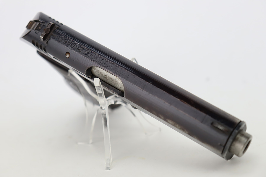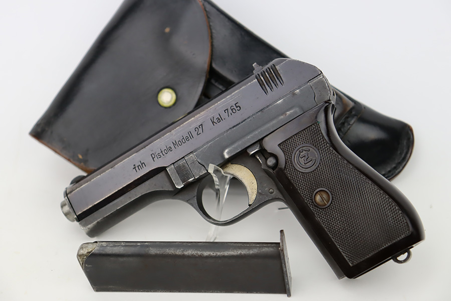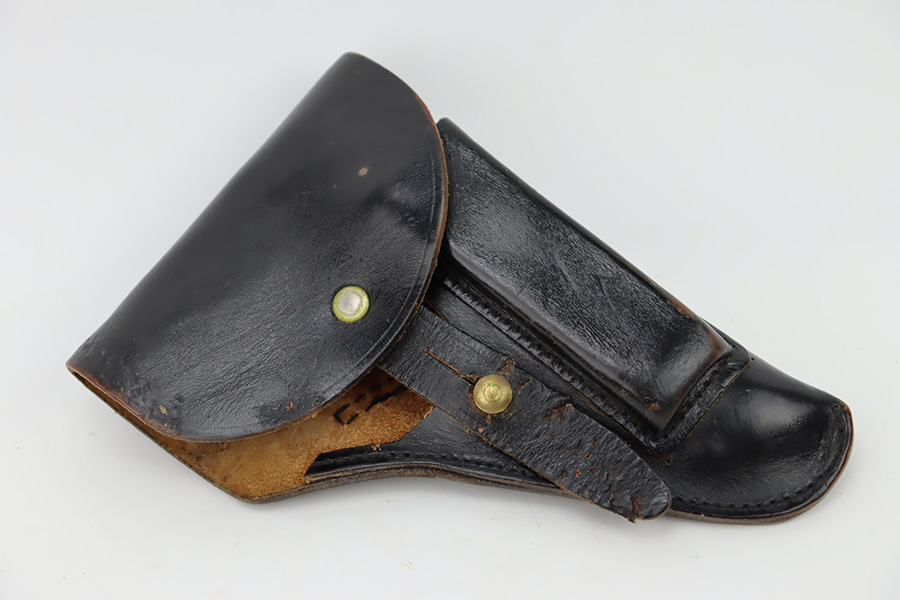 10/19/23 – This is a very nice example of a CZ Model 27 issued to the Nazi military during WW2. It is all matching with the proper “Waffen 76” military acceptance proof on the right side of the frame. It comes as a rig with one proper magazine and a very nice 1940-dated black leather holster. The gun has retained about 93% of its original wartime finish. There is minor wear around the high edges, an area of wear on the right side of the slide, and some areas of light freckling here and there. Fitted with an excellent bakelite grip – no cracks or chips. Mint bore.