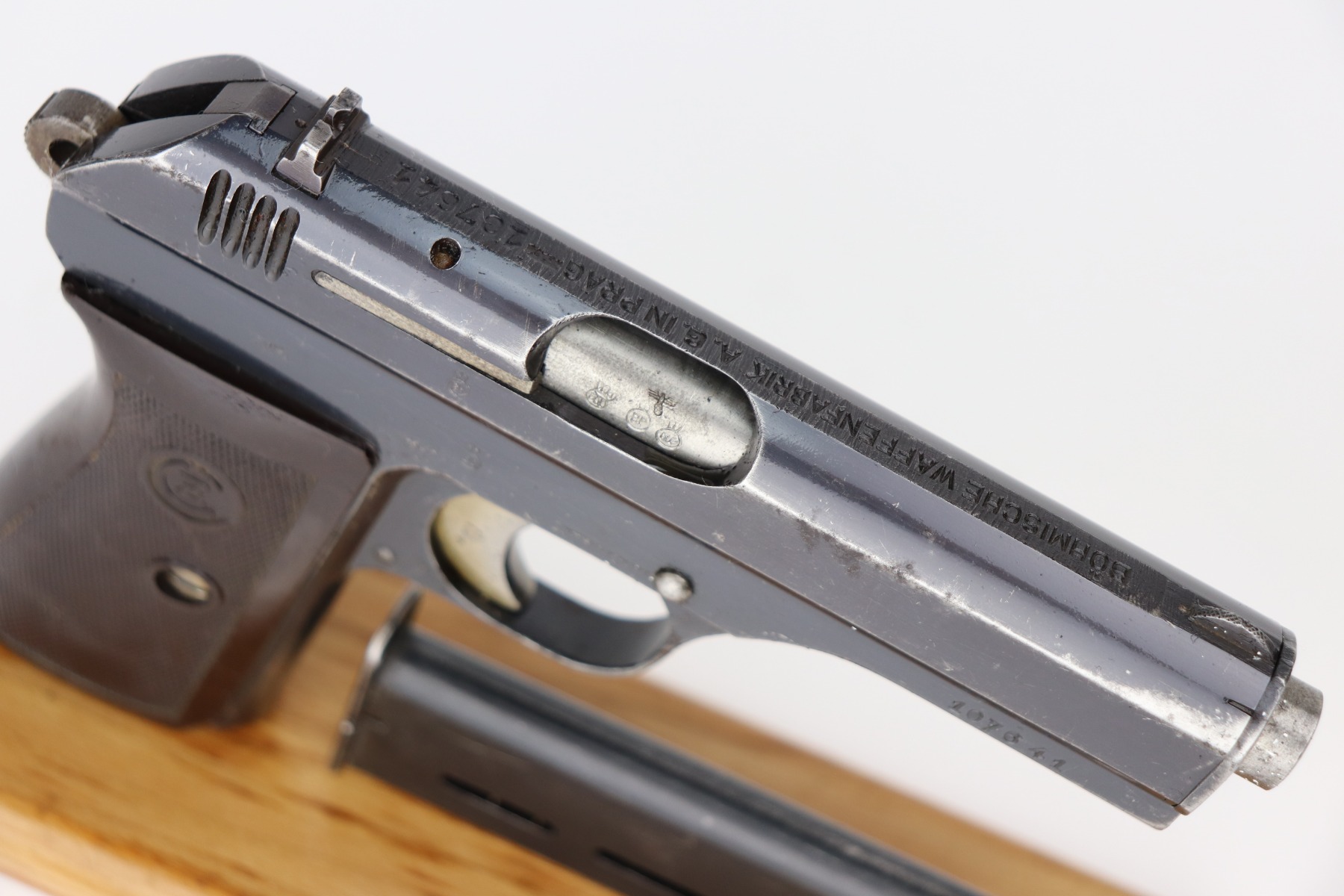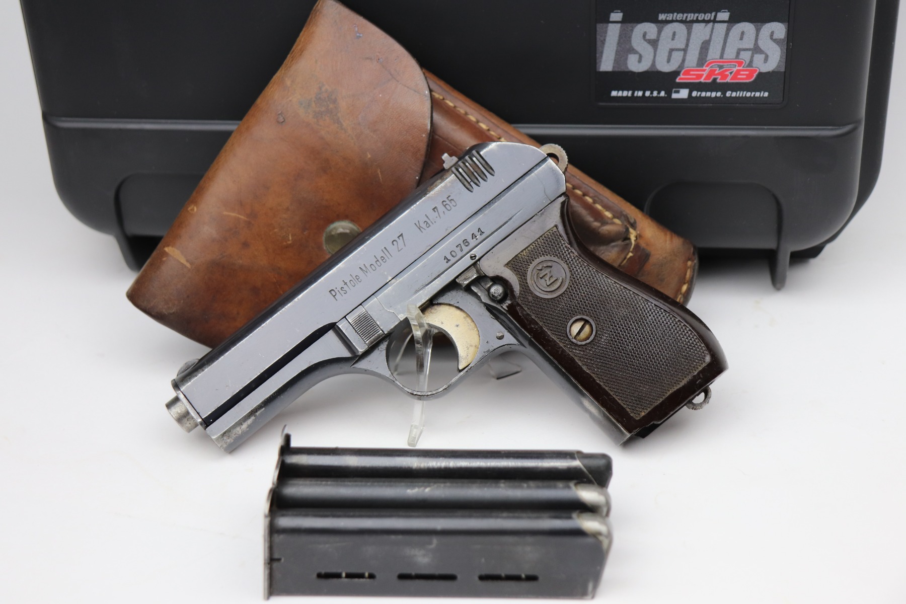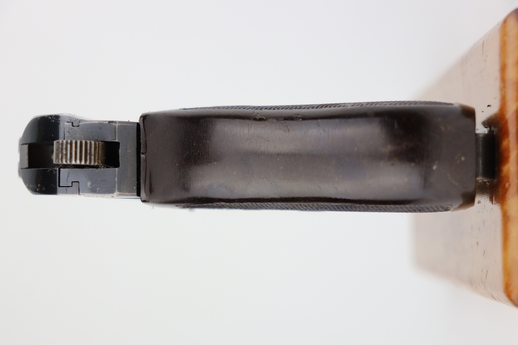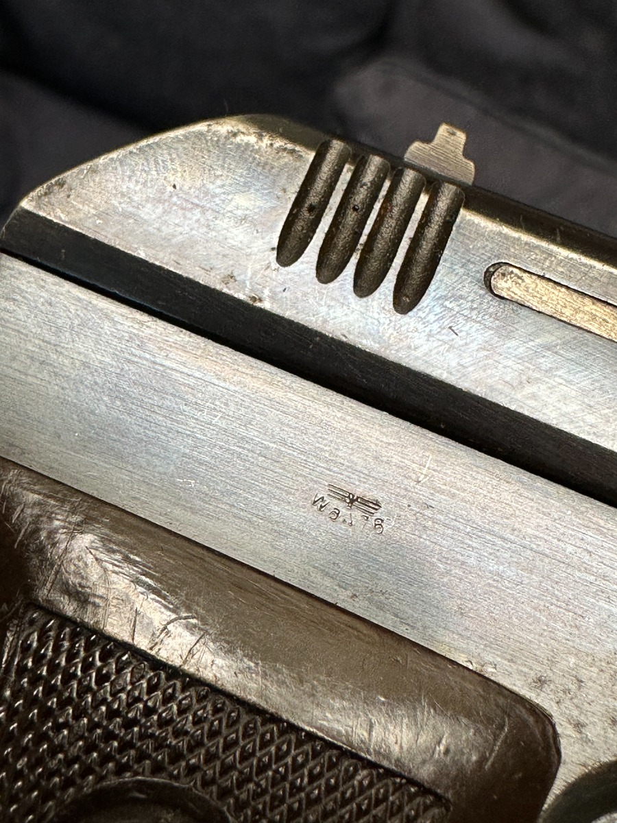 4/27/21 – This is a nice example of a CZ Model 27 rig issued to the Nazi military during WW2. The rig comes with a nice waffen-proofed holster, two period-correct magazines, one post-war magazine, two sets of spare springs, and a really nice Pelican-style hard case. The gun is all matching and has the proper “Waffen 76” military proof. It also has British proofs on the frame, slide, and barrel on the right side of the gun. It has retained roughly 75% of its original high polish bluing. There is noticeable wear on the front strap, underside of the trigger guard, and underside of the frame near the muzzle. There is spotty wear and oxidation along both sides of the slide concentrated near the high edges. Comes with a nice grip that has small chips in the bottom corners. The bore is near-mint.