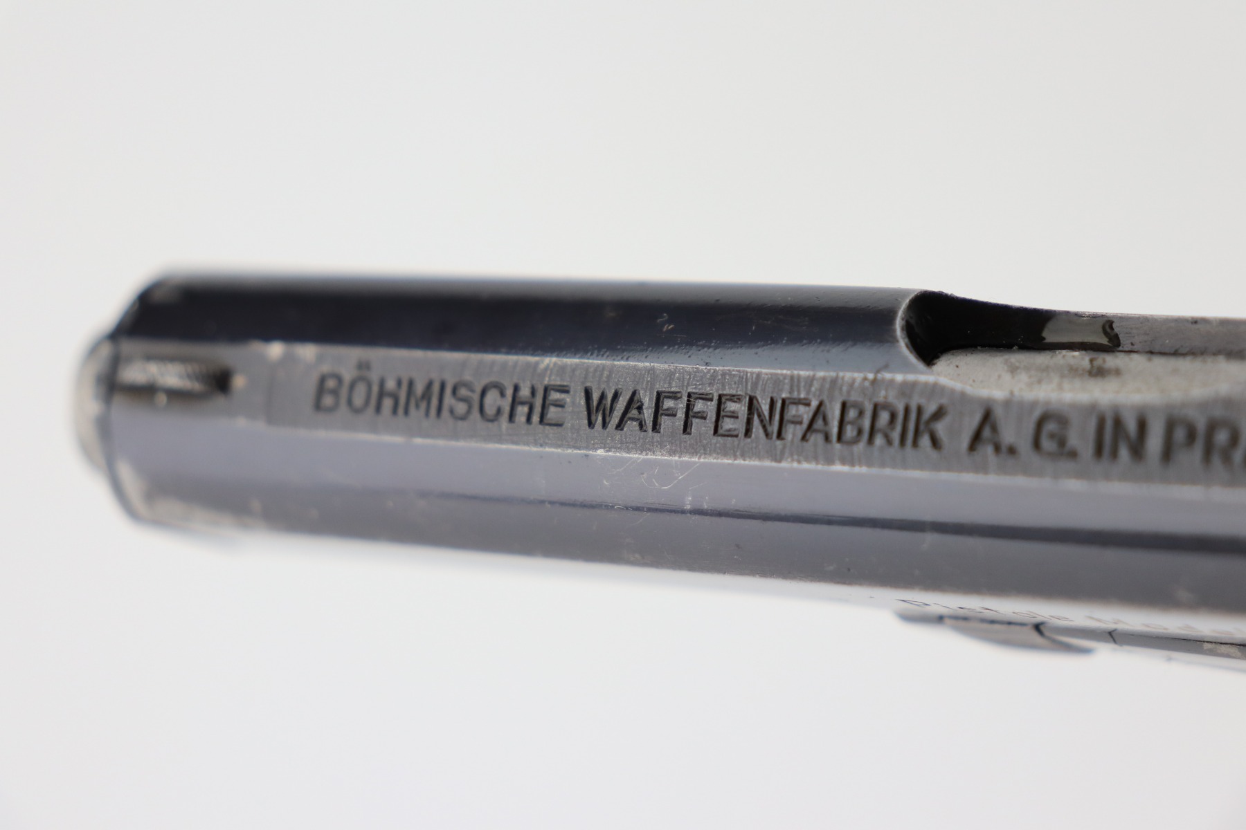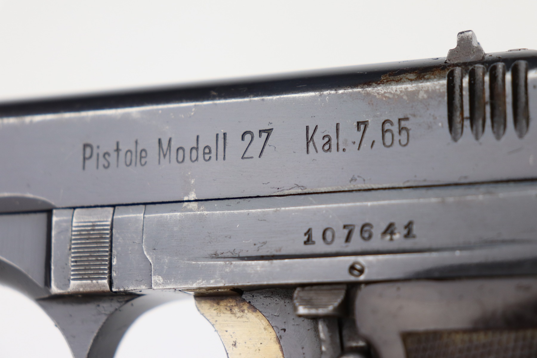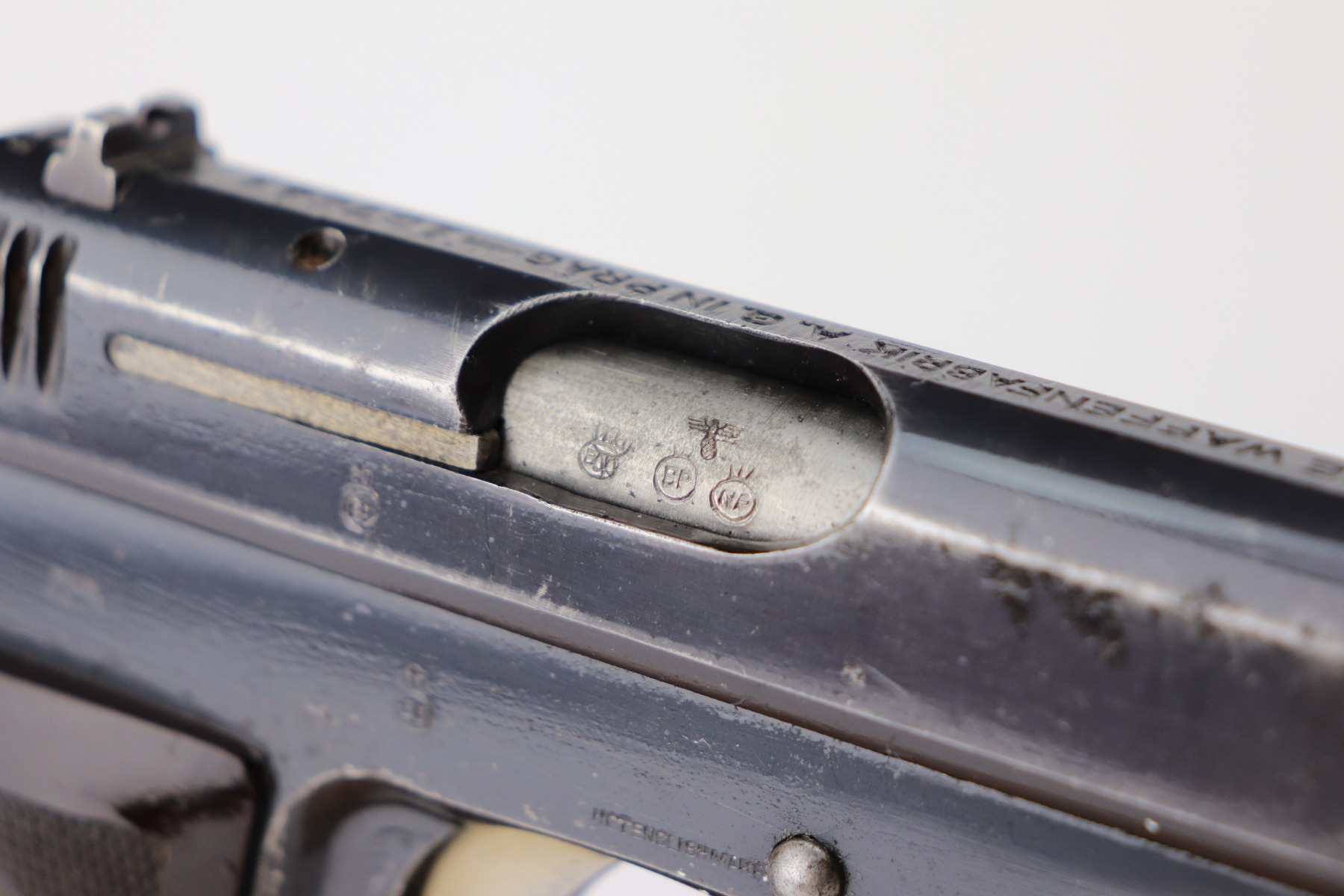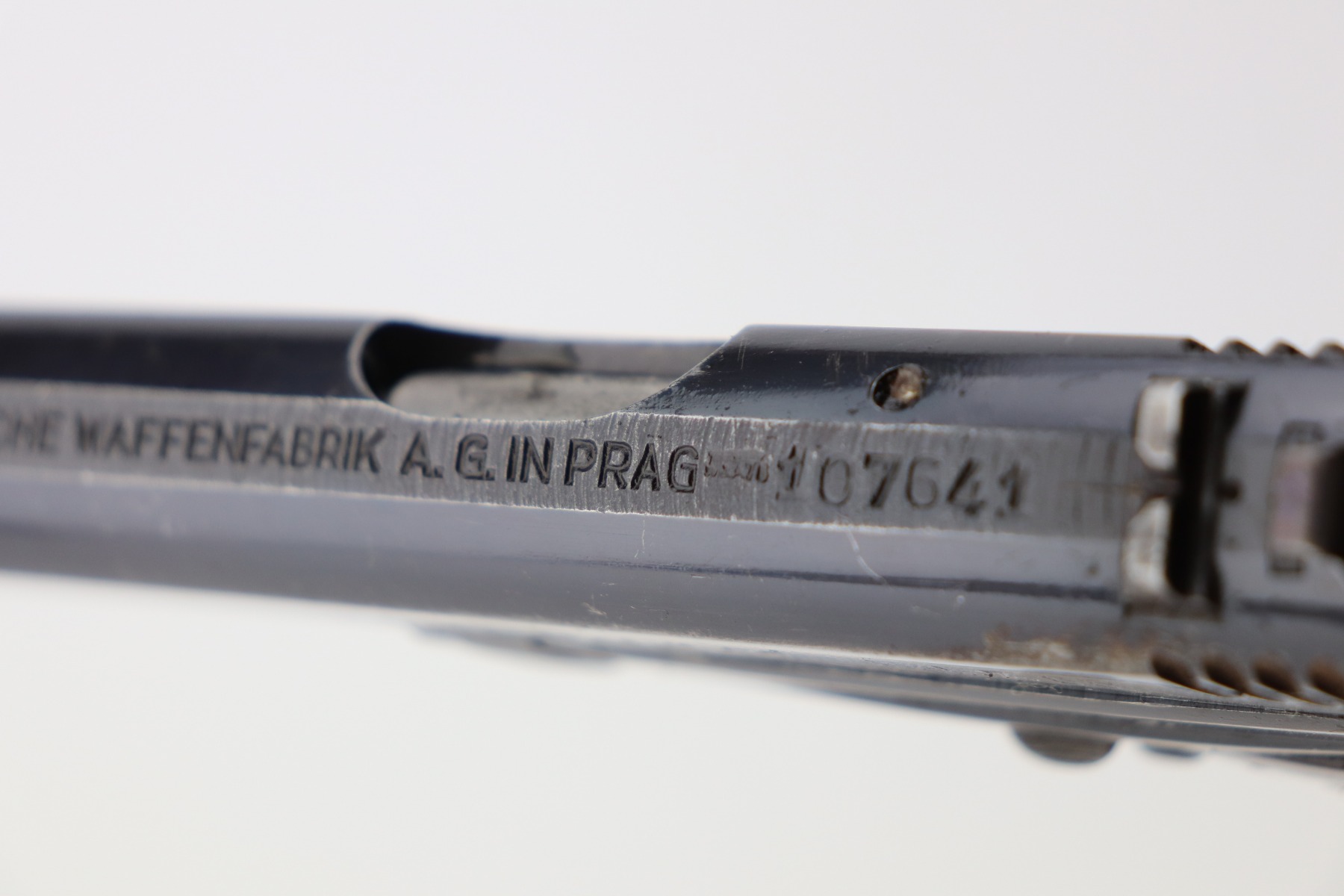 4/27/21 – This is a nice example of a CZ Model 27 rig issued to the Nazi military during WW2. The rig comes with a nice waffen-proofed holster, two period-correct magazines, one post-war magazine, two sets of spare springs, and a really nice Pelican-style hard case. The gun is all matching and has the proper “Waffen 76” military proof. It also has British proofs on the frame, slide, and barrel on the right side of the gun. It has retained roughly 75% of its original high polish bluing. There is noticeable wear on the front strap, underside of the trigger guard, and underside of the frame near the muzzle. There is spotty wear and oxidation along both sides of the slide concentrated near the high edges. Comes with a nice grip that has small chips in the bottom corners. The bore is near-mint.
