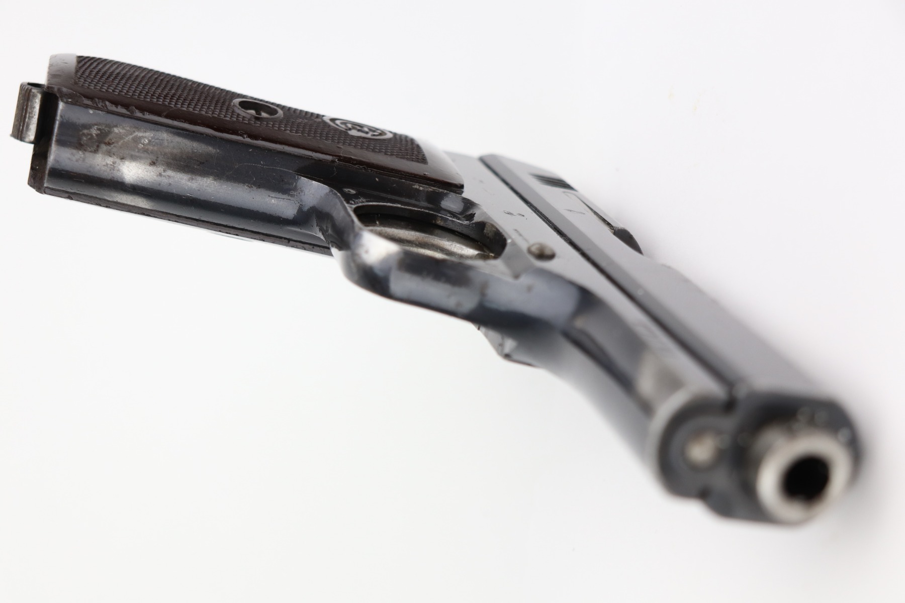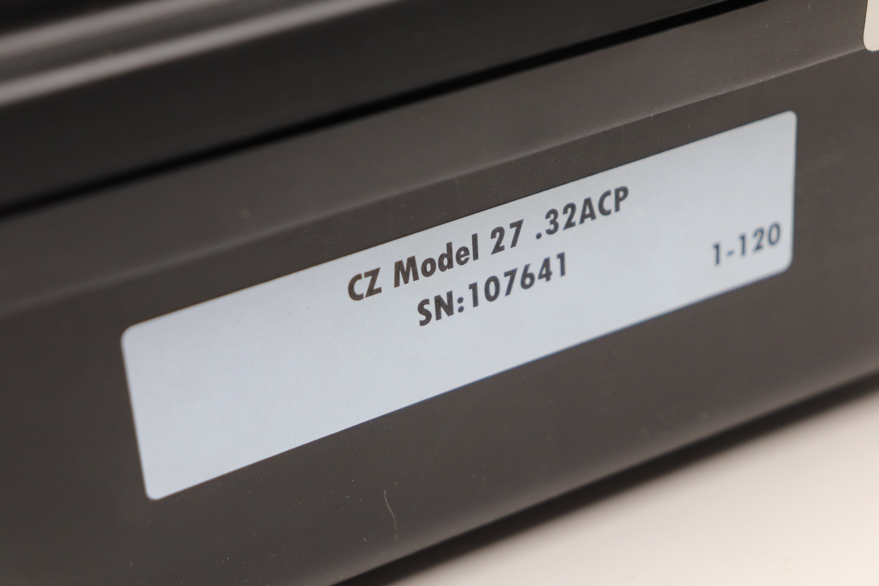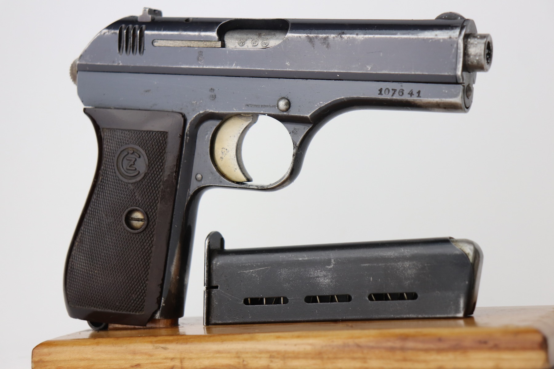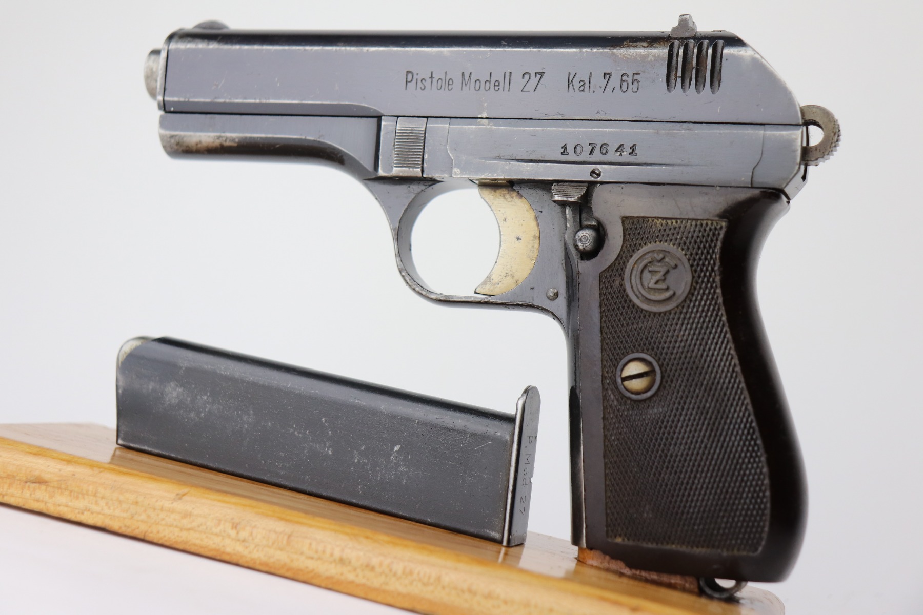 4/27/21 – This is a nice example of a CZ Model 27 rig issued to the Nazi military during WW2. The rig comes with a nice waffen-proofed holster, two period-correct magazines, one post-war magazine, two sets of spare springs, and a really nice Pelican-style hard case. The gun is all matching and has the proper “Waffen 76” military proof. It also has British proofs on the frame, slide, and barrel on the right side of the gun. It has retained roughly 75% of its original high polish bluing. There is noticeable wear on the front strap, underside of the trigger guard, and underside of the frame near the muzzle. There is spotty wear and oxidation along both sides of the slide concentrated near the high edges. Comes with a nice grip that has small chips in the bottom corners. The bore is near-mint.