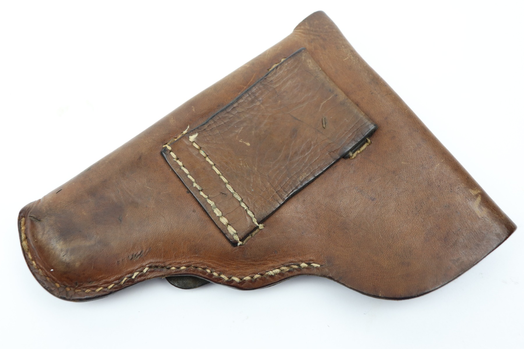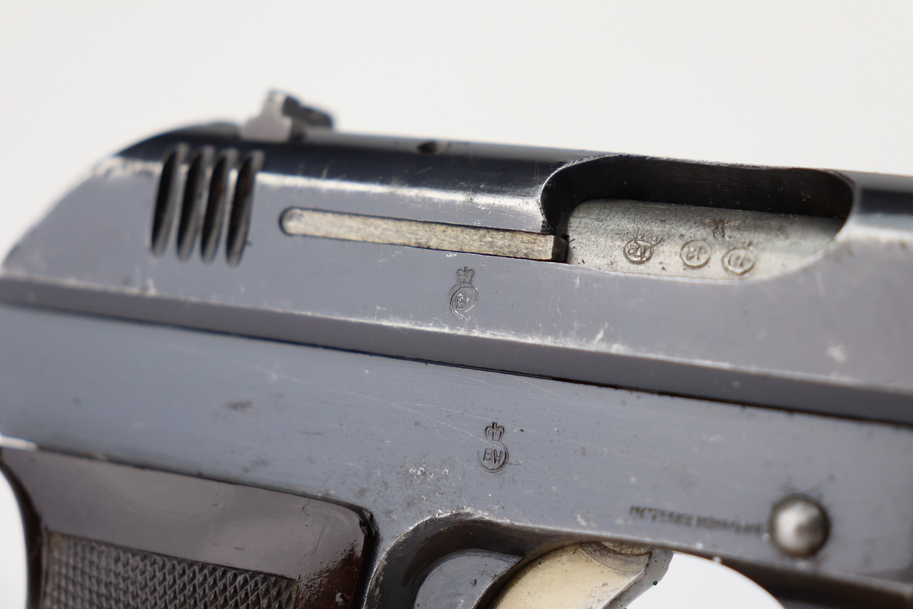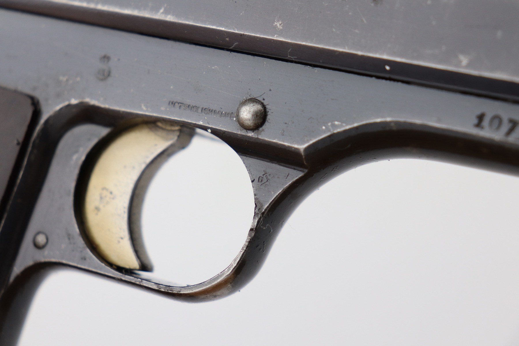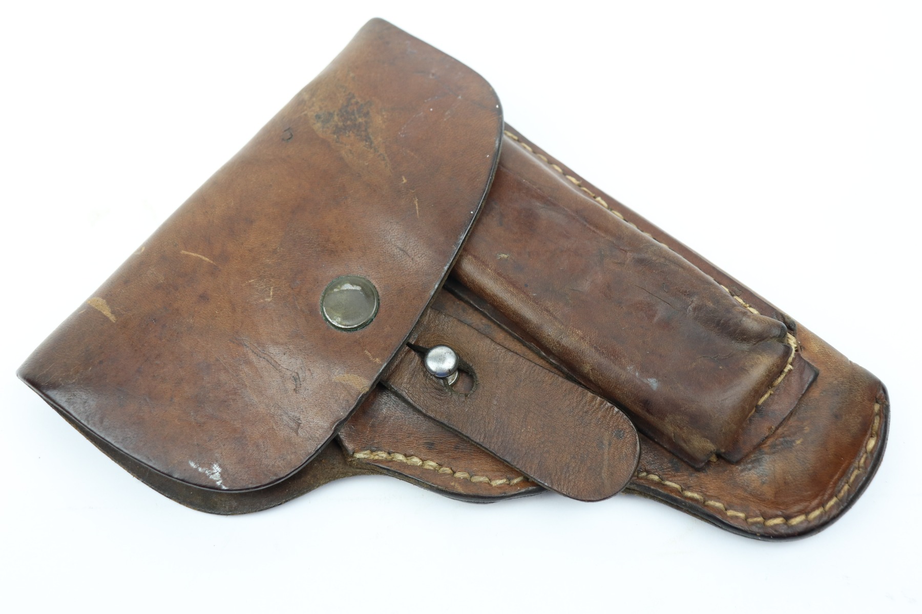 4/27/21 – This is a nice example of a CZ Model 27 rig issued to the Nazi military during WW2. The rig comes with a nice waffen-proofed holster, two period-correct magazines, one post-war magazine, two sets of spare springs, and a really nice Pelican-style hard case. The gun is all matching and has the proper “Waffen 76” military proof. It also has British proofs on the frame, slide, and barrel on the right side of the gun. It has retained roughly 75% of its original high polish bluing. There is noticeable wear on the front strap, underside of the trigger guard, and underside of the frame near the muzzle. There is spotty wear and oxidation along both sides of the slide concentrated near the high edges. Comes with a nice grip that has small chips in the bottom corners. The bore is near-mint.